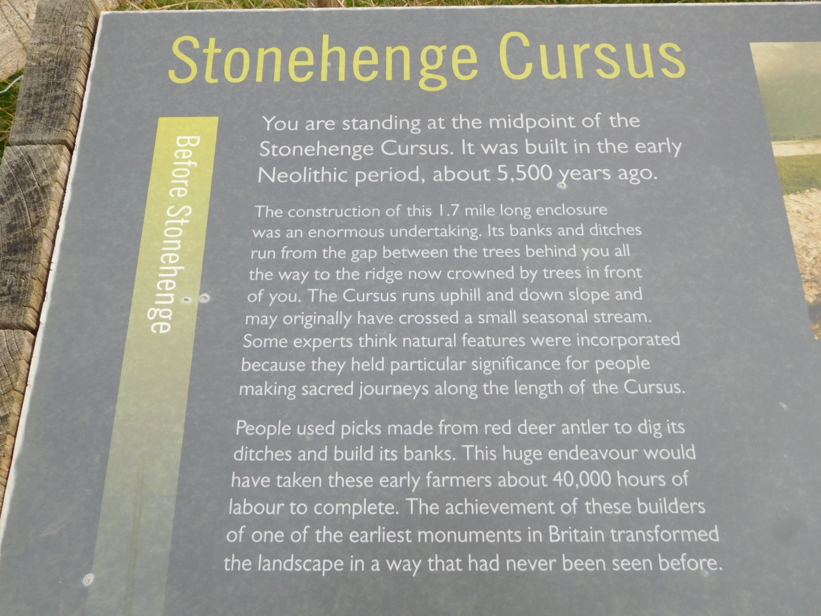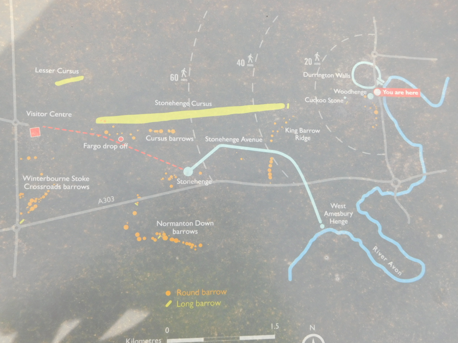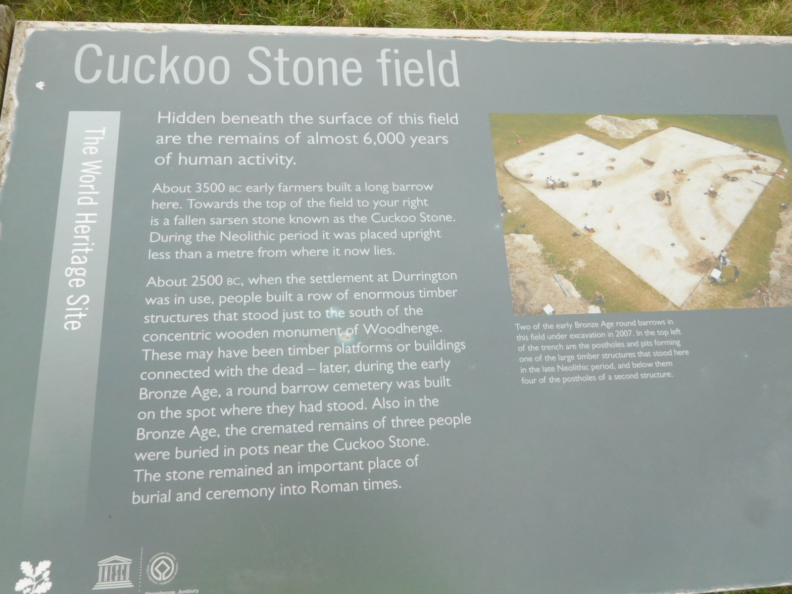 The part that really blew me away was numerous poster boards showing many neolithic features of the landscape all around us as we stood near Woodhenge and were about to go search for the "Cuckoo Stone" and Stonehenge. Here below is one of them. See all the round and long barrows (burial mounds), the Cuckoo Stone, the Durrington Walls, and the Stonehenge Cursus - a dugout field sort of pointing to Stonehenge?