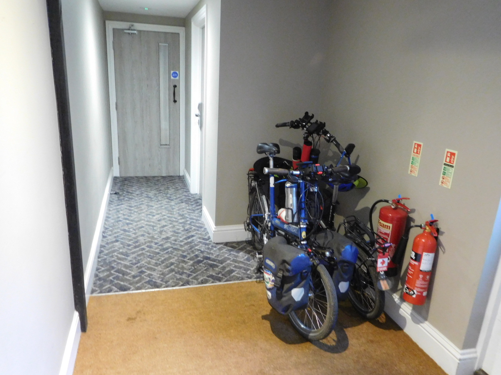 Let's back up to Steve waking up, and pulling that Youtube out of his ear. We were in a really super hotel called the The Merchant's House. What we liked so much was firstly that the bikes had a safe and warm inside hallway to rest in. And we had a super rarity in England, a ground floor room that not only was not up stairs but our door opened directly to the outside. We could go out and check on our bag of food cooling outside, or go through an easy door and visit the bikes, or importantly, pull them out and load them without involving any staff.