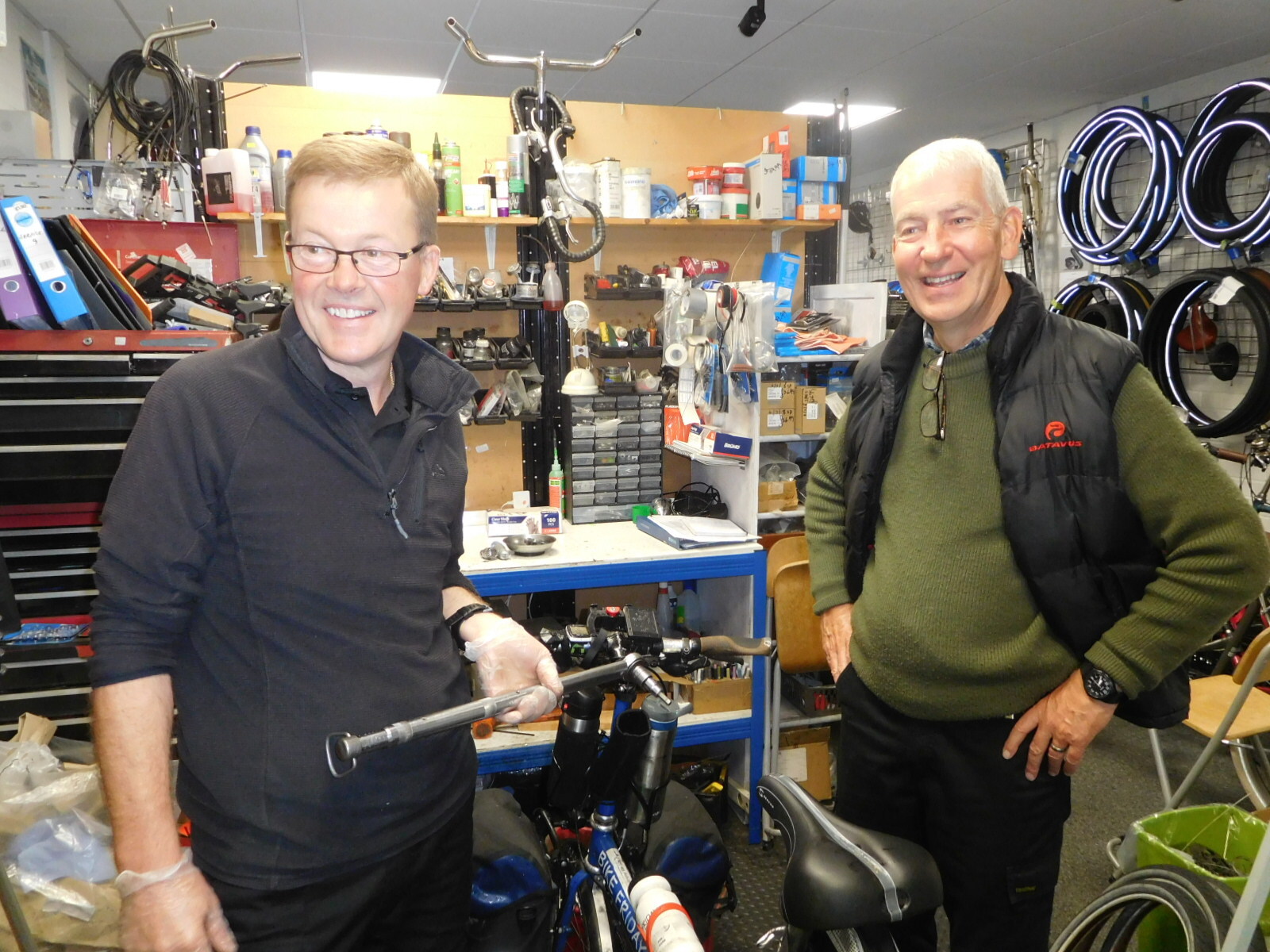 The labour charge for these services, which including having to chat with us ate up an hour and a half, was zero. Paul and his partner Brian are cycle tourists too, and say they enjoy helping out fellow travelers. Well, at least we contributed to the shop by having bought two complete sets of brake pads!