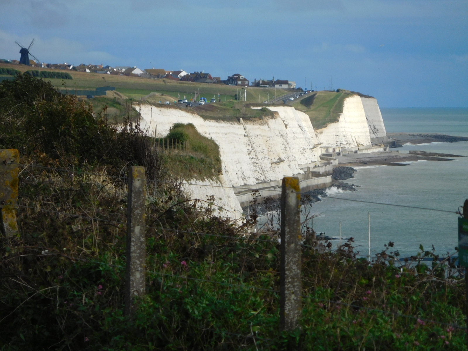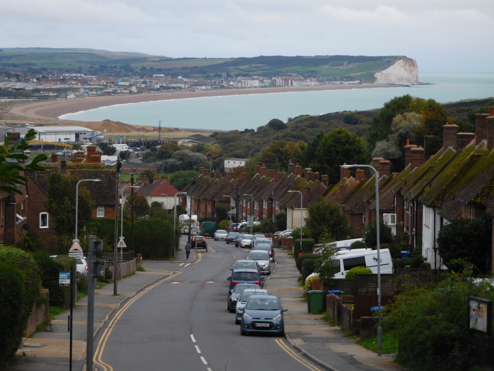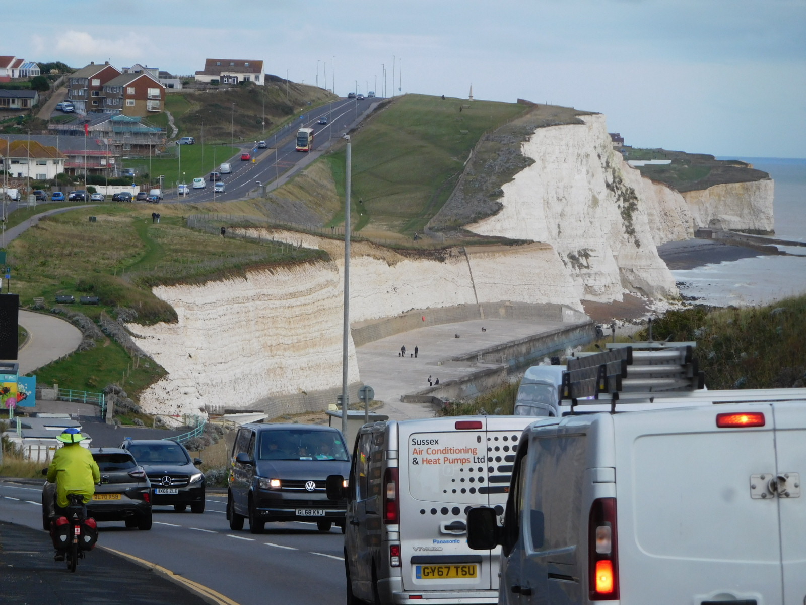 We had had some optimistic ideas about zooming to Newhaven, incorporating them into schemes to get on the ferry and out of England really fast. But England was not done with us yet. It turns out that from Brighton to Newhaven it is a picture of (sure, lovely) white cliffs to climb and descend and climb. With no e-assist and a heavy load, this was a matter of crank crank in lowest gear for me, much of the time. England also provided a background of heavy traffic, to give us a headache and prevent crossing the road when needed as sidewalks disappeared.