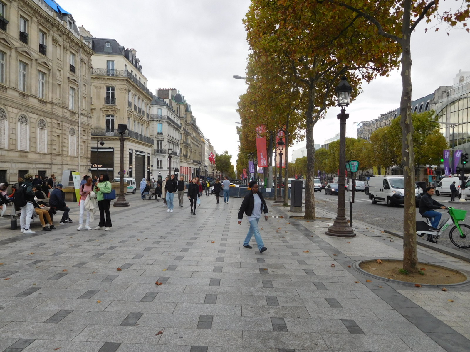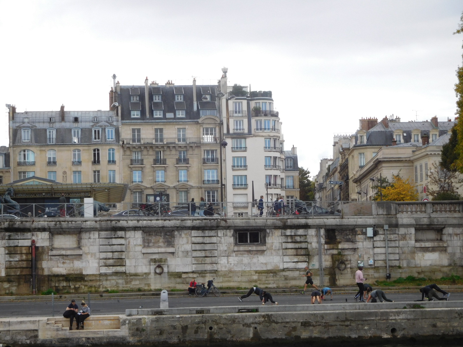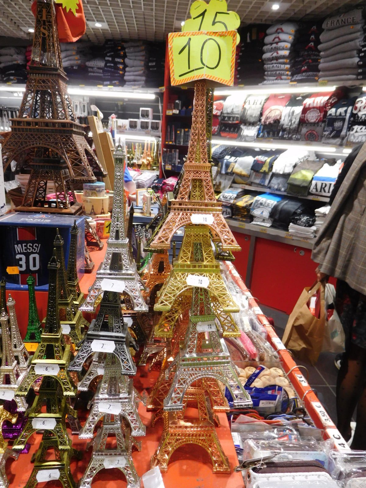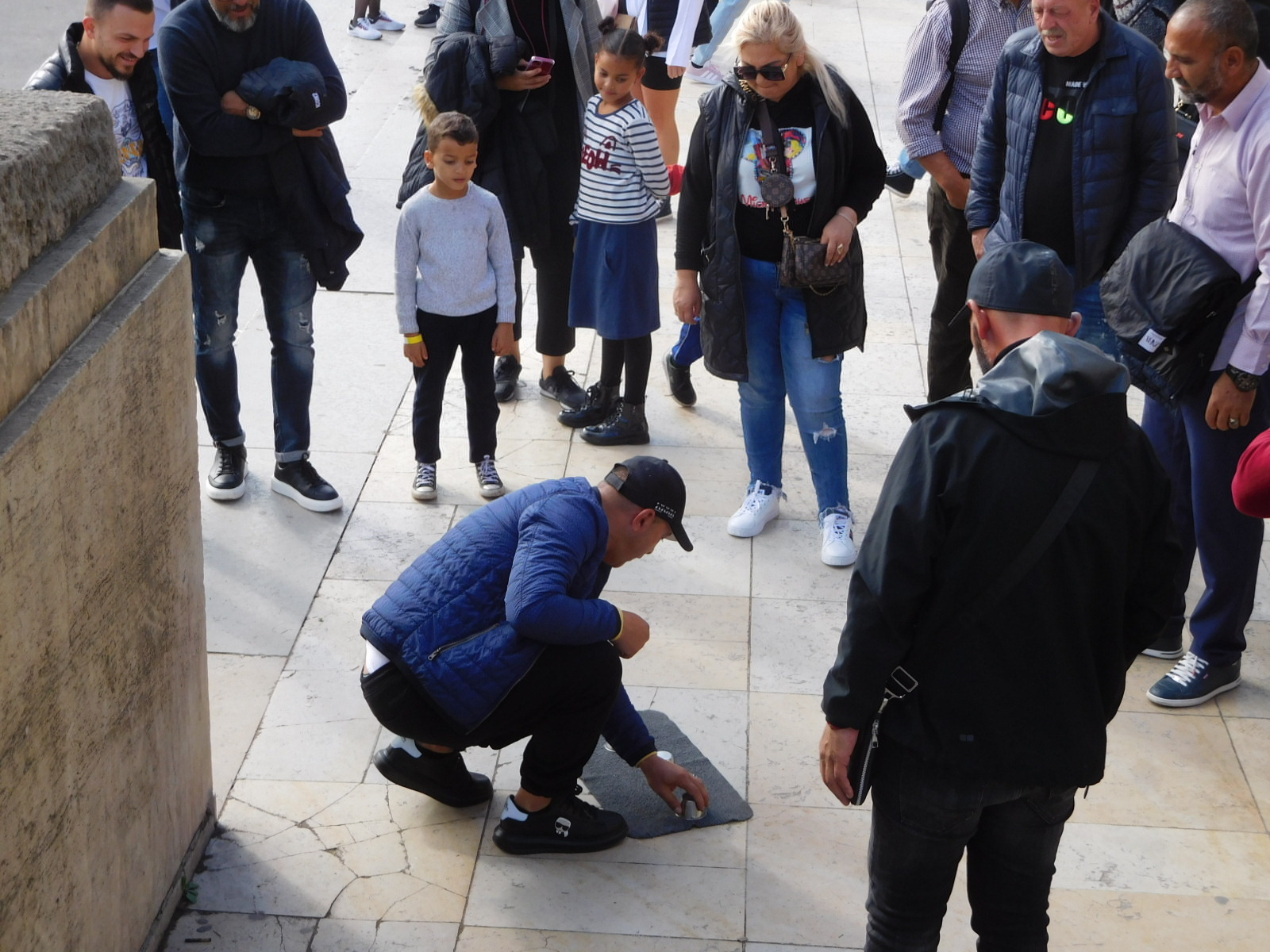 Once off the boat we had to walk back through the Trocadero to catch a Metro to our next fun location. On that walk we could again watch the antics of the trinket sellers, who array their wares on cloths on the ground with grab handles, in case they need to close shop really fast. Another cloth on the ground based activity was the (old) shell game. We watched as one spectator seemed able to guess the location of the moving ball quite well, and got some payouts. But Dodie identified this one as a shill, whose jog it was to get suckers like me to think they had a chance. I got chased away when I tried to photograph the action. Too bad, because a slo-mo video of what was happening would have been fun. Yesterday we witnessed a really fast grab handle getaway from one of these shell games, as police approached.