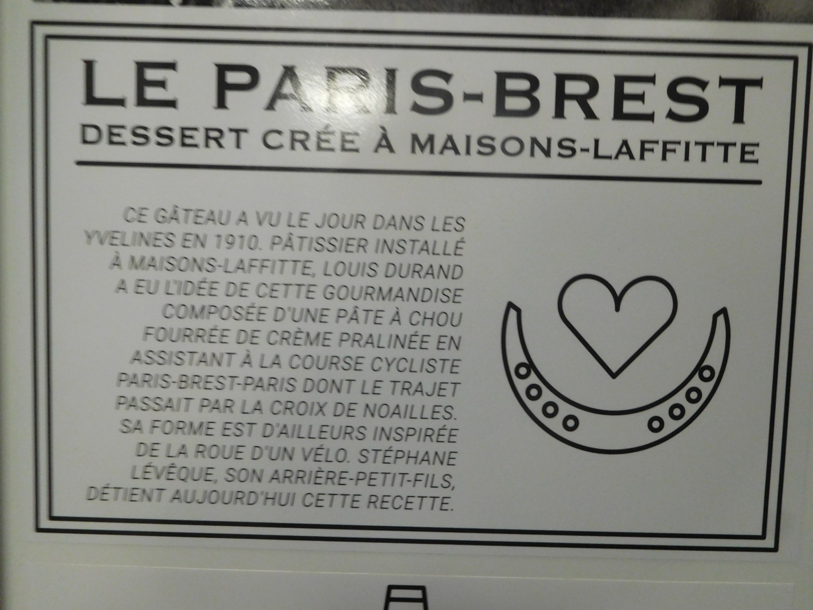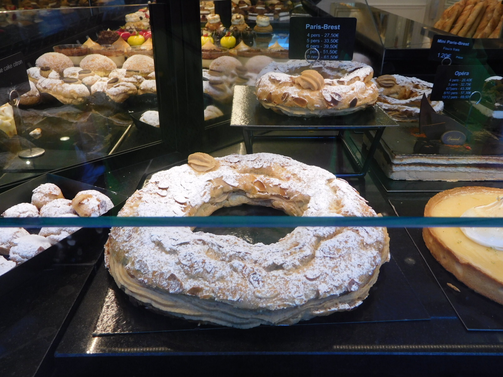 For example, there are a number of pastry shops to look in, including one made famous by the invention of the "Paris-Brest" type eclair by the owner's grandfather. The story of this is well known and can even be found on a wall poster at our hotel: