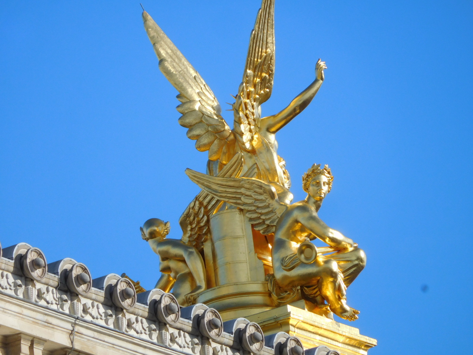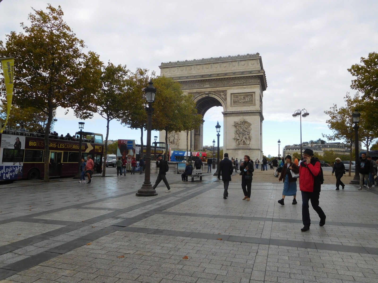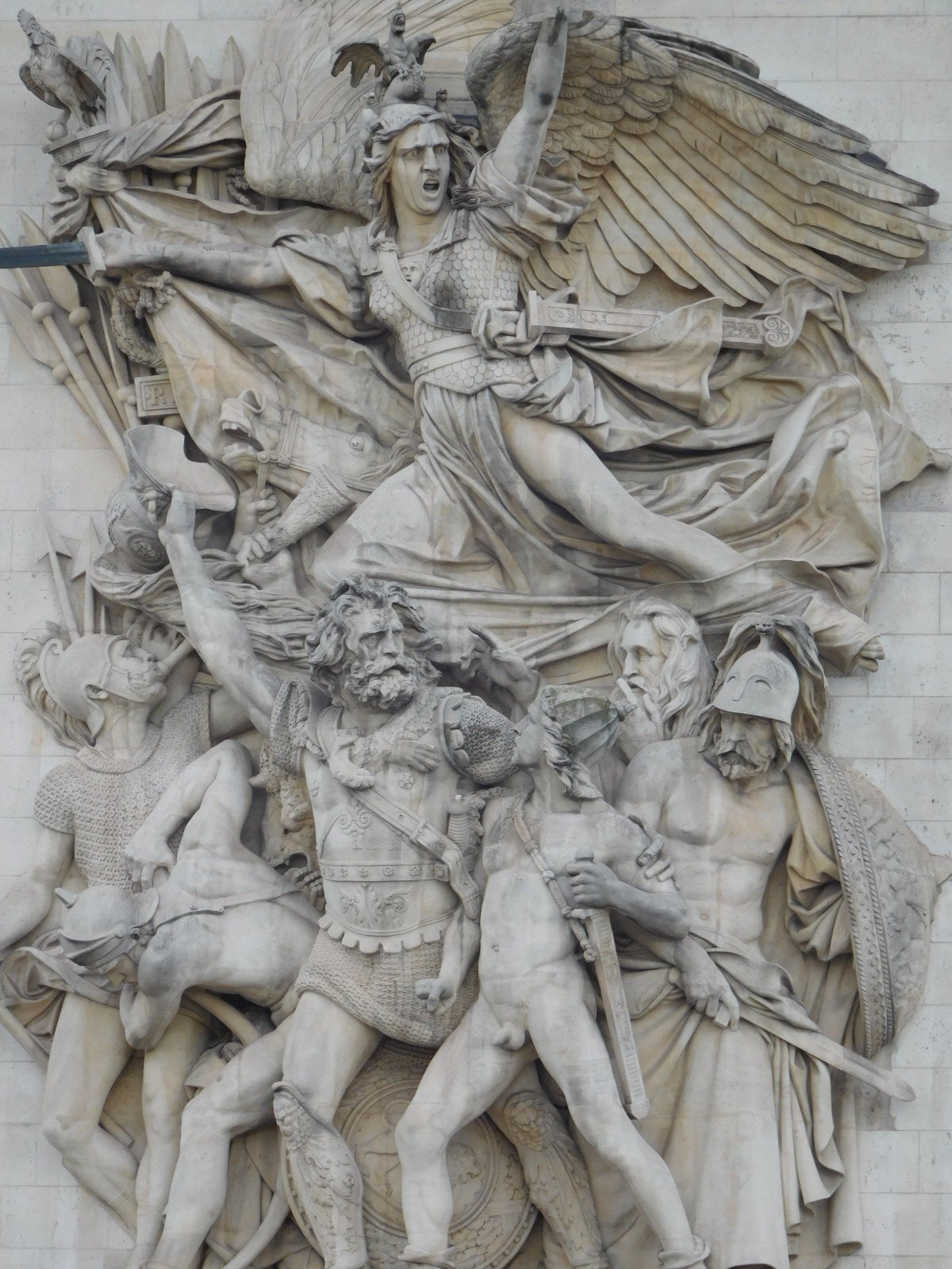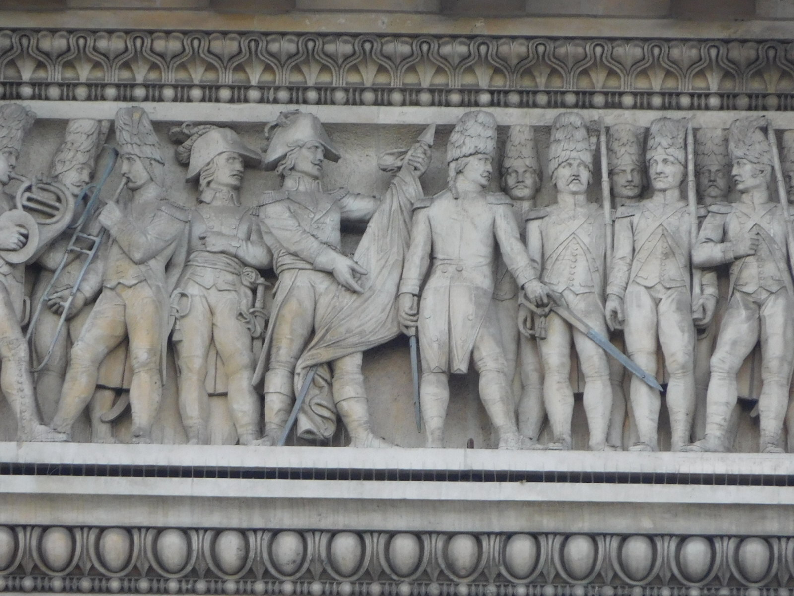 One of those radiating streets is Ave Kleber, which we will take to get to the Eiffel Tower. But another is the Avenue of the Champs Elysee, perhaps the most famous of them all. Here below is the Arc de Triomphe, with some further close-ups of the carvings on it. When you look closely like this, it's pretty wild! You,ve got somebody on there on the French Horn, which figures, but also one on the trombone.