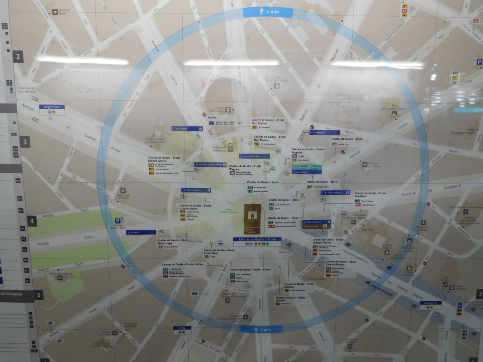 The closest RER/Metro station to the Eiffel Tower is Charles DeGaulle - Etoile. Etoile means star, and you can see it from the street map. There are about thirteen streets radiating from the Arc de Triomphe, which is at the centre of the star. This is the star formation that also creates what could be the world's most complex roundabout.