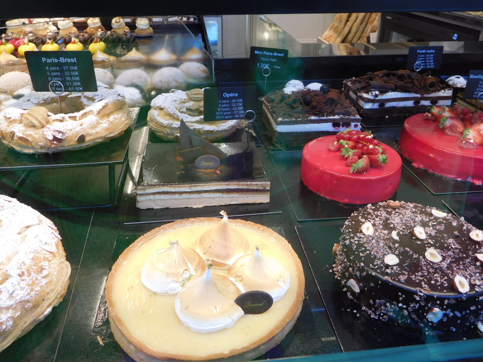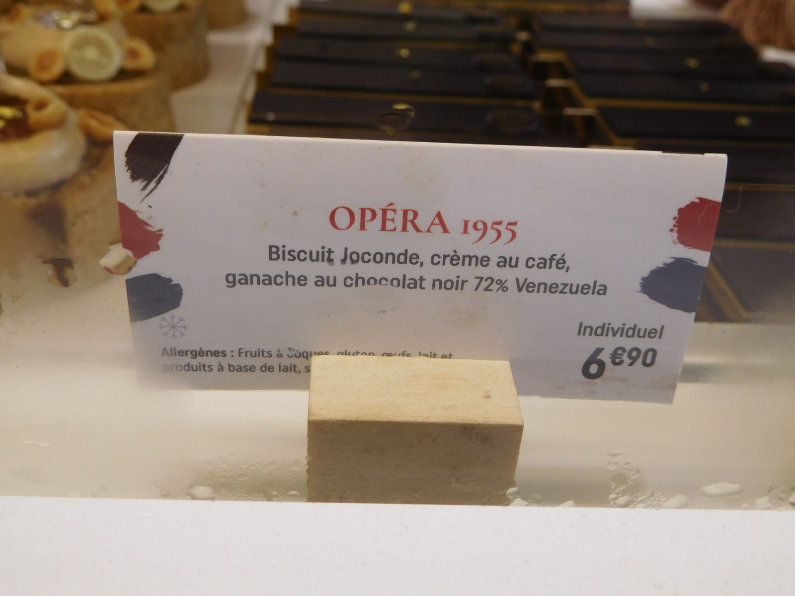 Also at Durand bakery, as shown in the photo below, they offer the "Opera" torte. Opera is made with layers of almond sponge cake (known as Joconde in French) soaked in coffee syrup, layered with ganache and coffee (or Grand Marnier) French buttercream, and covered in a chocolate glaze. Its namesake originates from the layers resembling the levels of an opera house."