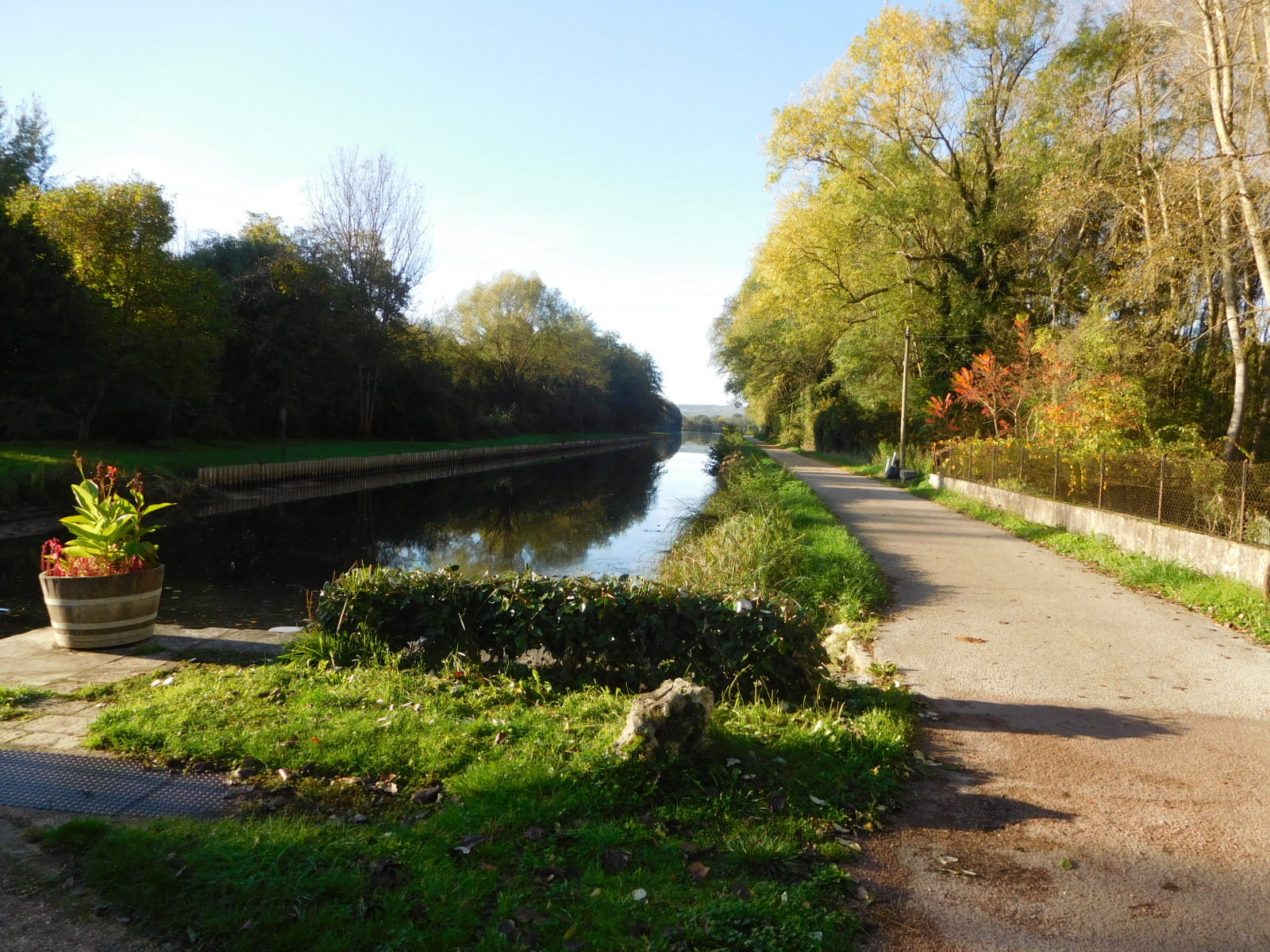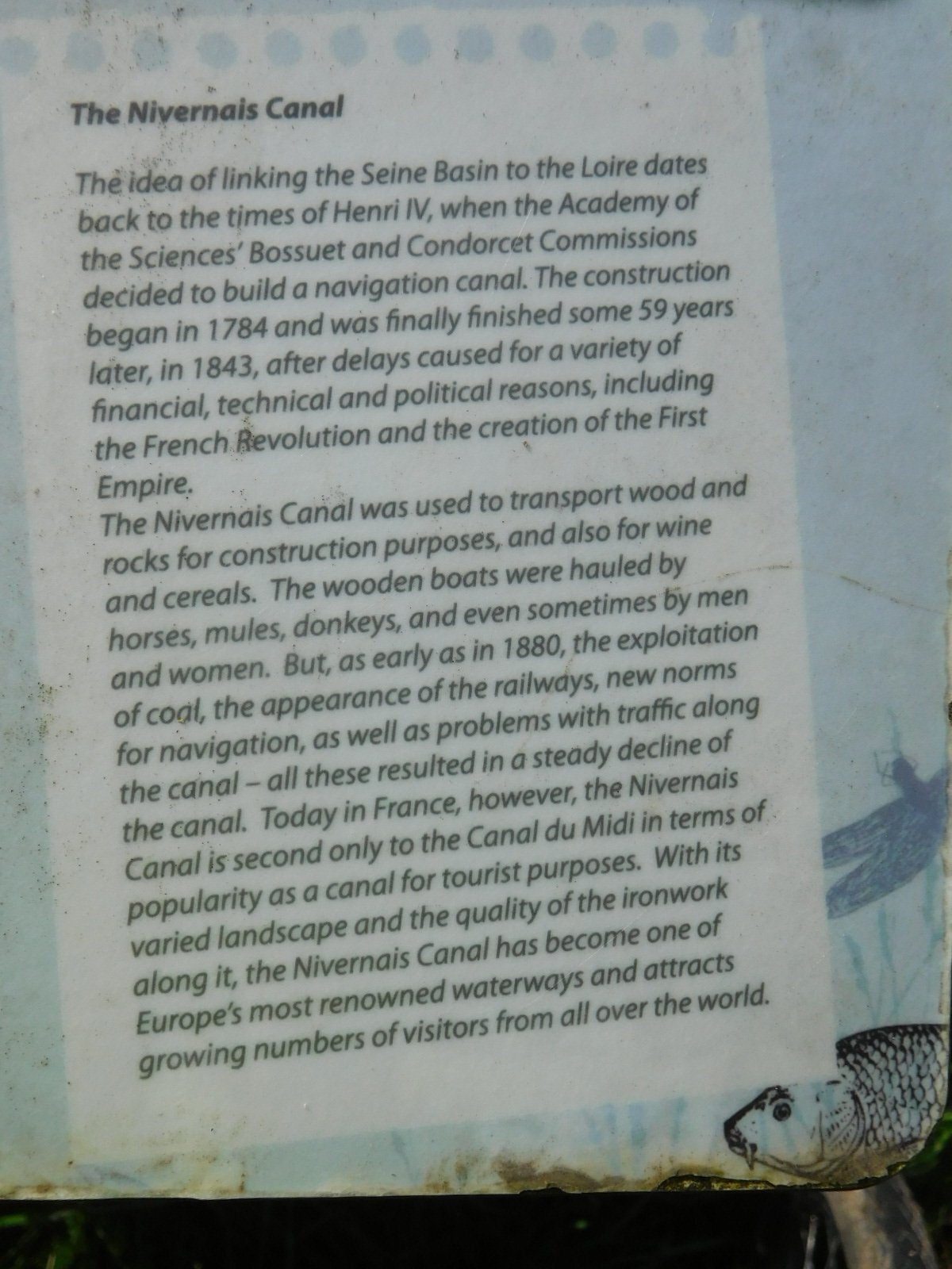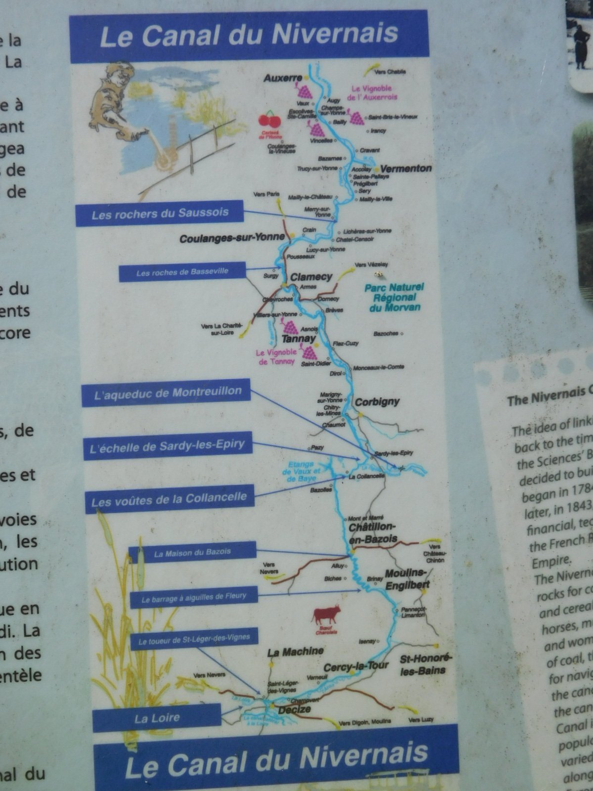 We rolled down the hill and soon were on the Canal de Nivernais. As you hopefully can read from the signboard pictured below, the Canal de Nivernais idea is to link the Seine and the Loire areas. This was no doubt a visionary idea when it came up in the 18th to 19th centuries, before the advent of rail transport, and it lives again for the cycle tourist, as a great link between the two cycling regions.