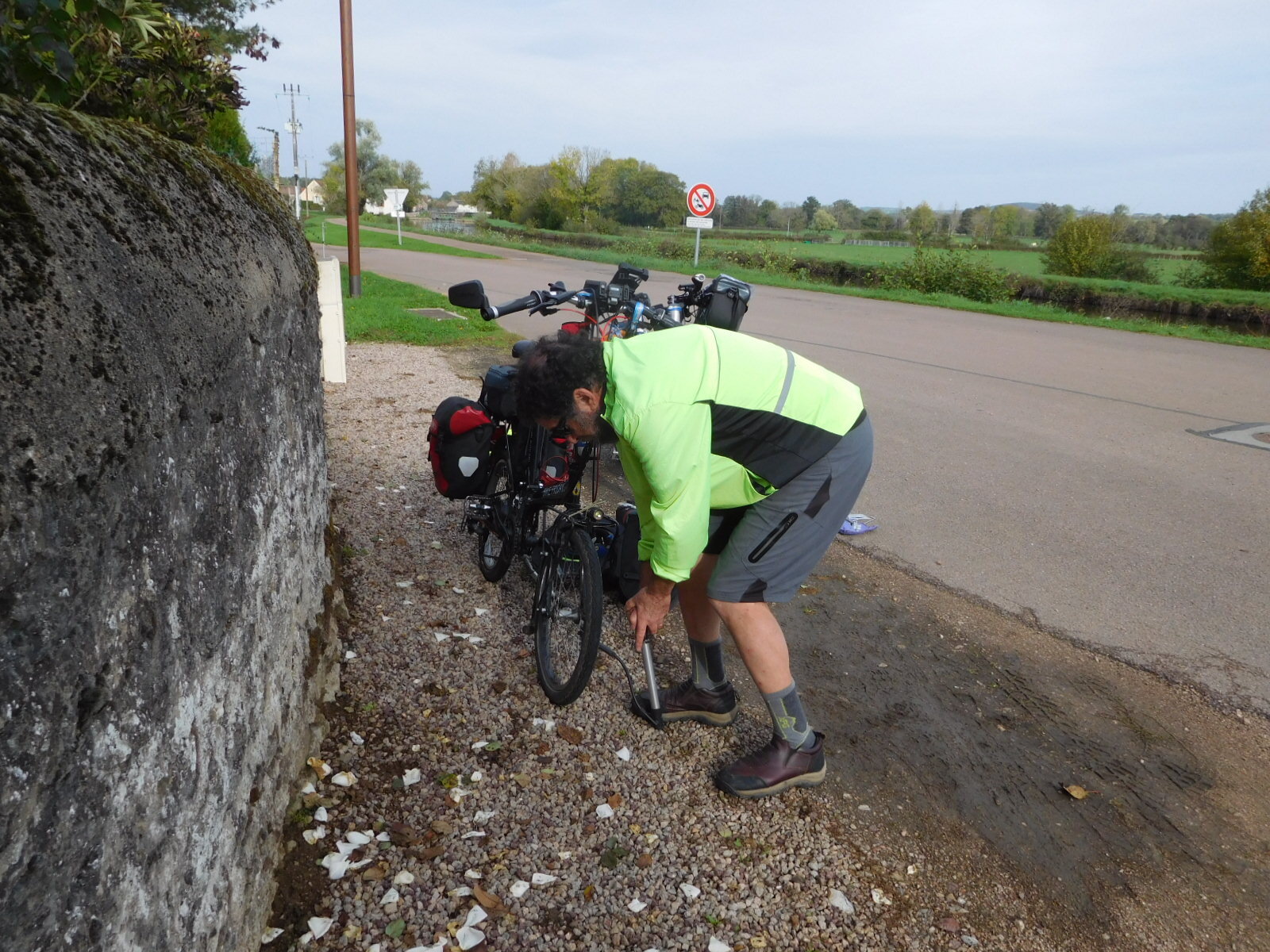 At one point Dodie picked up a branch or something in her wheel, and we stopped to clear it out. I was concerned to find that it was a rose branch with lots of thorns, and one of these was stuck directly in the tire. I pulled it out, noting that it was in the thickest part of the rubber, and I commented that this was lucky, because the thorn was long. We carried on, and it took at least ten minutes before Dodie pulled up with the flat tire. Oh well, those tires are Schwalbe Marathons with "Green Guard", supposedly flat resistant, but no.