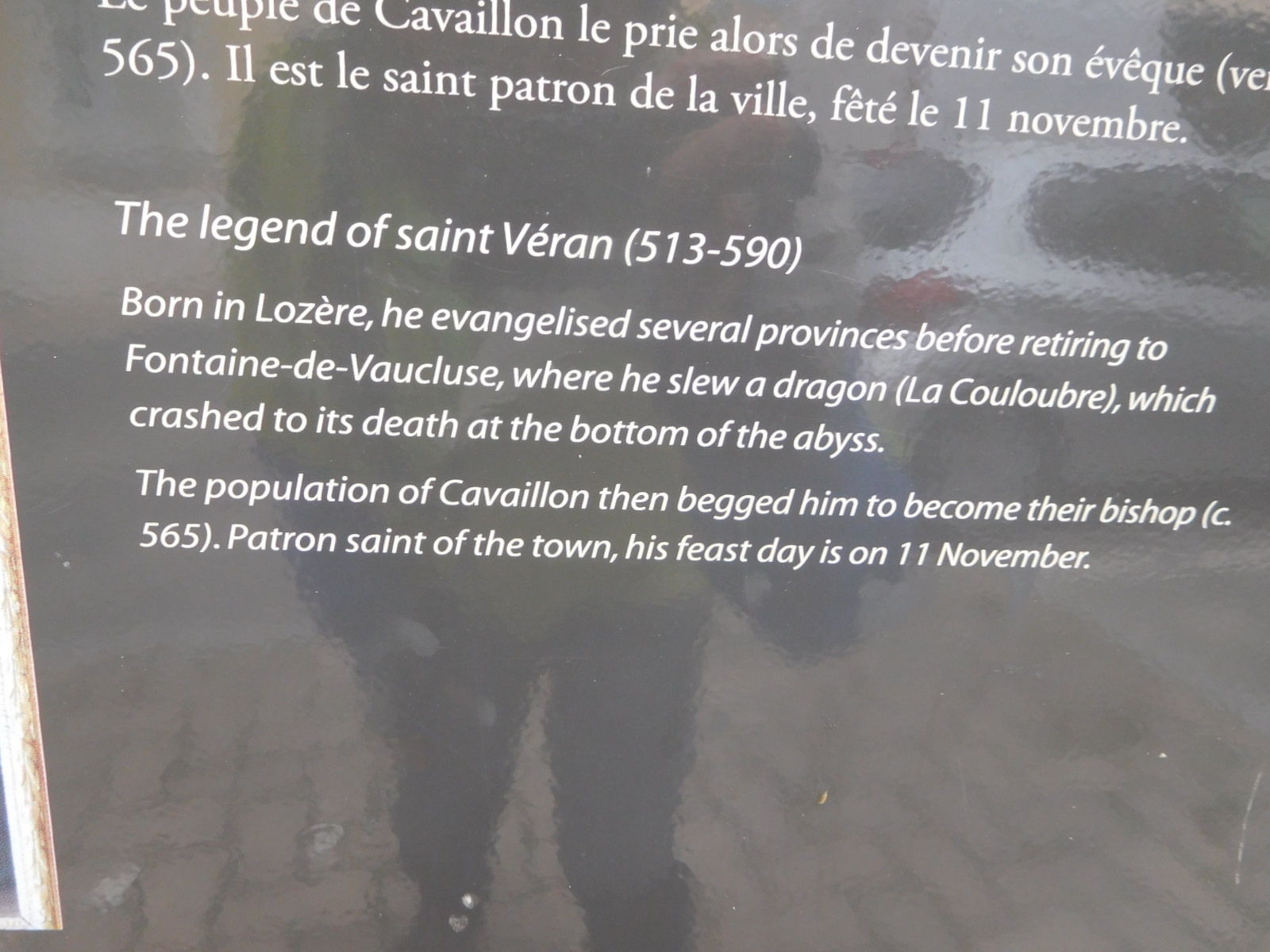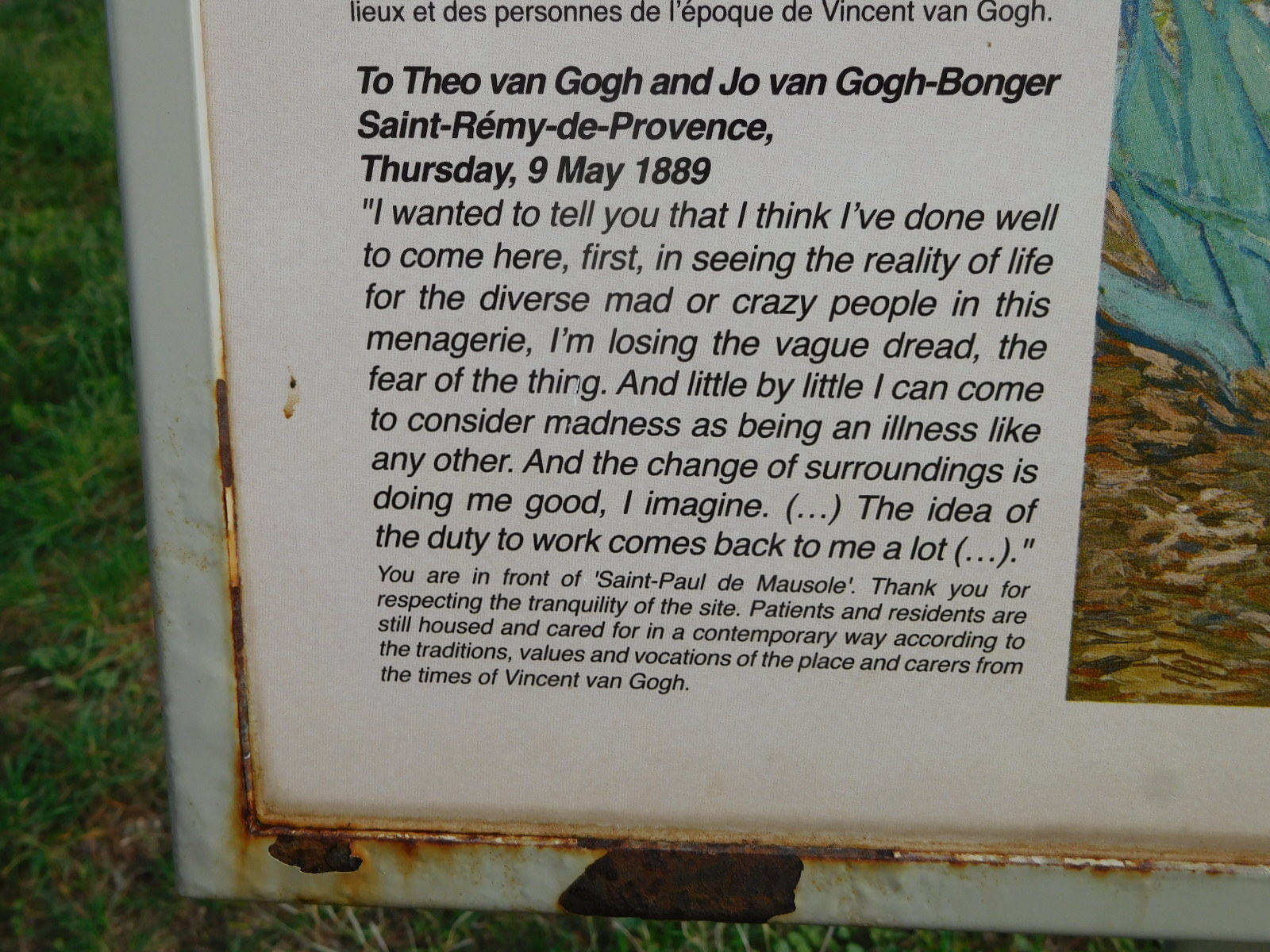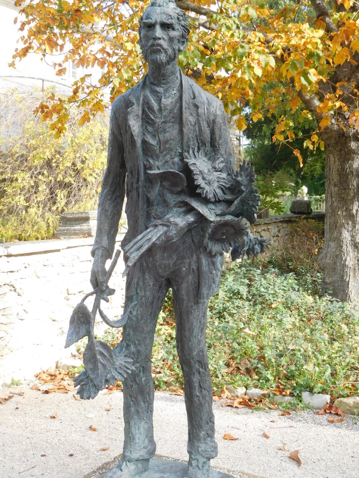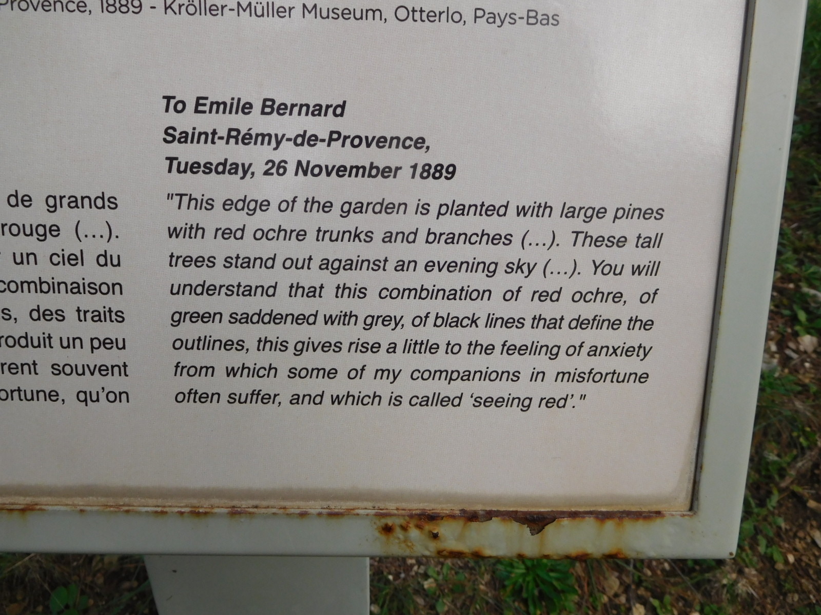 "Vincent van Gogh arrived in Saint-Rémy-de-Provence on 8 May 1889 after suffering a major mental crisis in which he cut off his earlobe. Arriving from Arles, he voluntarily committed himself to Saint-Paul de Mausole psychiatric hospital. Vincent van Gogh stayed there for a whole year, until May 1890." During his time in Saint Remy, Van Gogh made many paintings, with a Provence theme. One of these is highlighted next to the Estrine Museum, but similar panels are found all along Avenue Vincent Van Gogh, which is the street where his Saint Paul asylum is. Each panel shows a Van Gogh Provence painting and something that he wrote, usually to his brother, that is relevant to the painting. These panels are terribly moving. We will soon go to Avenue Van Gogh, and the asylum, to appreciate more about Van Gogh.
