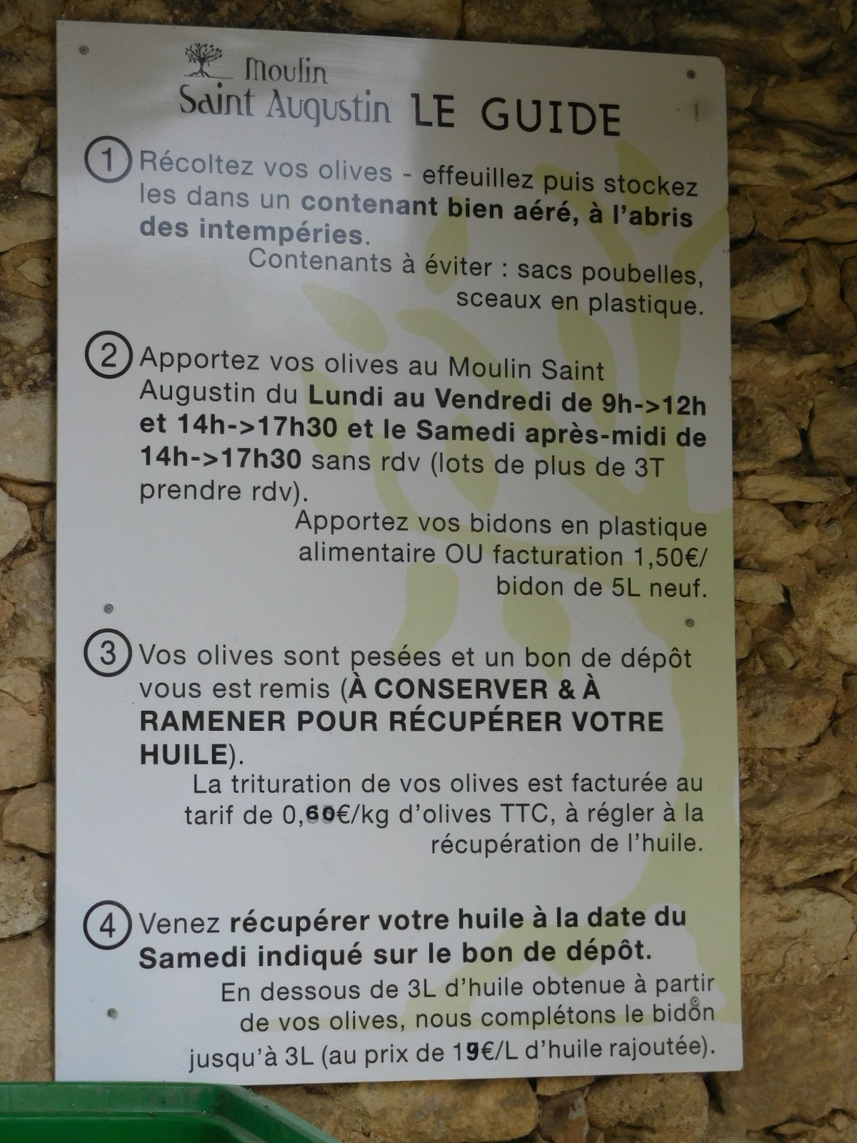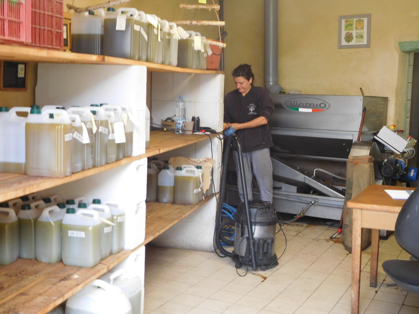 Dodie now spotted an olive oil mill, and we pulled in for a look. This was an operation where smallholders could bring their olives to get them pressed. The price seems to be 60 euro cents per kg. We learned that in a good year it takes 5 kg to make a litre of oil, but this year it is running to 7. So that is a pressing cost of about 5 euros per litre. However rule 4 seems to say that if you are getting less than 3 litres of oil, they will top up to 3 litres at a cost of 19 euros per litre. That seems rather harsh.