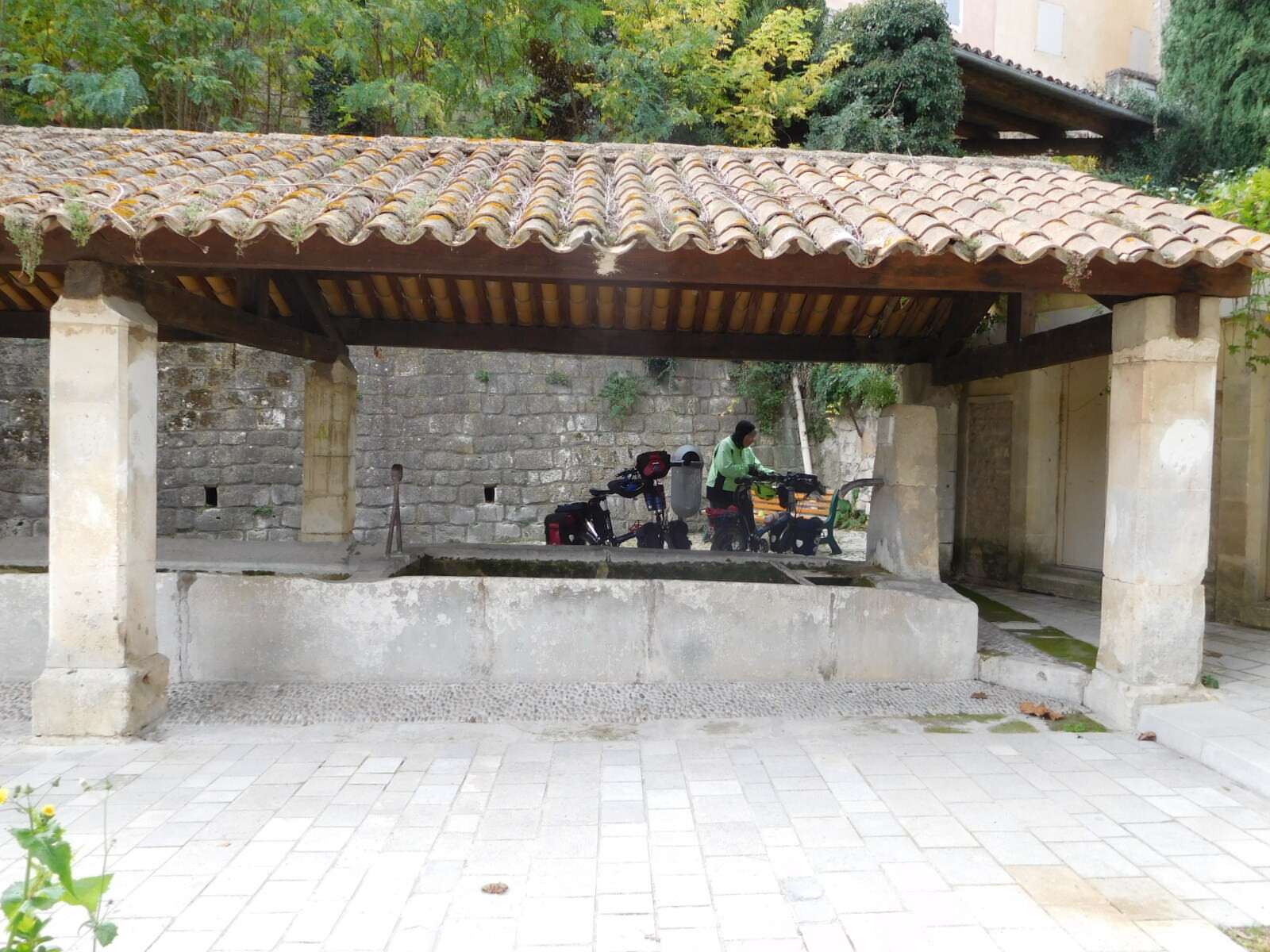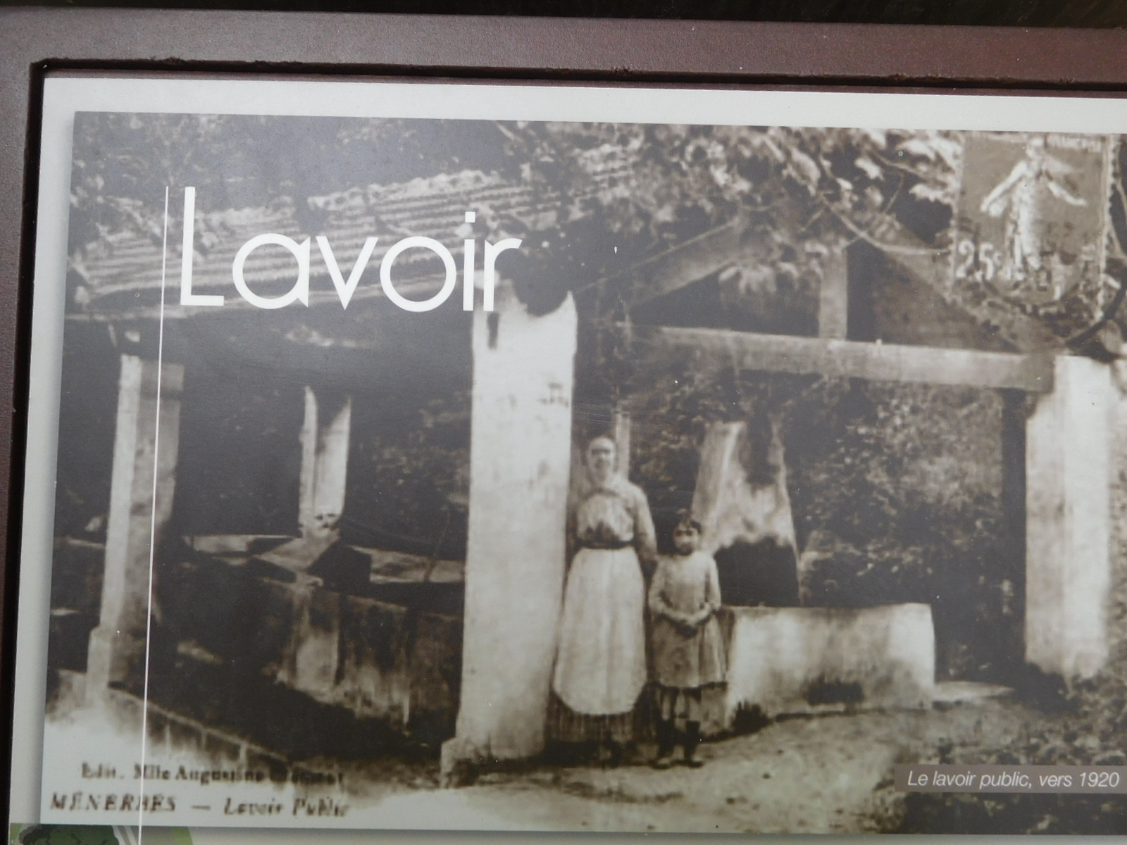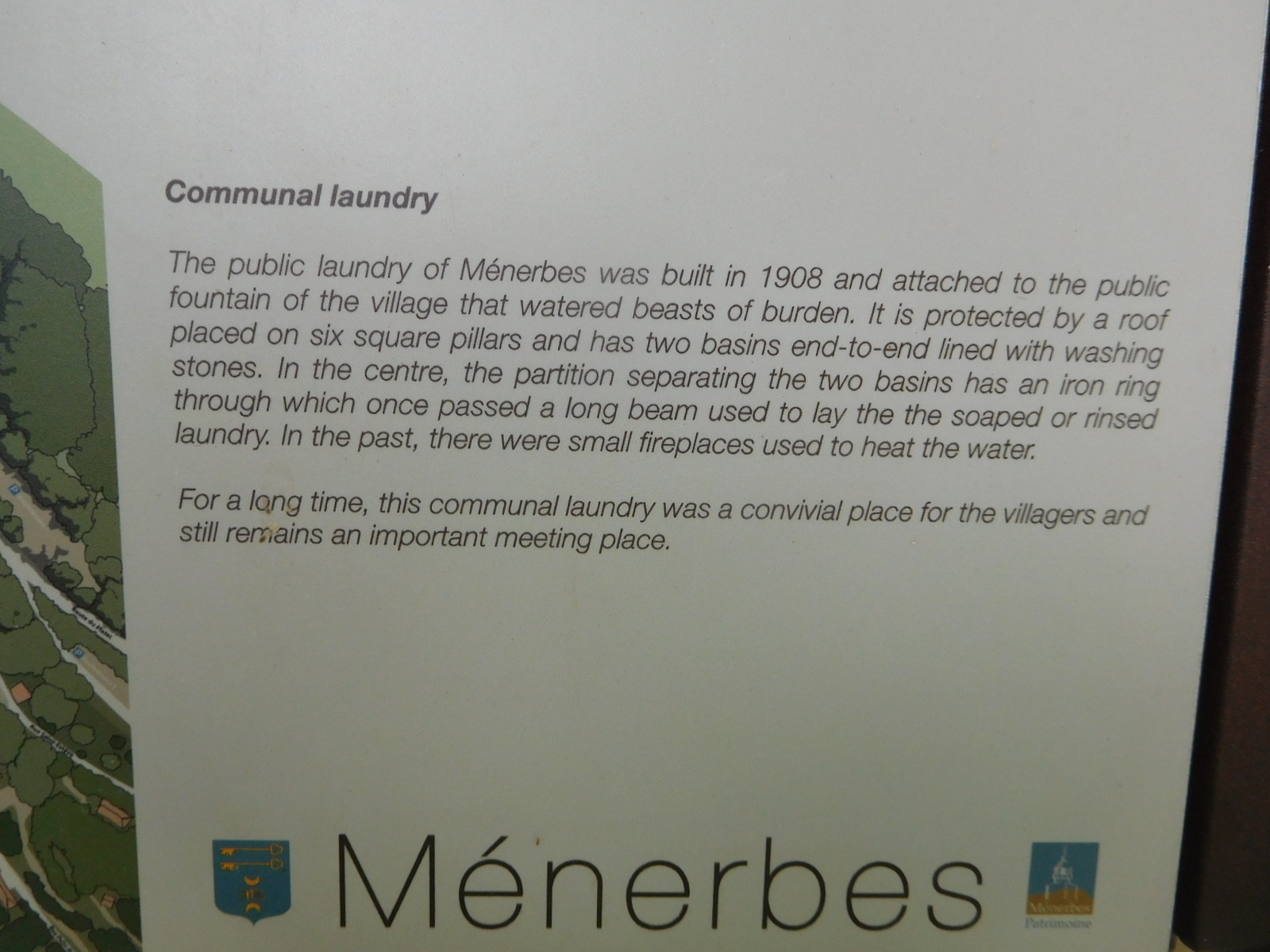 We descended a bit to the lavoir, which was built in 1908. It not only has a protective roof, but two great benches, one of which served for getting out our lunch stuff.