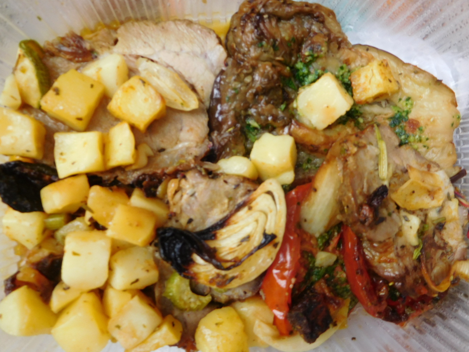 Here is what we had got at the market in Cavaillon. You can see the potato, tomato, onion, and pork, and the aubergine, perhaps yummiest of all. See the green mixture of garlic, parsley, and etc.?