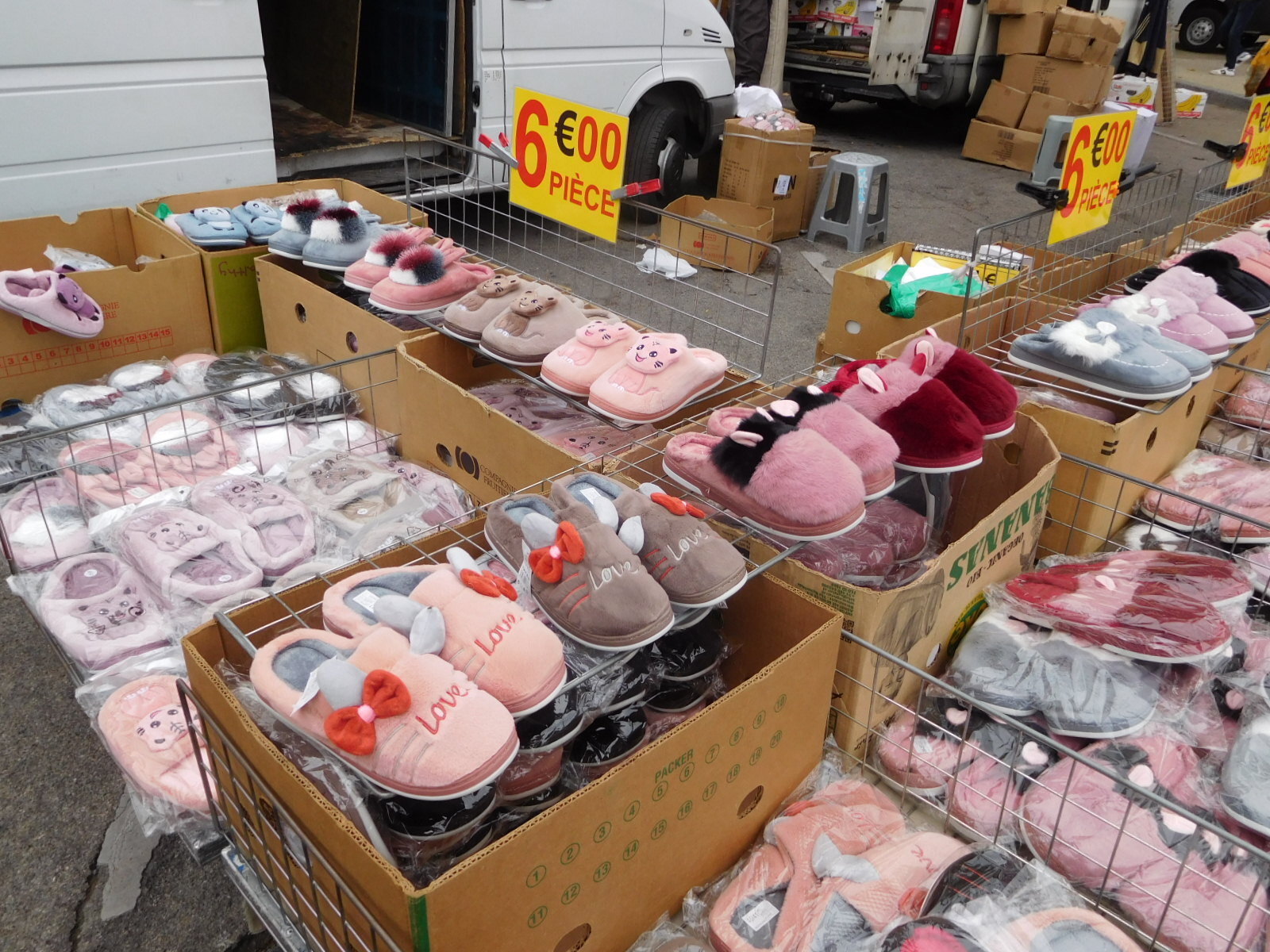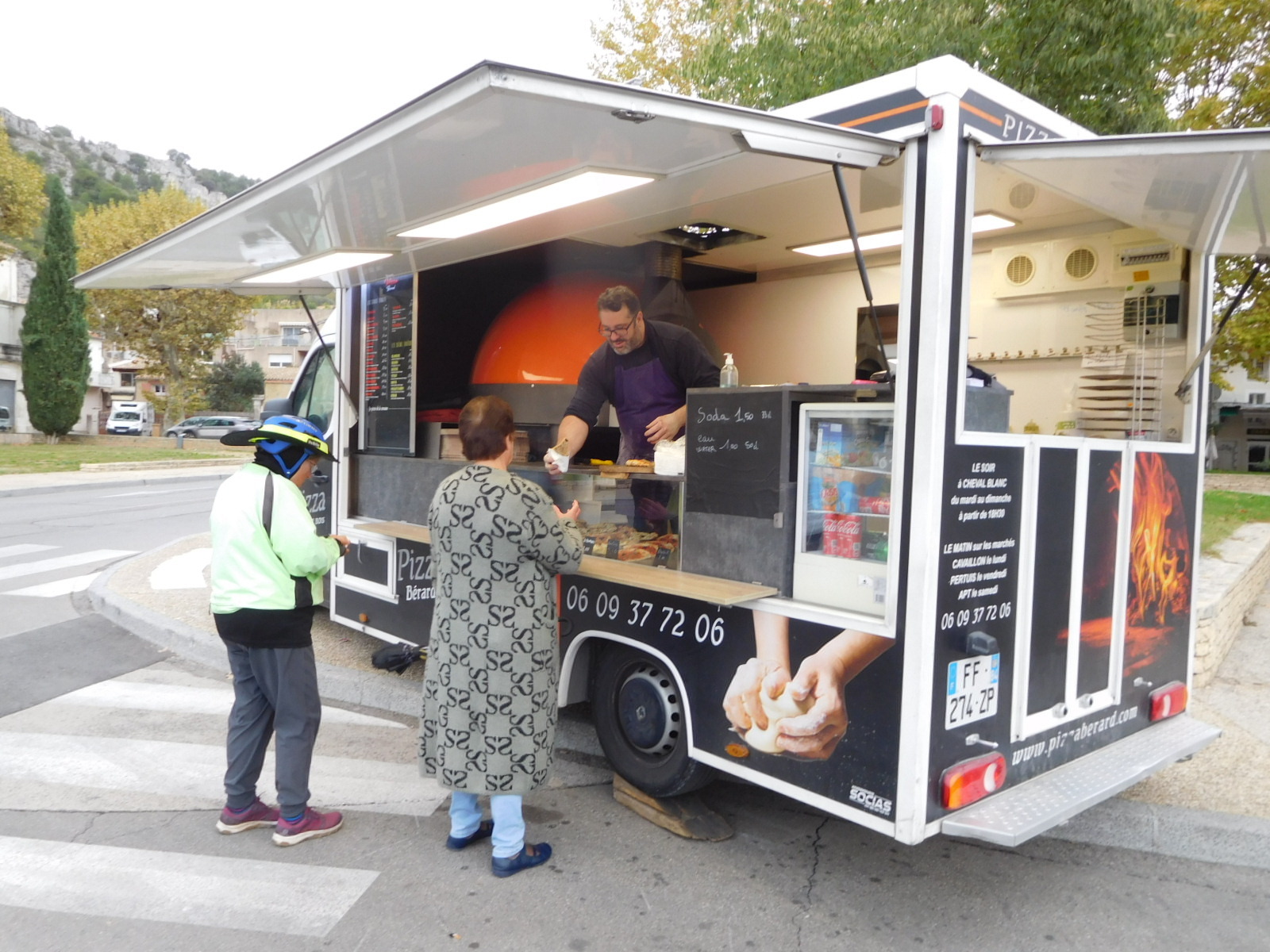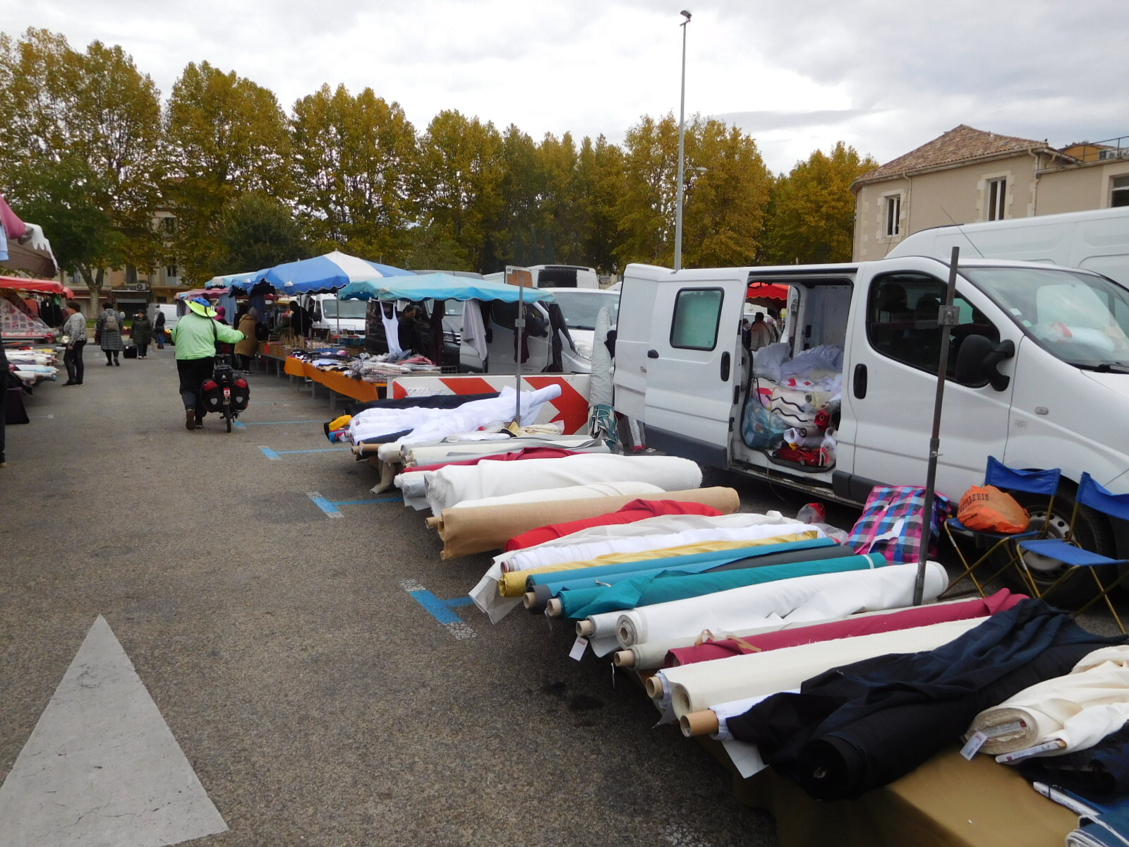 At dawn, right outside our window, the Monday market began setting up in the ugly large parking lot. By the time we finished breakfast and got out our bikes, it was filled with trucks, with their stalls in front. At first it appeared as if all these stalls would be for clothes and dry goods, which would have reinforced a negative Cavaillon assessment. But not that deep in, a wood fired pizza truck was parked. OK, we bought some of that!