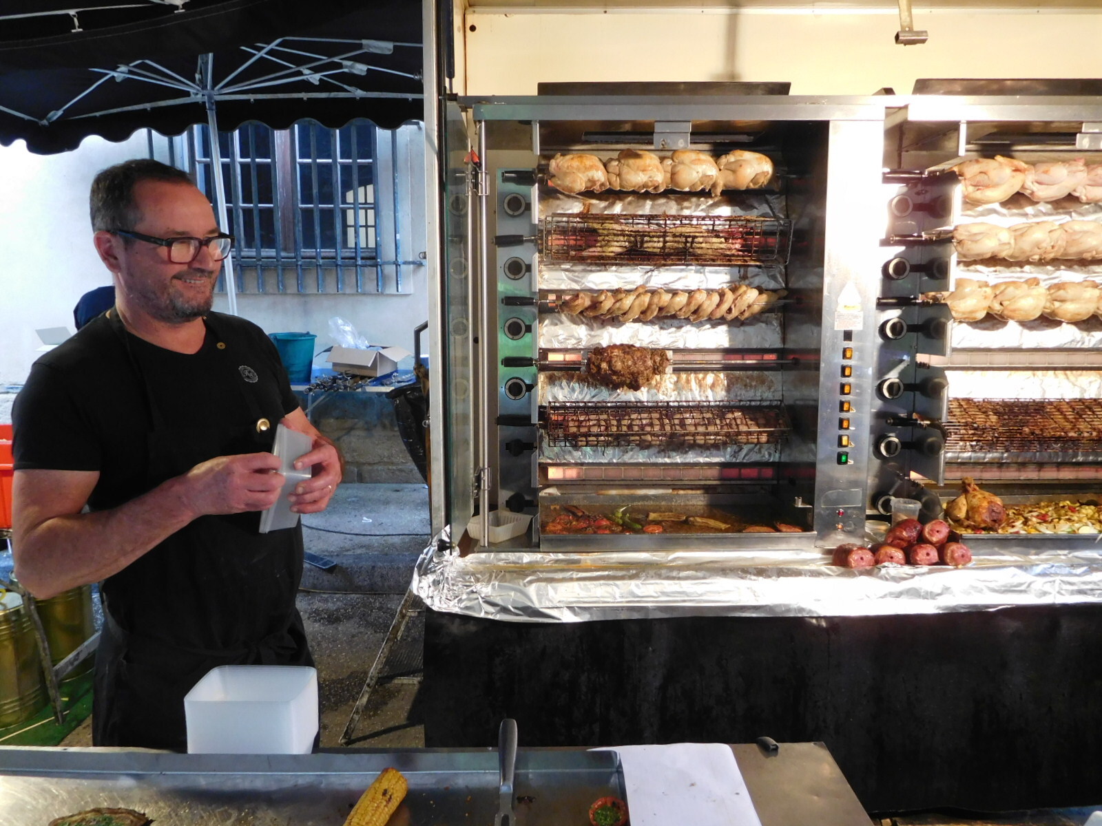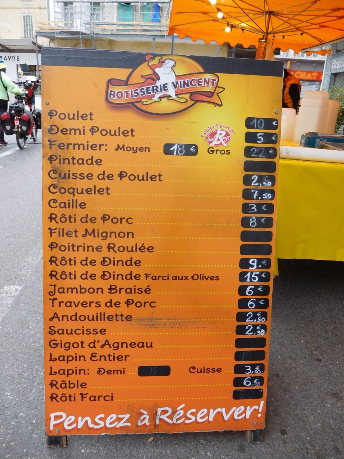 As we walked deeper into the market, finding that it filled many streets and not just our parking lot, we found more and more food vendors. Plus the streets, active with stalls and people, looked far more attractive than they did on the barren Sunday. What really turned the tide of opinion, though, was the man shown below, and his rotisserie truck. His stuff was so good! We went for the roast pork, the aubergines, potatoes, and tomatoes. And these things were Provencal style. The man put on a paste of garlic, olive oil, and herbs, including a lot of parsley. I tried to ask how he achieved the pork being so moist and tender, but Dodie spotted the answer: It was roasted underneath the chickens, and was continually being dripped on by chicken fat. What's more, rather than being a lean pork loin, I think it was rolled shoulder, which is fatter and therefore more tender. A few hours later we would really appreciate all this, while seated high on the hill that hosts Menerbes.