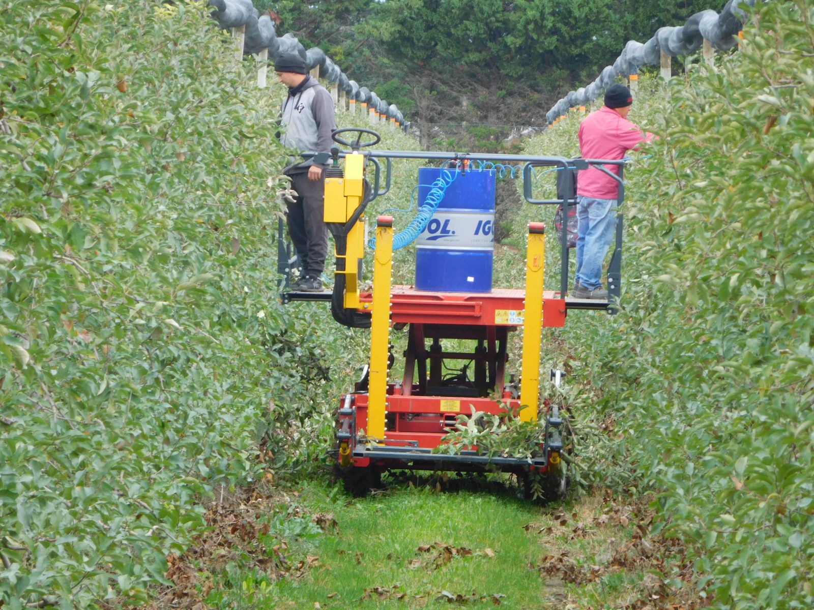 The trick behind the nice trim became apparent when we came upon these guys. This is really luxury farming. They have the lift to put them at the right height, and they are wielding hydraulic operated nippers. They are taking off about 3 foot lengths of branch and dropping them to the ground. Presumably someone comes along later to pick them up. Note that this orchard also features neatly wrapped mesh waiting above the trees.