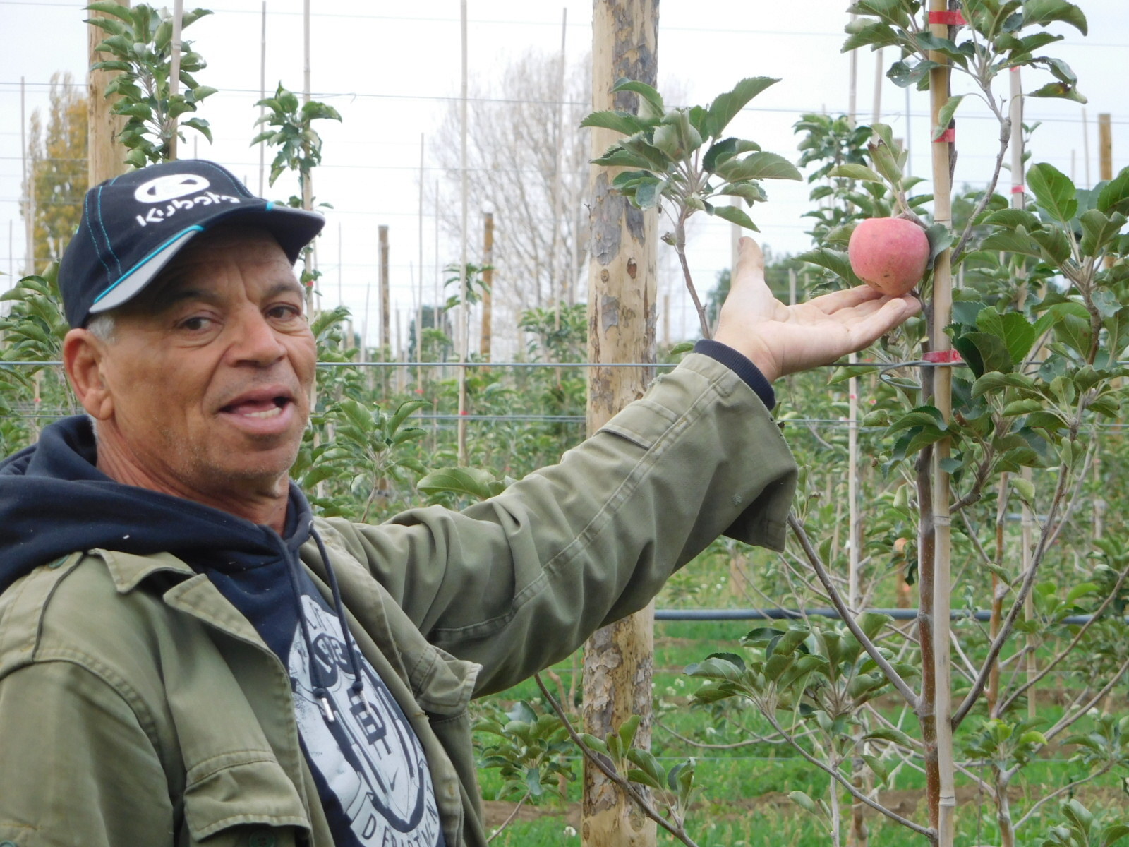 The variety is Pink Lady, one we know from back home. This variety brings a high price. One of its quirks is that it does not attain its pink colour until cold weather, such as in November. Until then it is green.