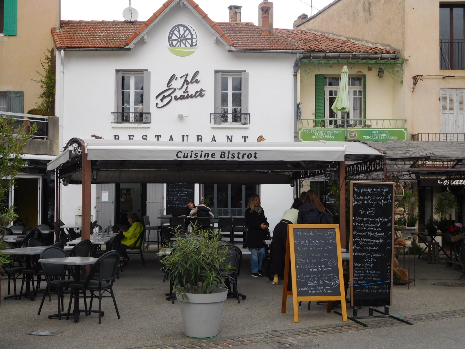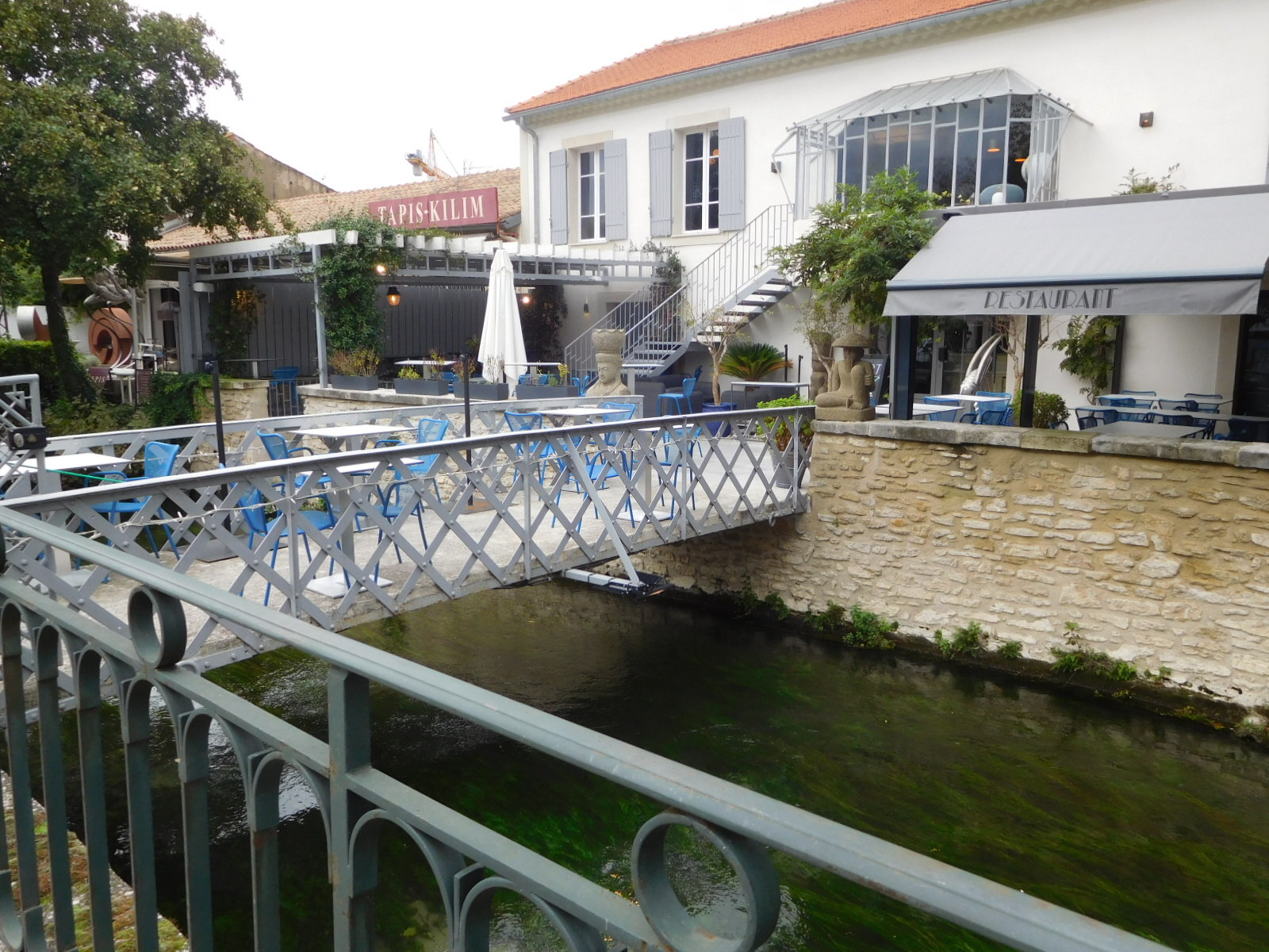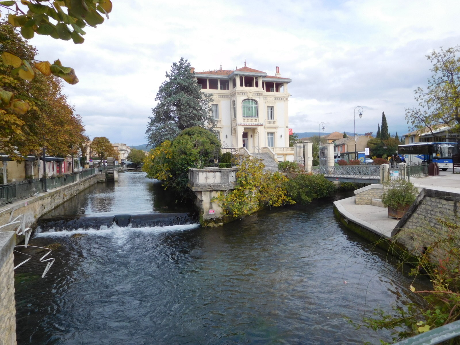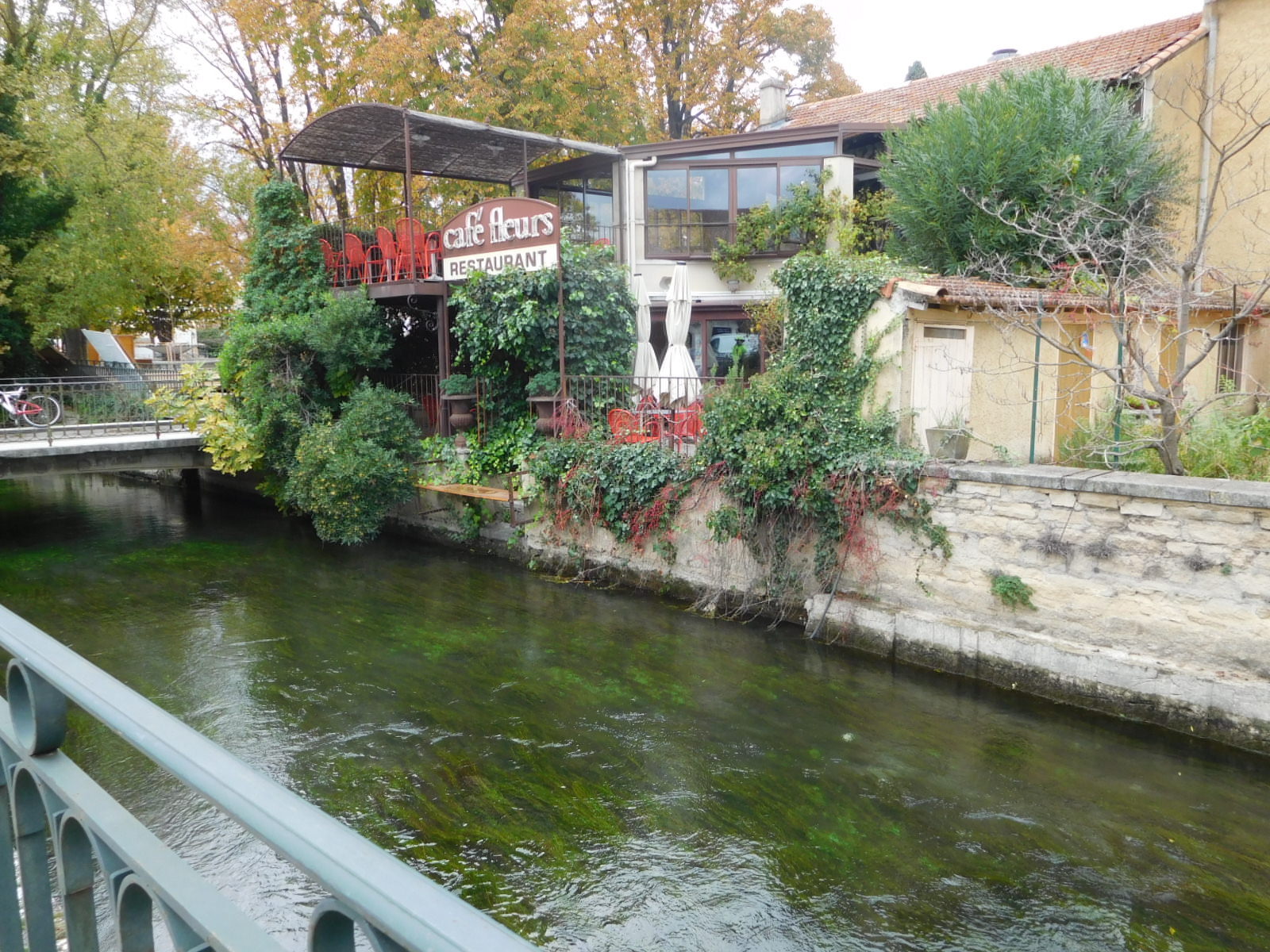 We have been planning our next days with an eye to eventually having to be at Marseille airport to catch our flight home. We got the bright idea that we could avoid any possible traffic problems getting to Marseille by taking the train from Cavaillon. This could also create a spare day for noodling around this part of Provence. So today as we were heading out on our planned excursion to l'Isle Sur La Sorgue, we stopped at the station (which is on the way) to see what convenient services they could offer. What we found was a shut down wicket and a sign that seemed to say the trains were not running. We thought this slightly odd, since at that moment a train pulled in, but at that moment there was no one around to argue this fine point with.
