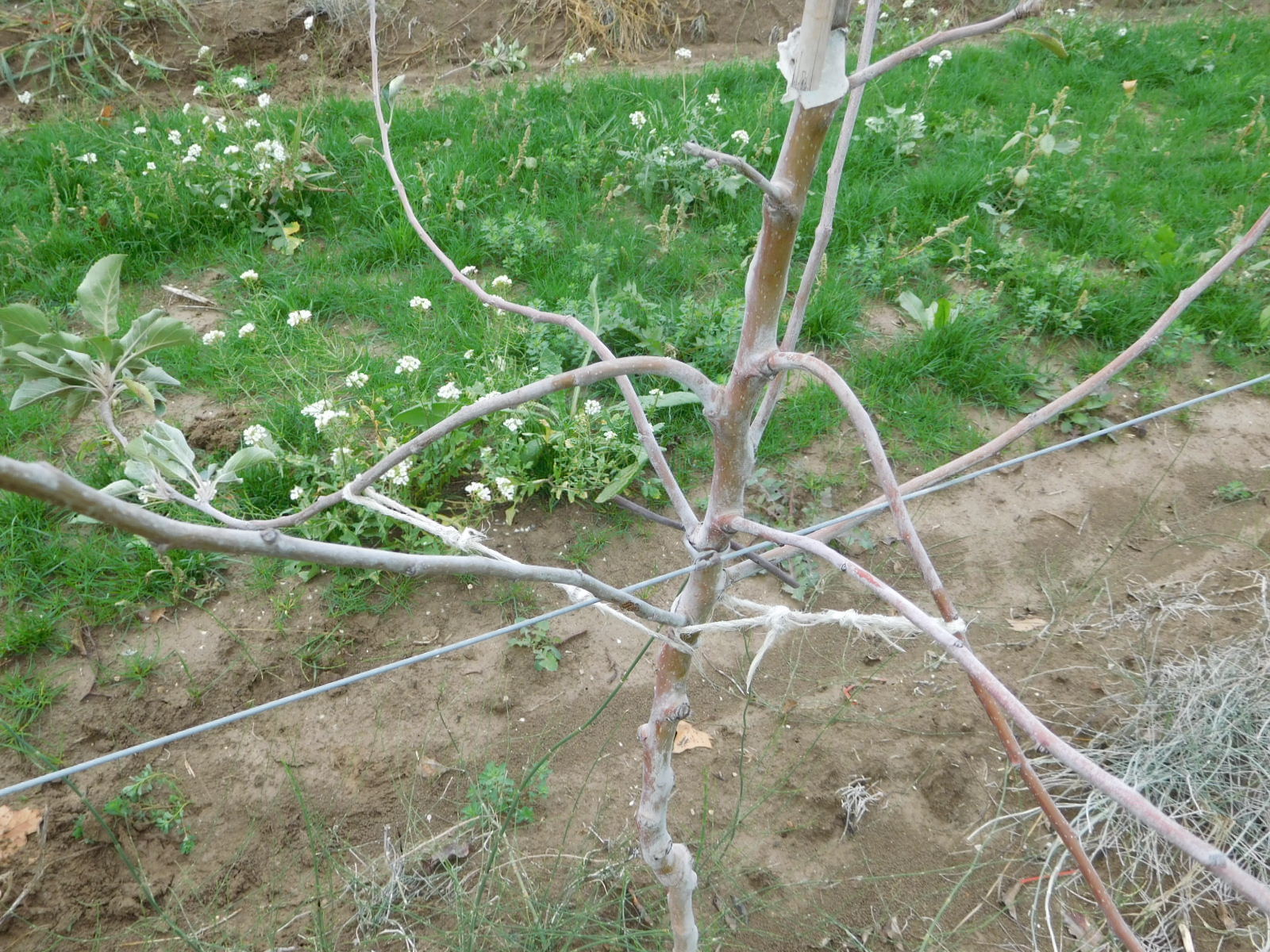 No pruning is yet being done, but training is. This involves twining such branches as possible along the horizontal wires. A branch that is bent to horizontal will quit elongating, and will put forth valuable fruiting spurs along its length.