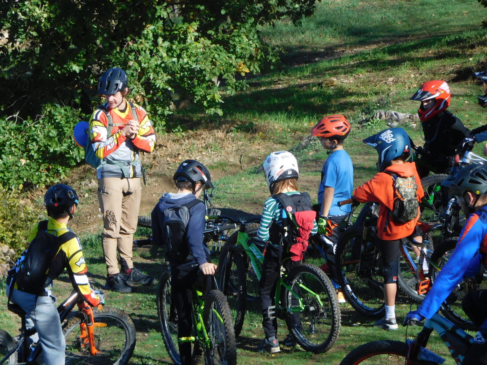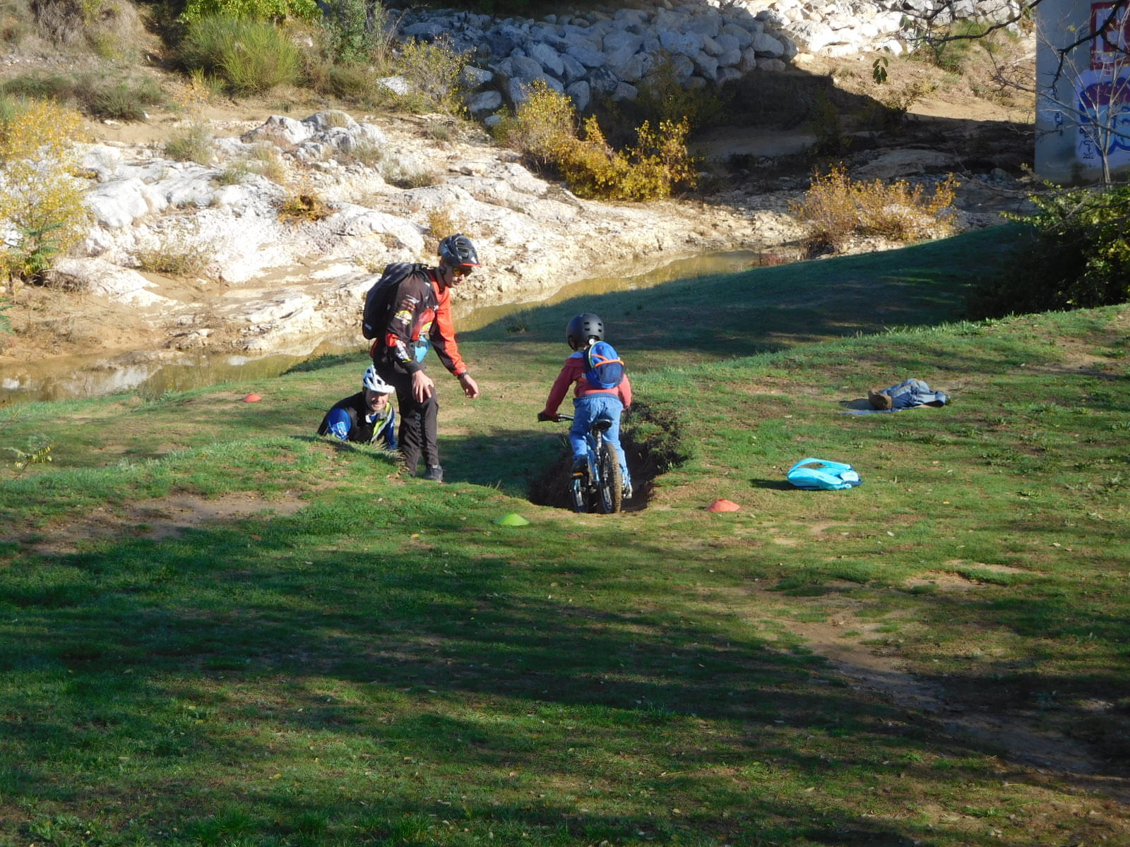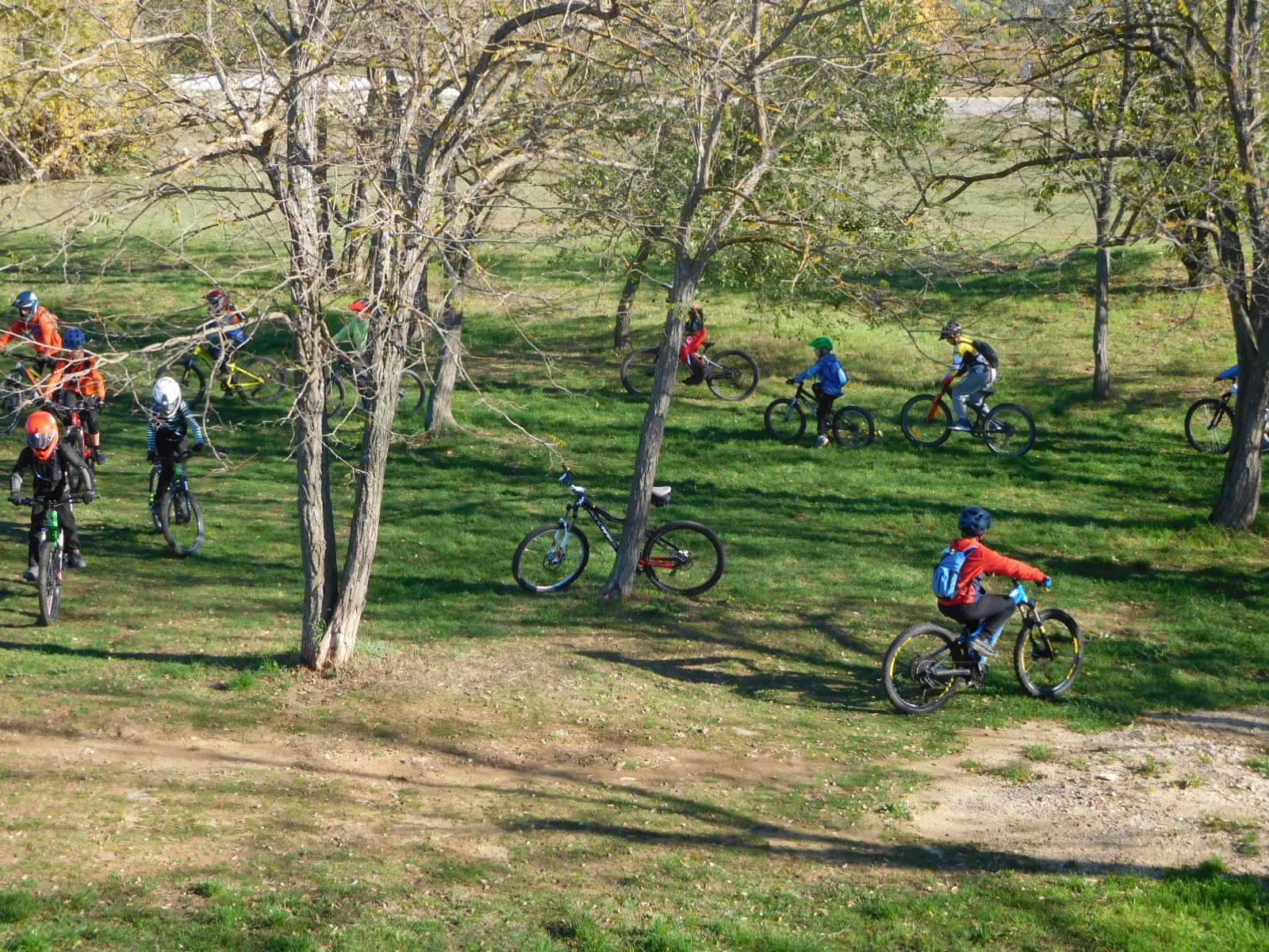 The riverside area near the bridge is popular with the public, such as for picnicking. But today the main use was for kids who were learning to mountain bike. In the first photo, they are going down a steep rut, spotted by two instructors. The second photo is a pep talk, including some exercises like neck rolls and arm stretches, that I did too. And finally the kids are following the instructor in circles, but are soon to try out some of those ruts.