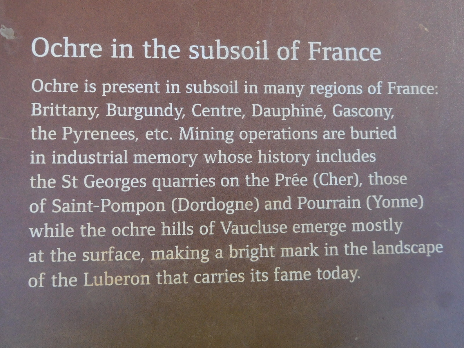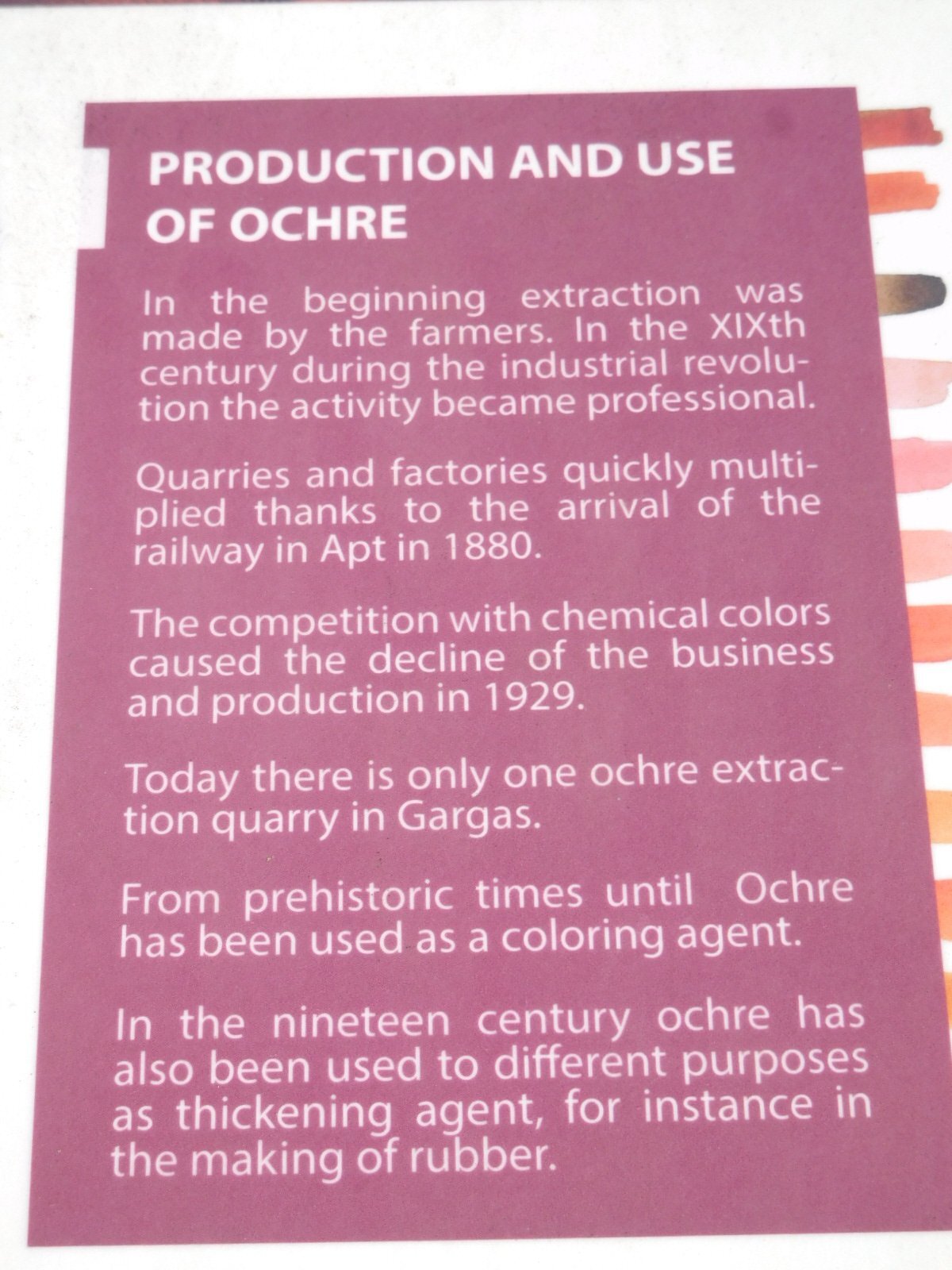 A visit to Roussillon has perhaps three main aspects. There are the huddled, earth toned, buildings; then there are the multi-coloured ochre cliffs, with fantastical shapes carved by erosion; and finally there is the story of the processing and use of the ochre itself.