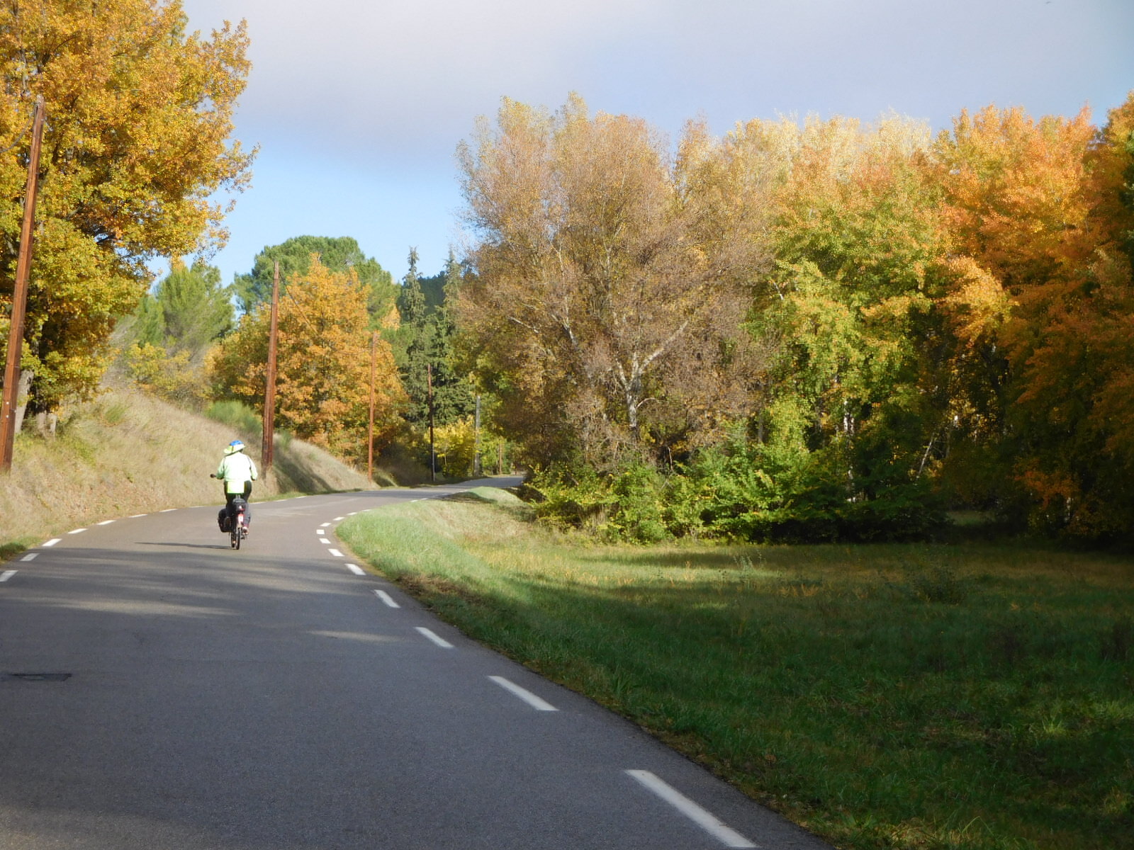 To get to Roussillon, we chose to head straight back out on the Calavon route, which really is the bicycle superhighway here. Then at a cleverly chosen, strategic point, we would jump north toward Roussillon. I chose that strategic point by clicking rather blindly on the map presented by my routing site: cycle.travel. But I was pleased to later find that I had clicked on Pont Julien. Pont Julien is not only a worthy destination or way point on its own, but it is absolutely and clearly the way to go to Roussillon from the Calavon. Good random clicking, Steve.