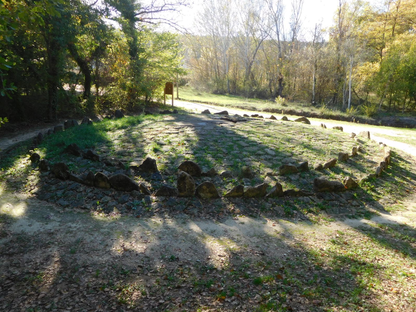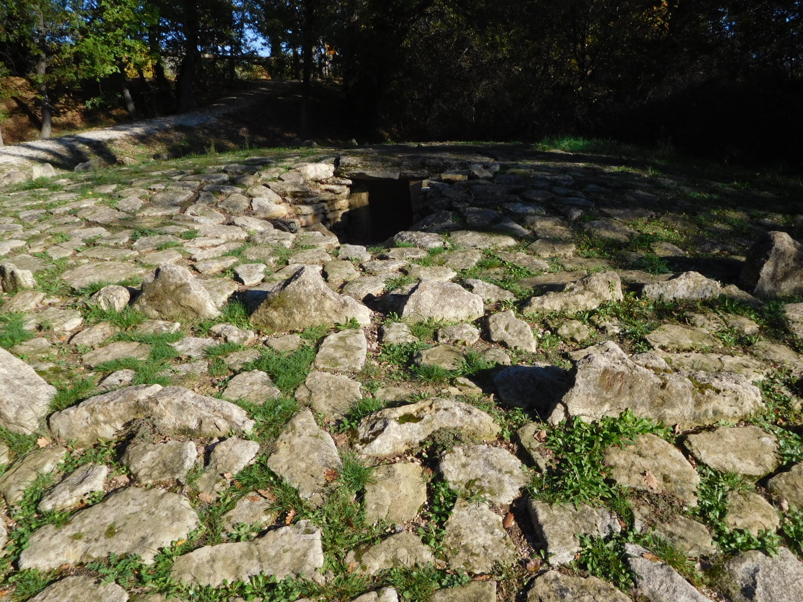 We thought about continuing to some of the other towns in this Ochre region, but realized we would end by returning in the dark. So we headed back to the Calavon. The fun was not quite over, though. By the river we came across what is called the Dolmen of Ubac. This is a burial chamber from around 3000 BC and is said to contain about 50 individuals. It was discovered in 1995 after a flood of the Calavon. Subsequently it was apparently moved to a safer spot to protect it from flood, though it is still close to the river. If truly it was completely disassembled and reassembled, than a lot more must be known about it than we find in the info panel on site or in Wikipedia. But we do know there is a chamber, and a corridor in there!