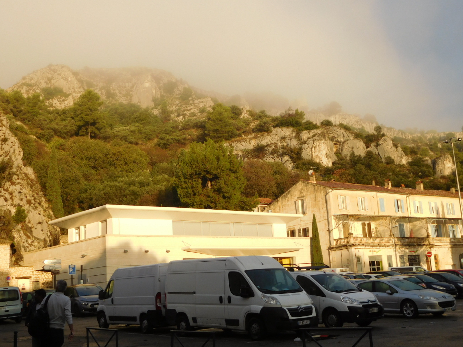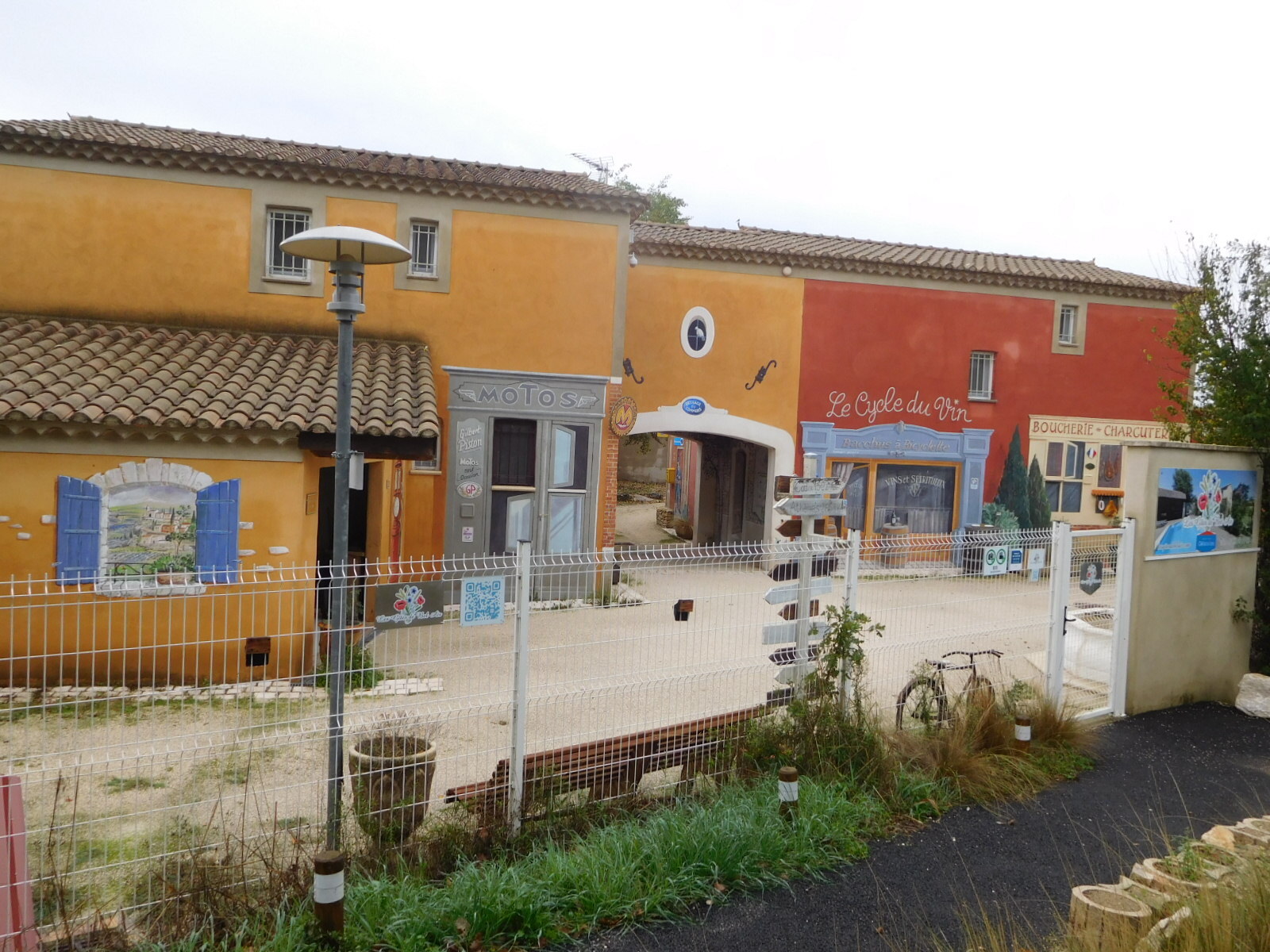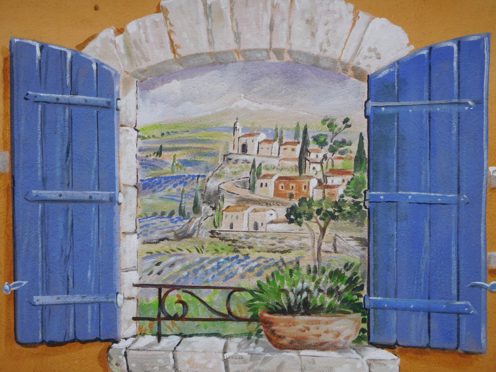 The Calavon is a rail trail, with the rail playing an important role in the extraction of the ochre that we will see in the Ochre Cliffs. Consequently there are former station buildings all along the line. One of these, at Taillades, has been expanded and redeveloped into a gite complex. What attracted our attention was how they decorated the buildings, painting them with trompe d'oeil storefronts.