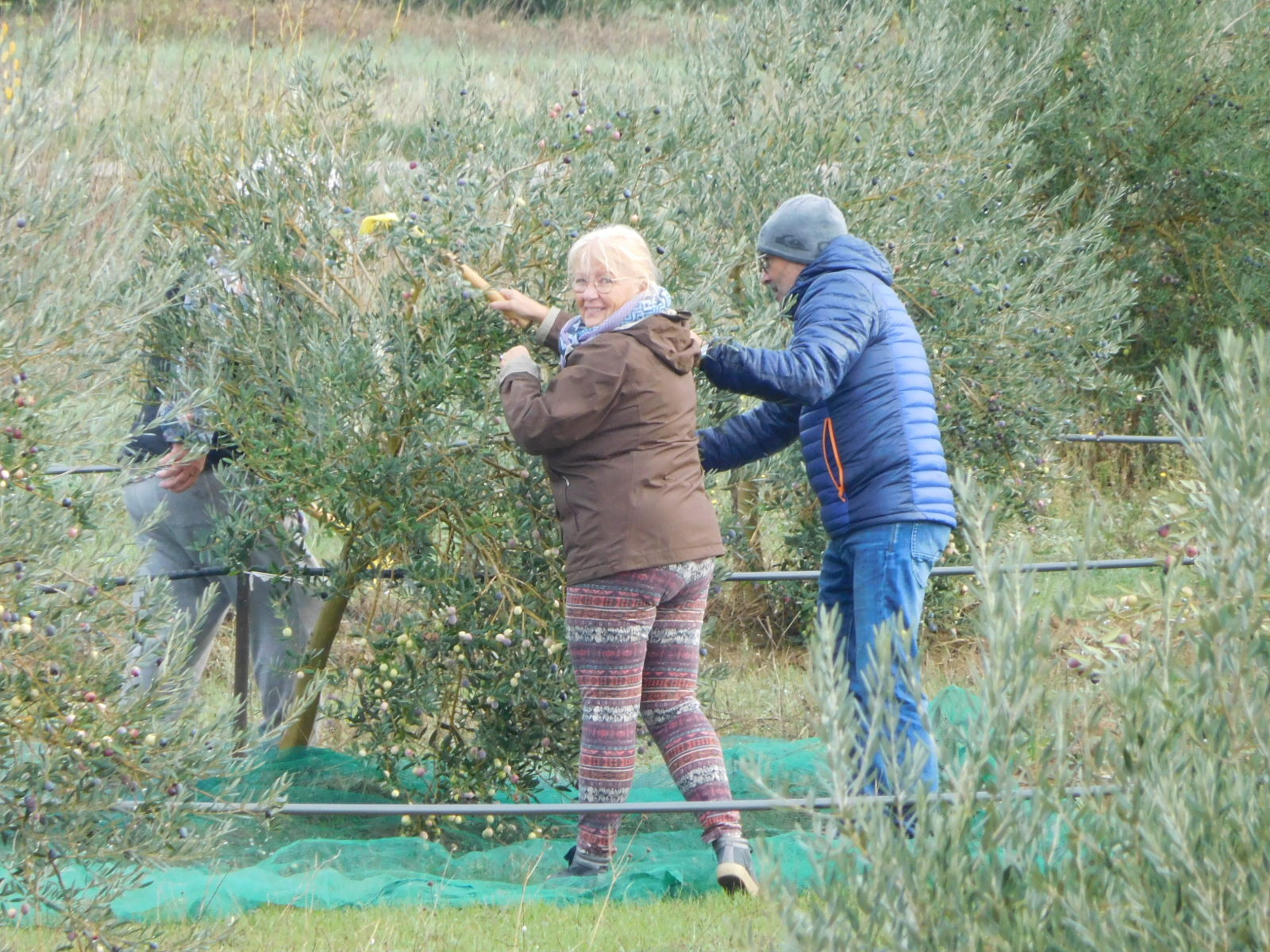 Yesterday we talked to people at the olive oil press, learning that they use a "comb" to remove the olives. Today we spotted some people doing just that, although the "comb" looks more like a child's rake. The green mesh on the ground is catching the olives.