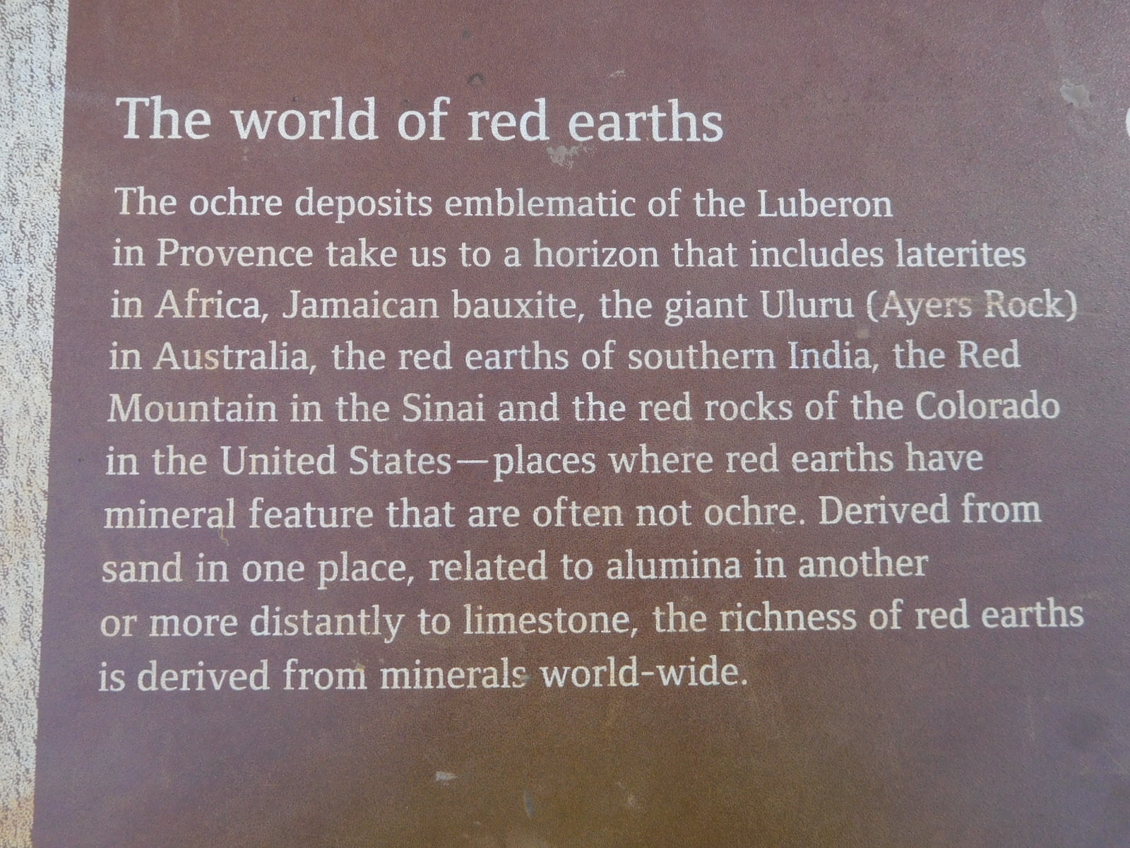 The Ochre region comprises an area only about 20 km by 10 km. There are about ten towns in the region, and each would be interesting to visit. At Gargas, for instance, there is a mine with a labyrinth of tunnels, while at Rustrel there are many colour variations and the sites of former industrial extraction.