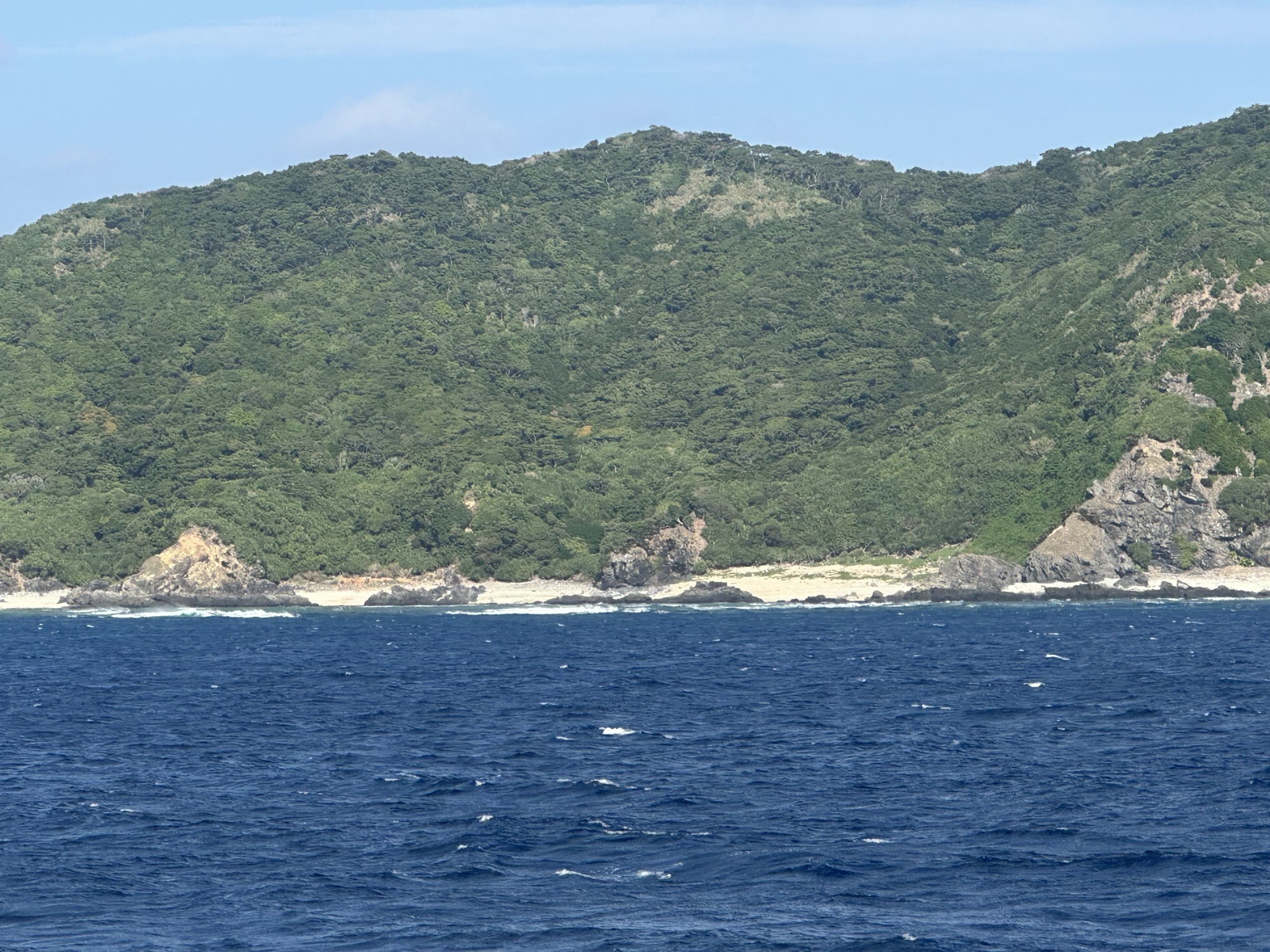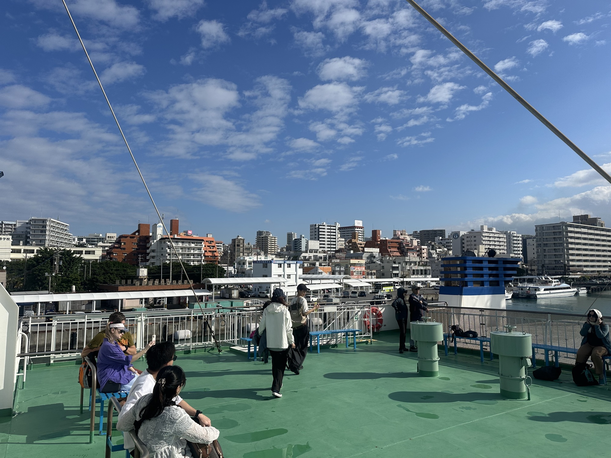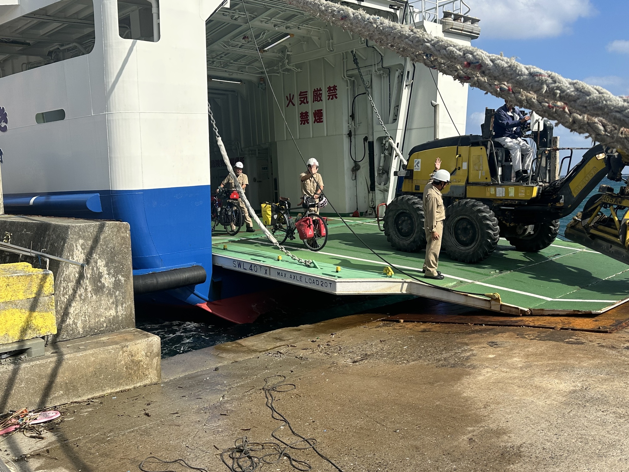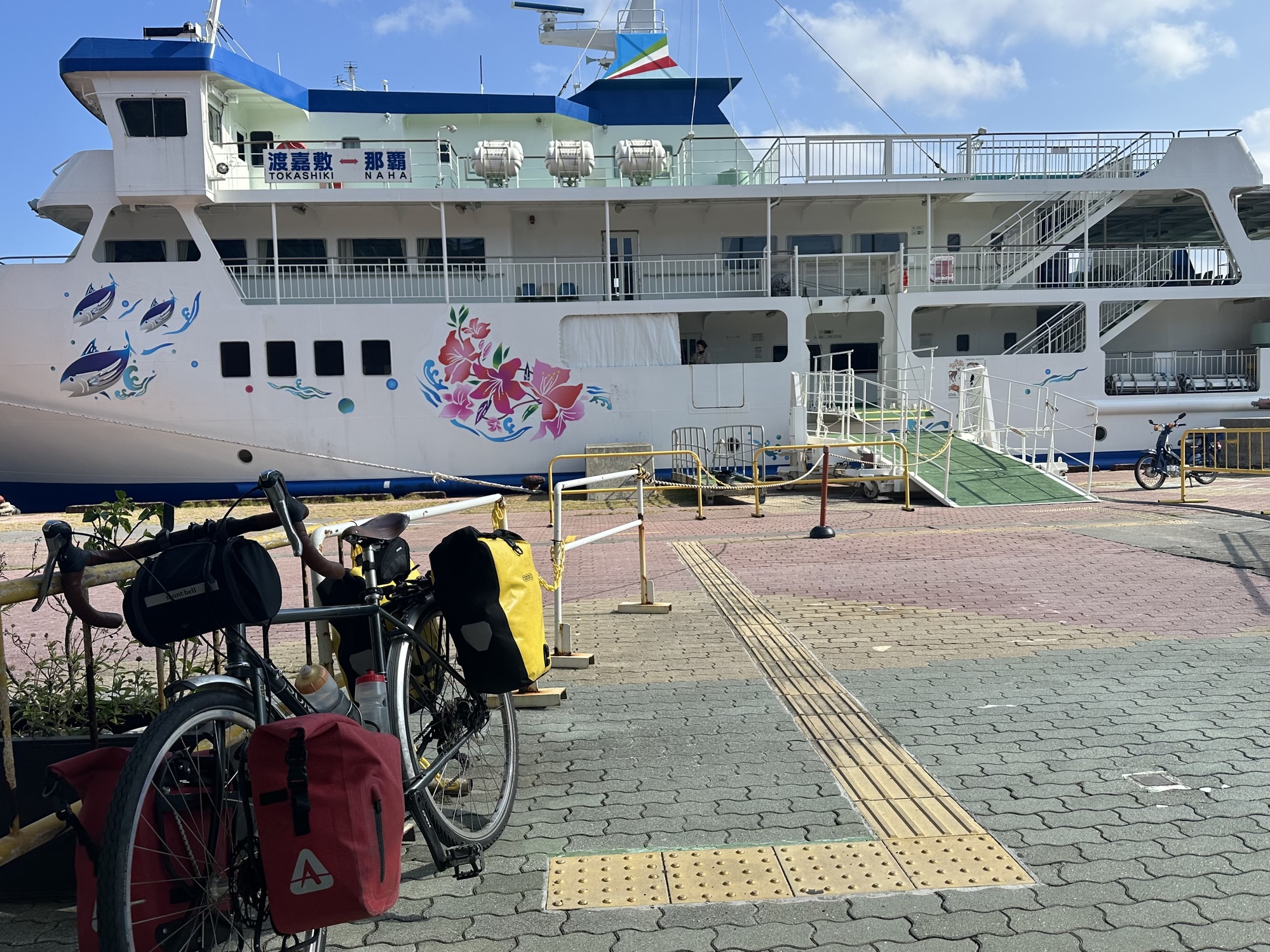 We got to the ferry terminal 9ish, and located the counter (each island had its own ferry company with its own counter) for Zamami, and asked for tickets. Nope. Needed a reservation. Hm. With glum thoughts of filling 2 more days in Naha in our heads, we went to the next counter for the Tokashiki ferry, which we thought was leaving at 9, but turned out to be 10. We could get tickets, but needed to fill out an application. So we did. Then we needed to get the bikes checked in and paid for at another office on the pier. Run around, find the office, pay the fee, get a form, leave the bikes, run back to the counter. Tickets in hand, we got the bikes handed off to the cargo guys and headed up the gangplank. Phew! Guess we’re going to an island after all. Not the one we planned, but…