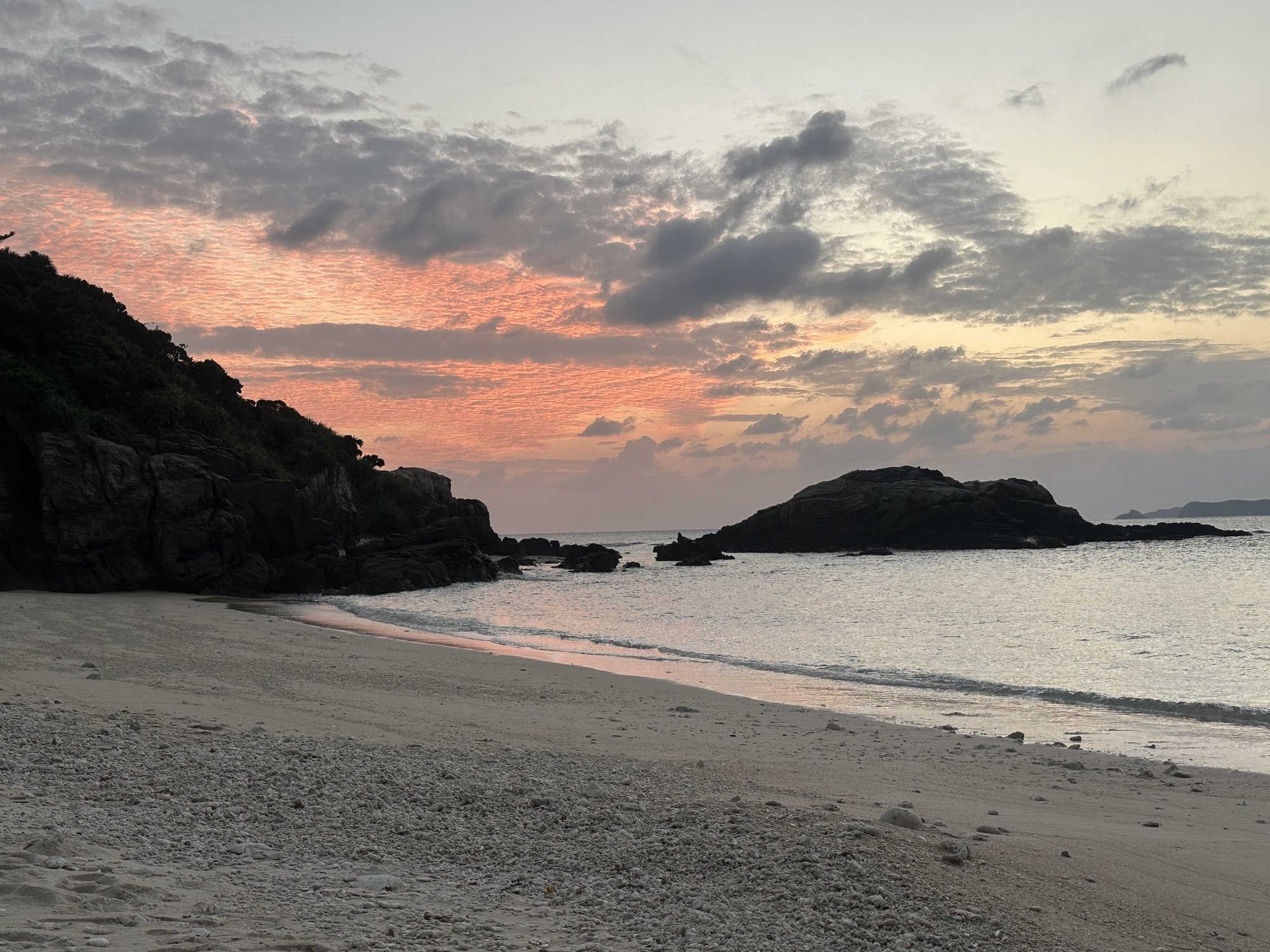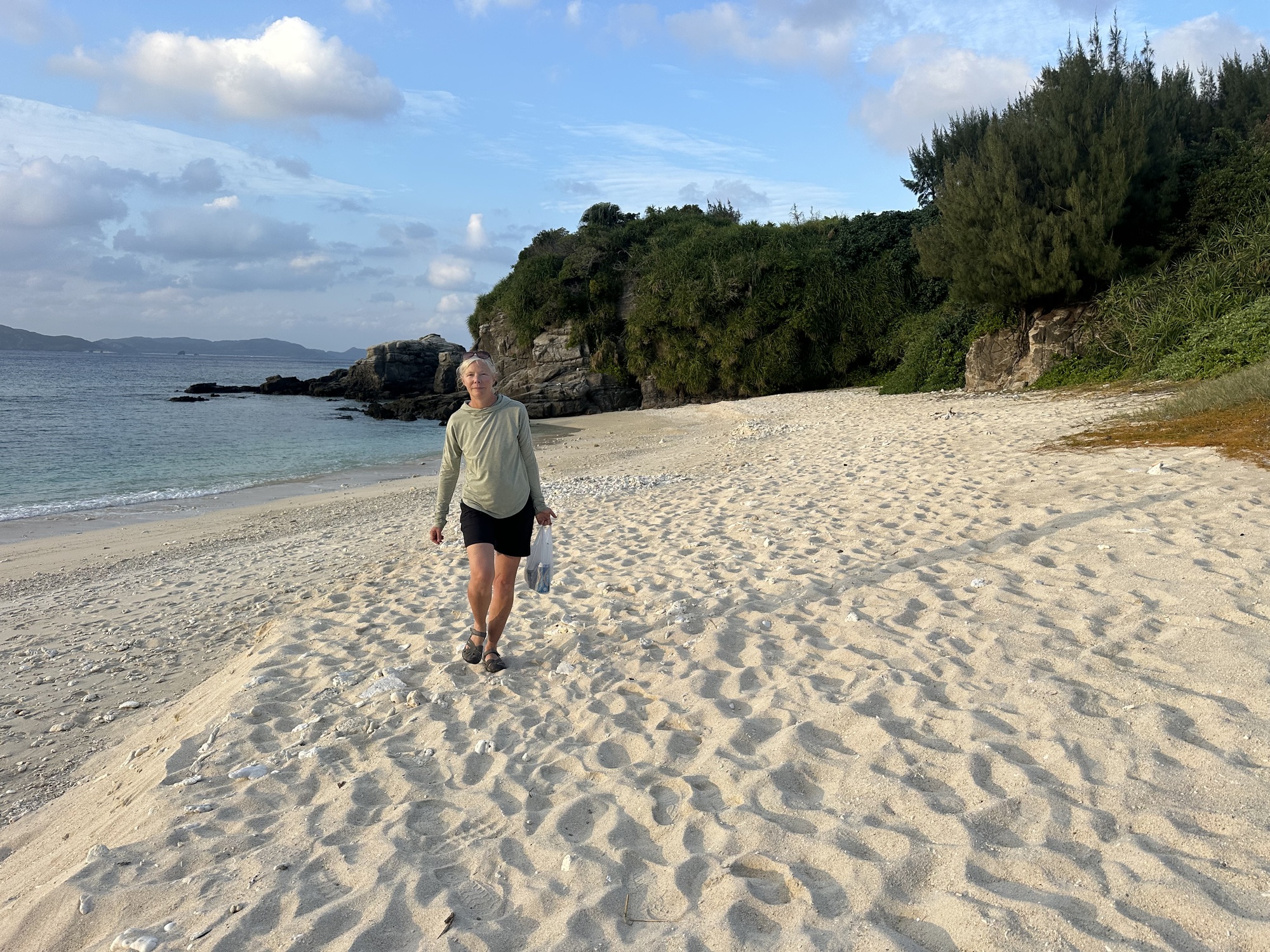 We were at Aheren far too soon after a sweaty climb and swooping descent. We found the campground, and set up not too far from the beach. The only other resident was a young backpacker from Saskatchewan, of all places. This is a nicer place to be in December than Regina. After that, there was some solid beach time. It was a stunningly beautiful spot, well worth the ferry trip. Most other beach goers were day trippers — the ferry arrived at 10:30 and returned to Naha at 3:30. Once the shuttle gathered them up there was almost no one around. A wander through town found most businesses, not that there were many, closed. Either they plied the lunch trade for the day trippers, or were closed for the season. We did find a place to serve us a couple of beers and some snacks. After that, it was a dinner of cup noodle on the beach and watching the sun go down.