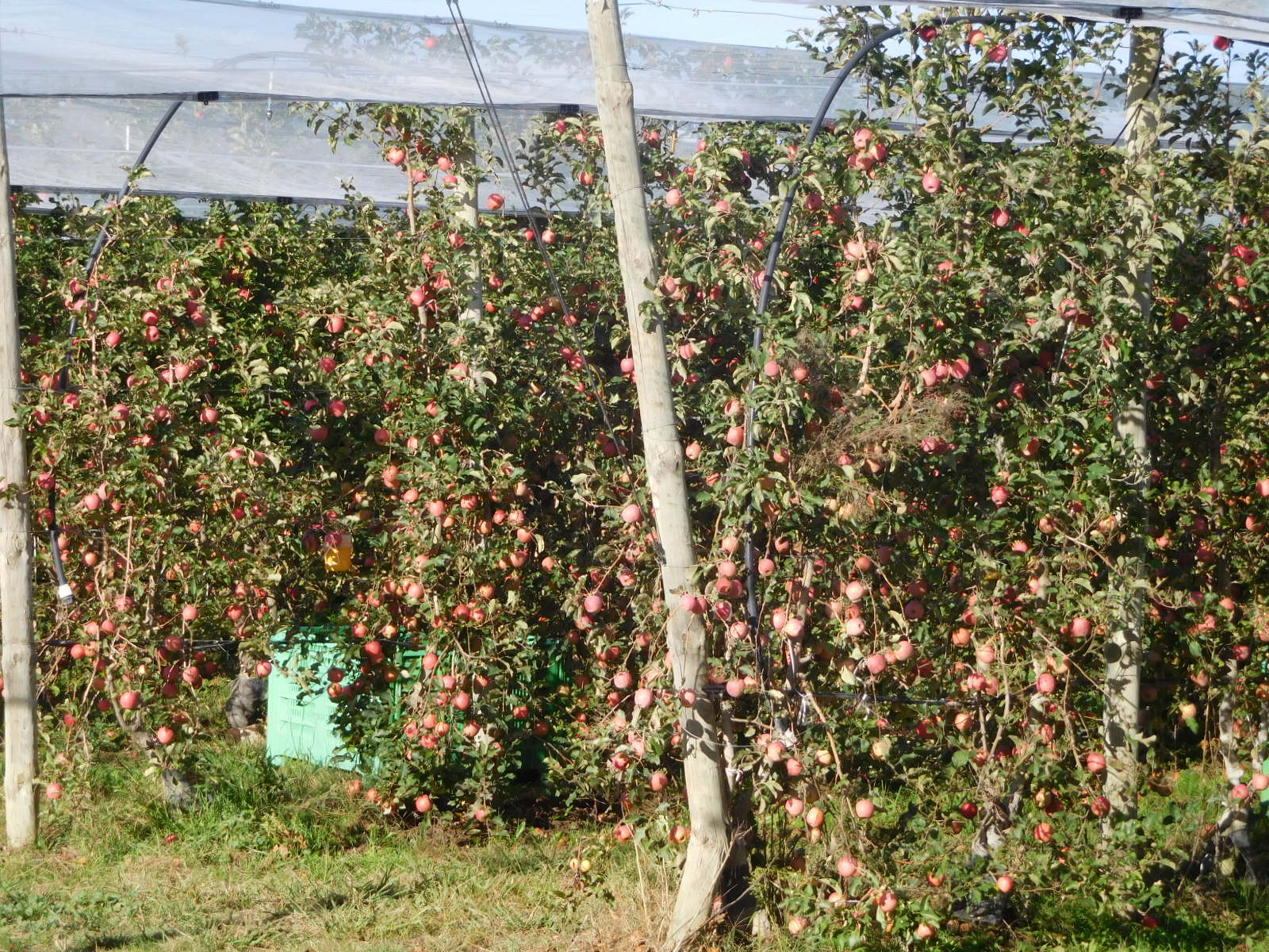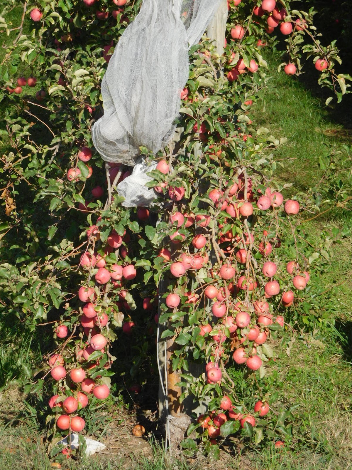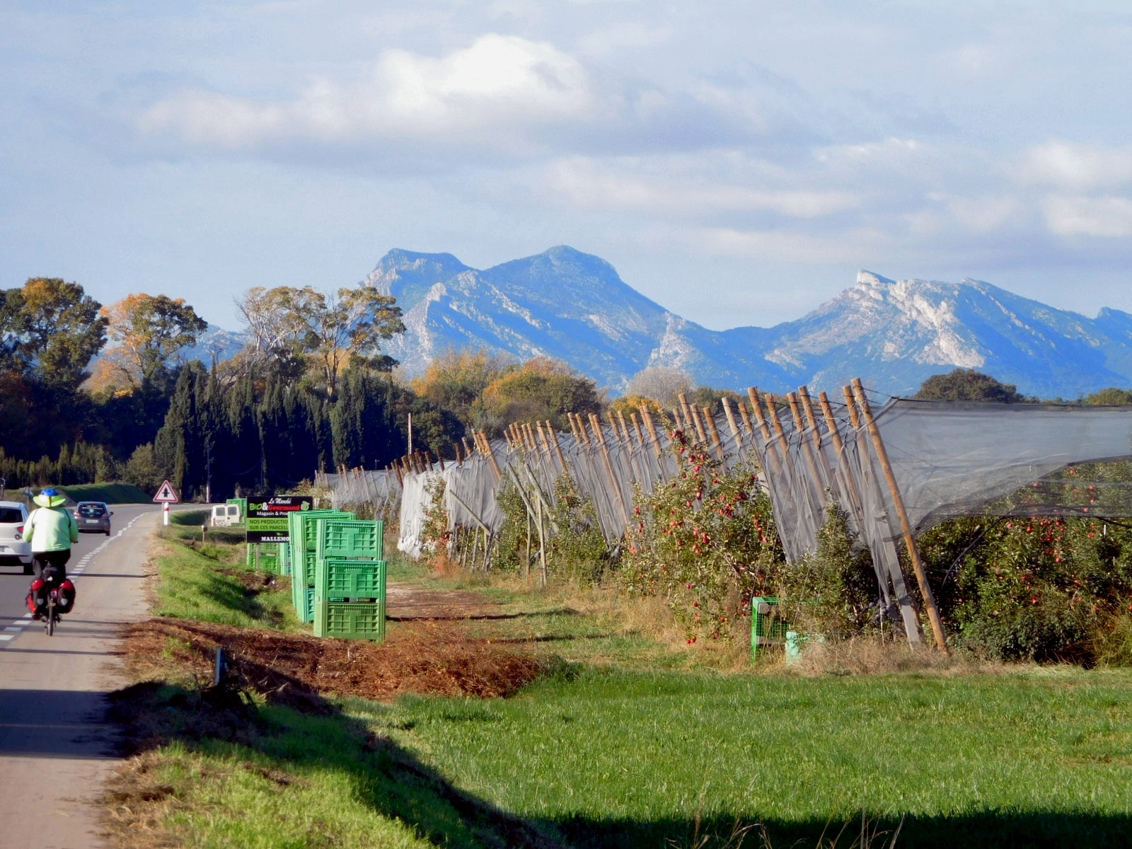 Here are the Alpilles again. But you can also see in the photo below a coule of other things. Dodie is riding a shoulder that is not at all bad, much like a Canadian highway. But there are also some cars in the picture, making things not very restful. Another thing is that the ride is passing an apple orchard, where picking is underway. Yes, they are Pink Ladies.