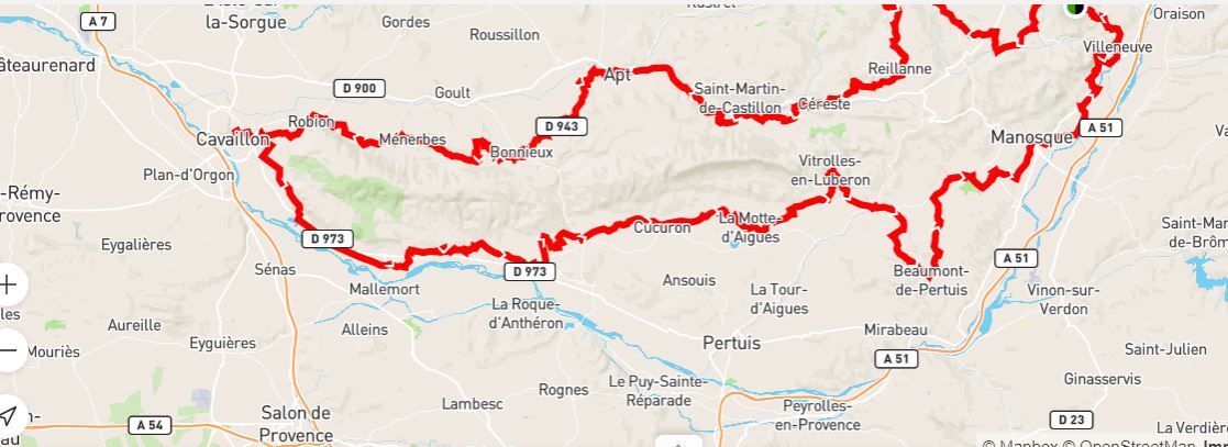 The Luberon is a mountain massif that would be about 240 km to go around. It is comprised of at least two sections, the "Petit" and the taller "Grand". You can see on the map below that we have been noodling out from Cavaillon in the extreme west, and visiting villages to the north of the mountains. But today it was time to dip into the southern loop, heading n the direction of Mallemort, which can be seen on the map below.
