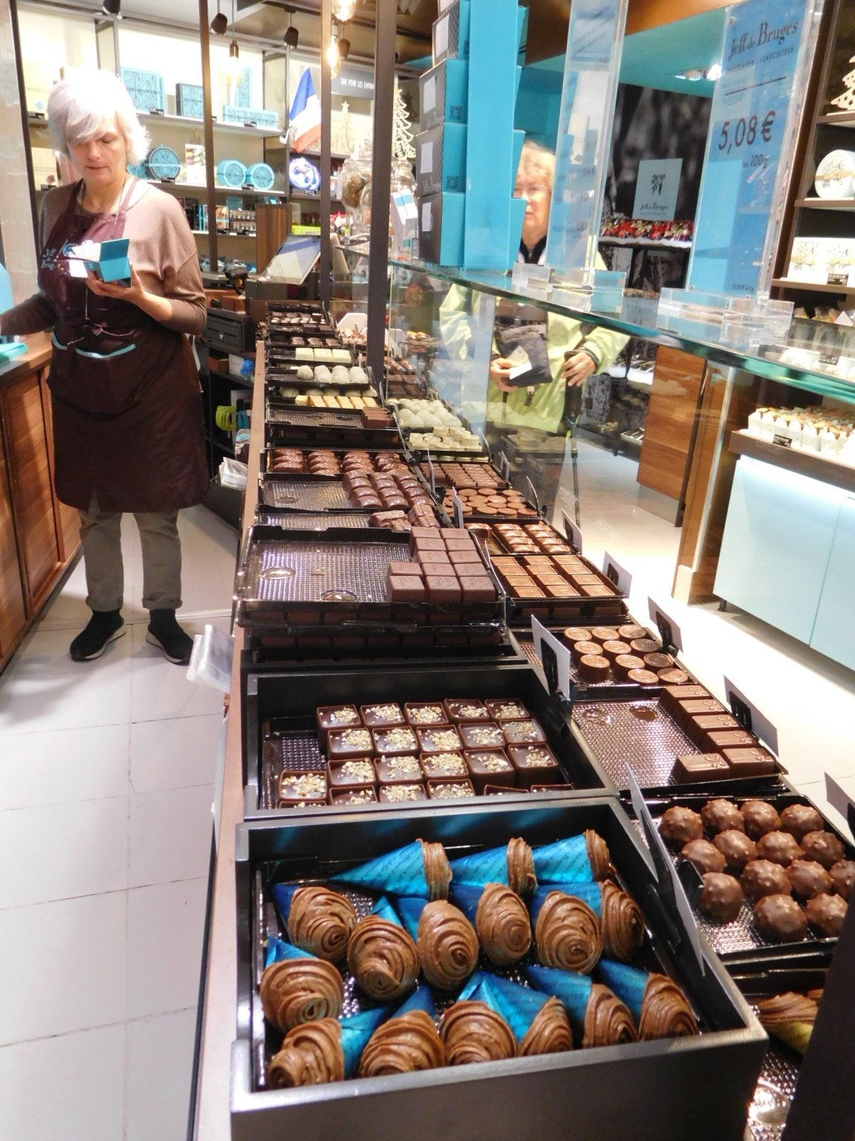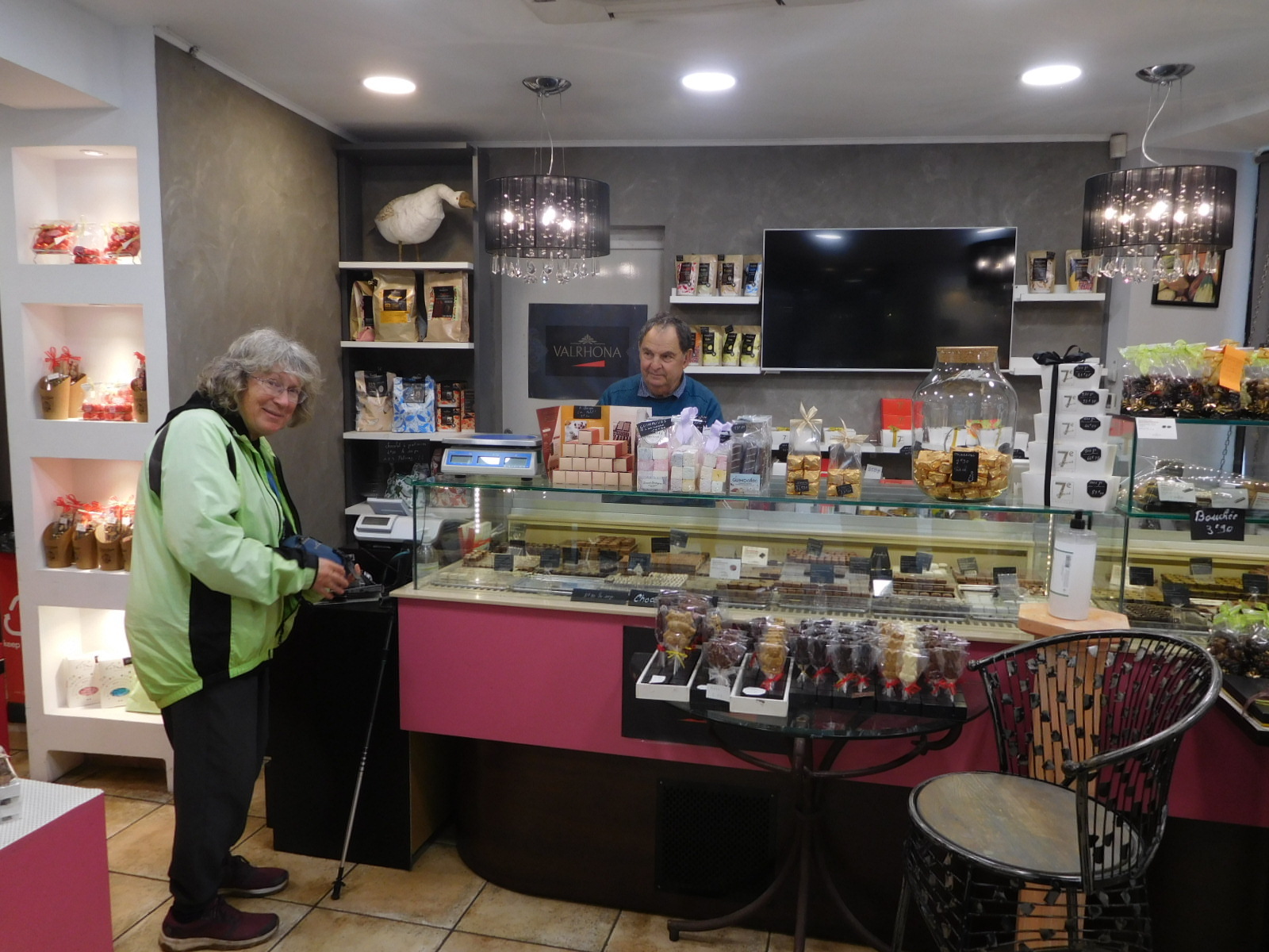 Among the high quality shops in town are chocolate shops. This is a little unusual, since chocolate has not seemed like a big thing here (vs nugat and candied fruit and callissons) since Valence, and Val Rhona chocolate city. Sure enough, the first one we popped in to specialized in Val Rhona. But then again they had some products that we had not seen even at Chocolate City. Next shop was something of a chain - Gregg du Bruge - but it looked darn good as well.