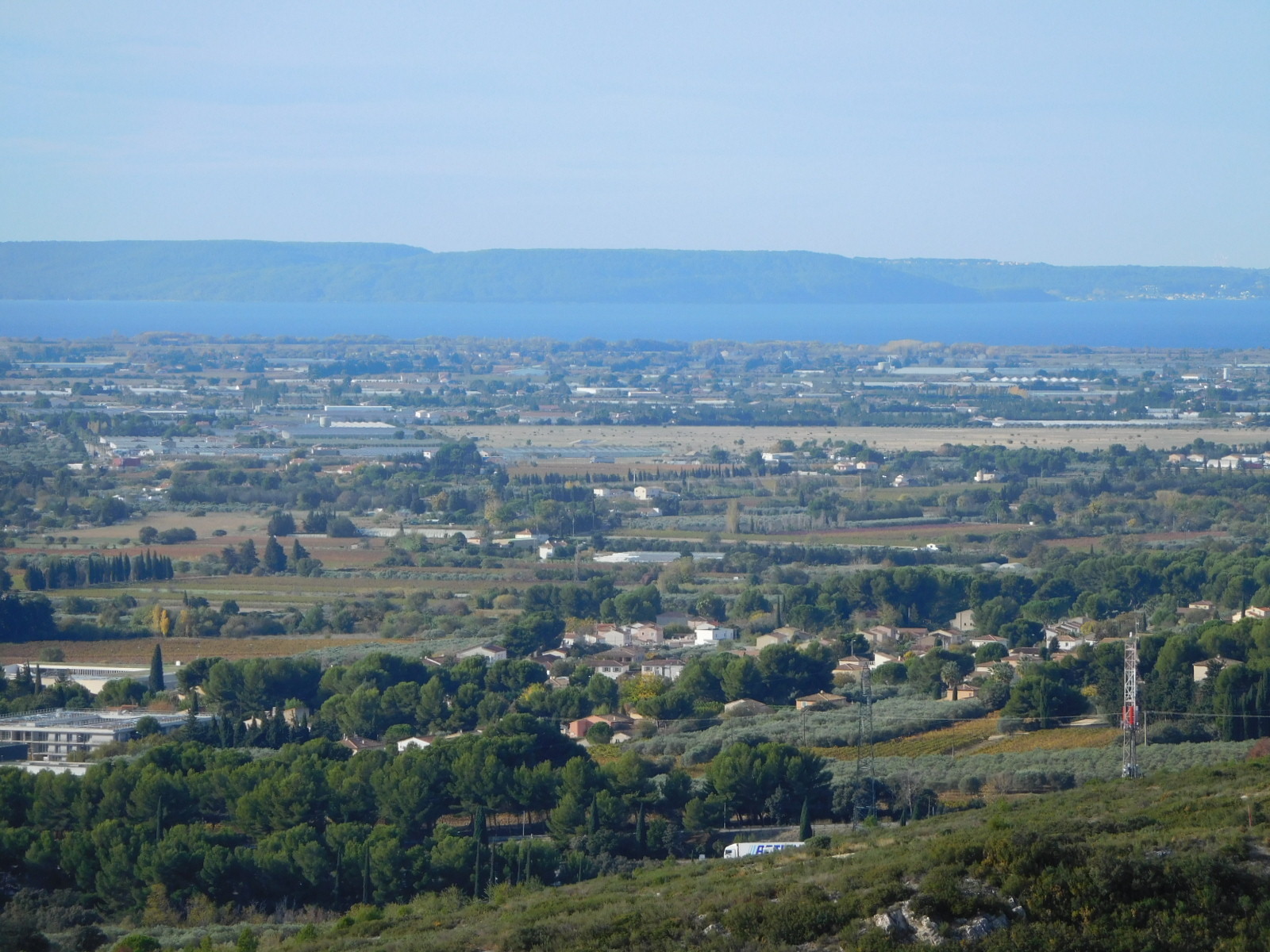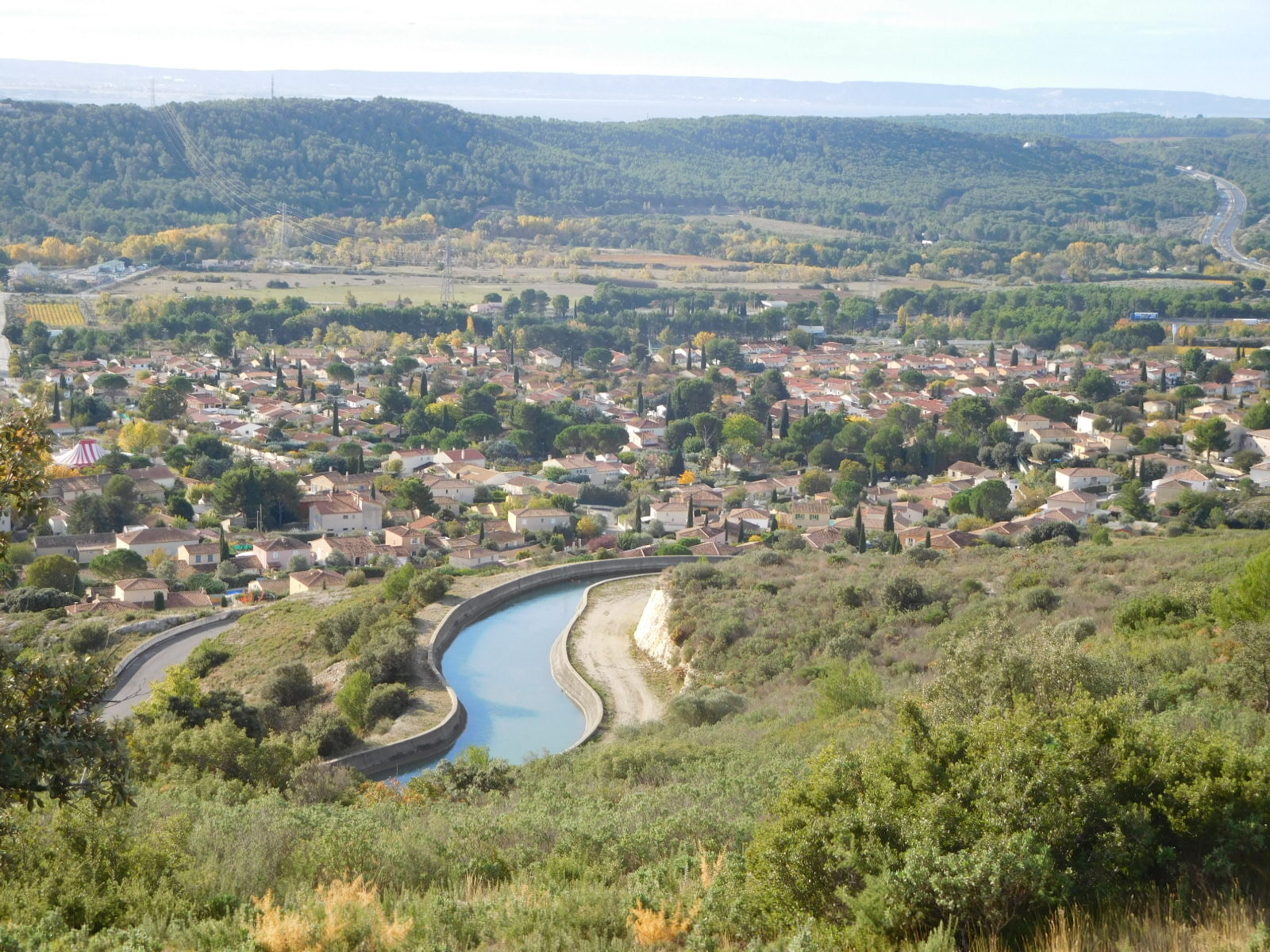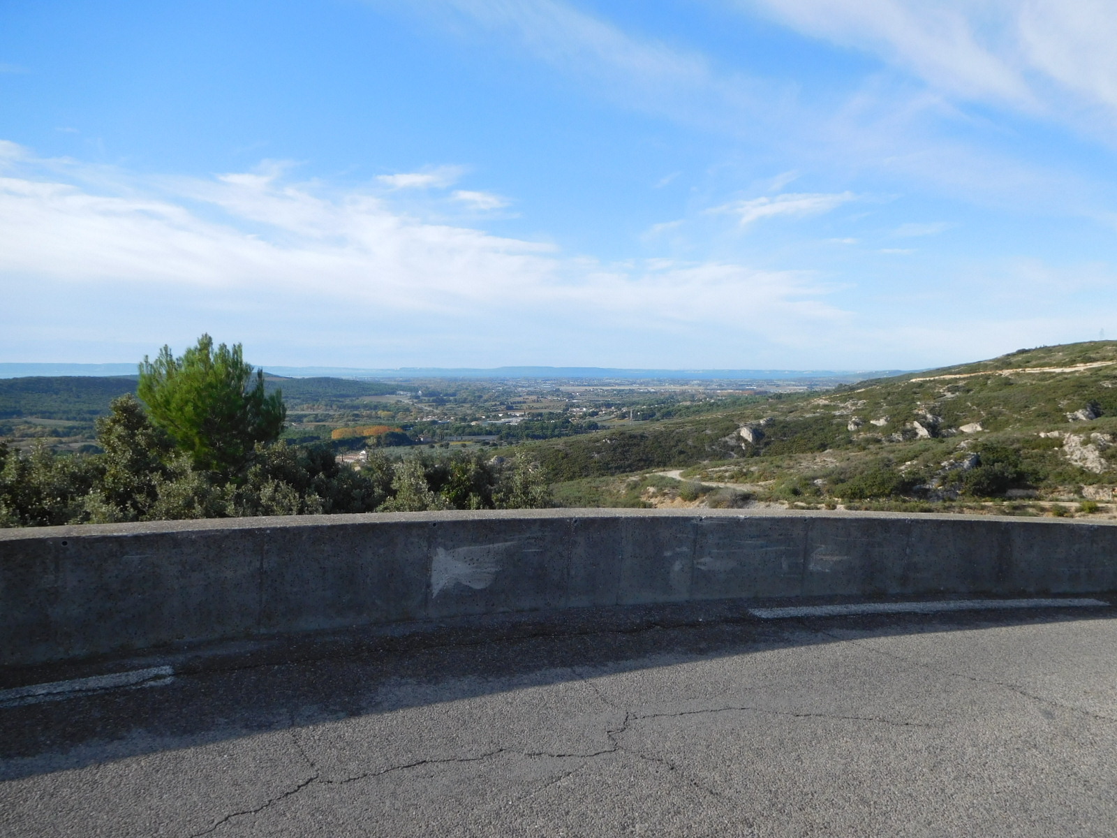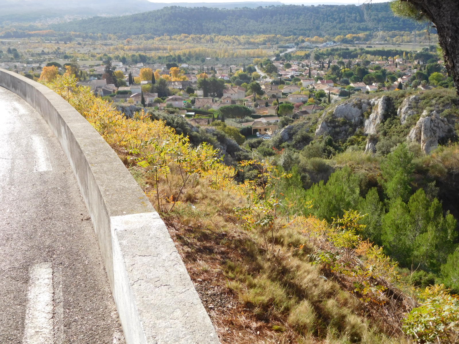 We knew the road had been climbing, of course, but were still surprised to come to an overlook where we could look down on a village and actually over to the sea. (Ok, fine, our geography stickler department points put this was nothing but the Berre Etang, 10 km from the actual sea.).