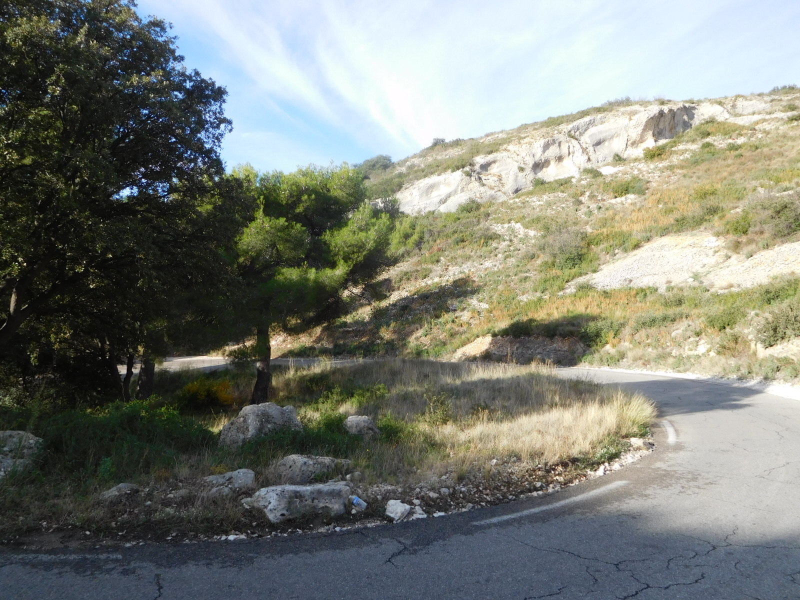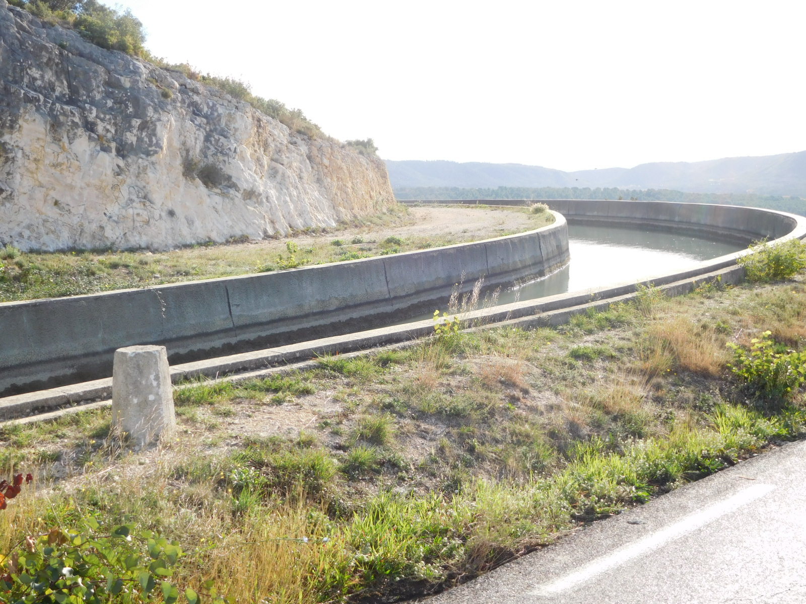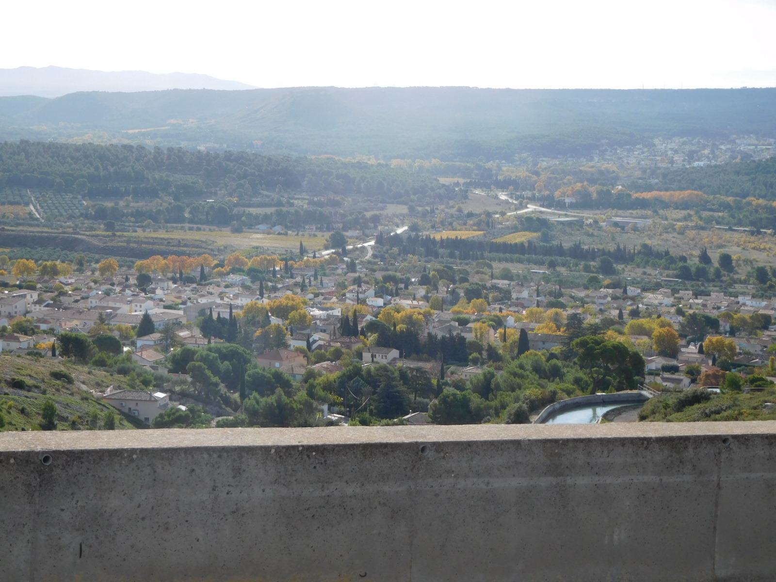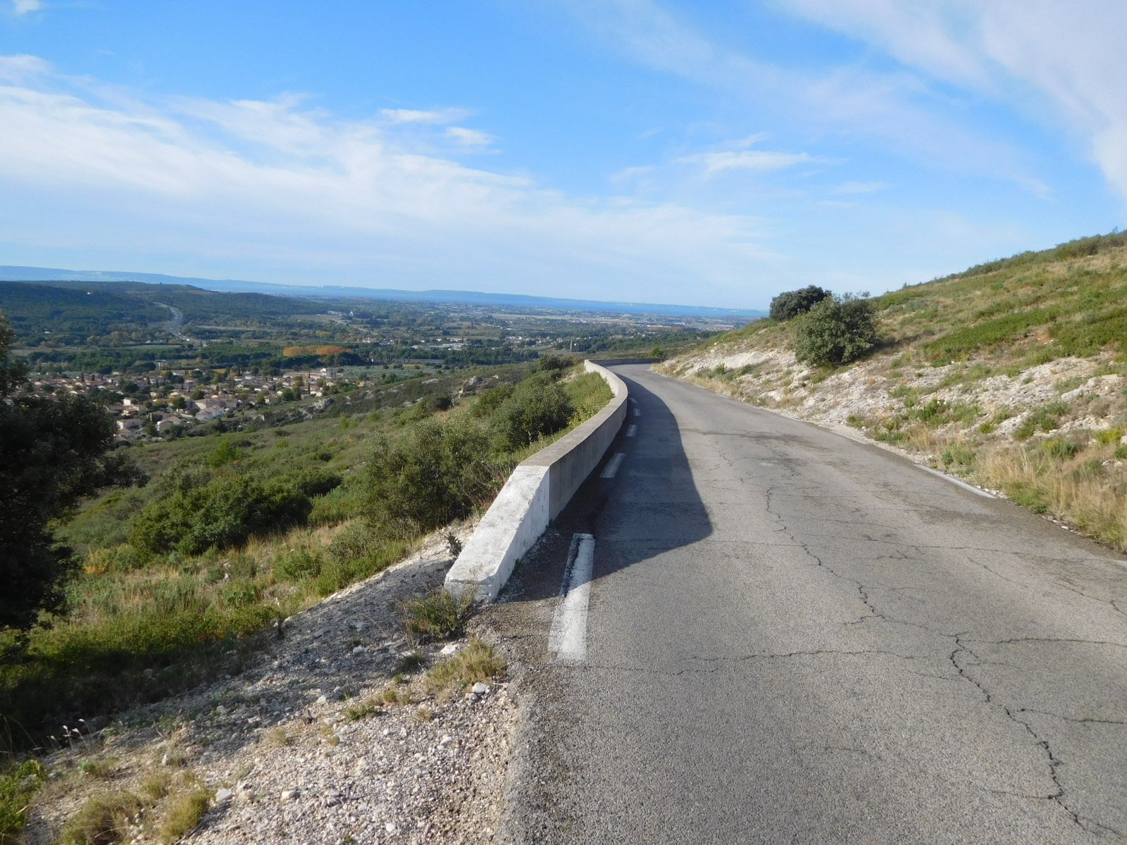 We knew the road had been climbing, of course, but were still surprised to come to an overlook where we could look down on a village and actually over to the sea. (Ok, fine, our geography stickler department points put this was nothing but the Berre Etang, 10 km from the actual sea.).