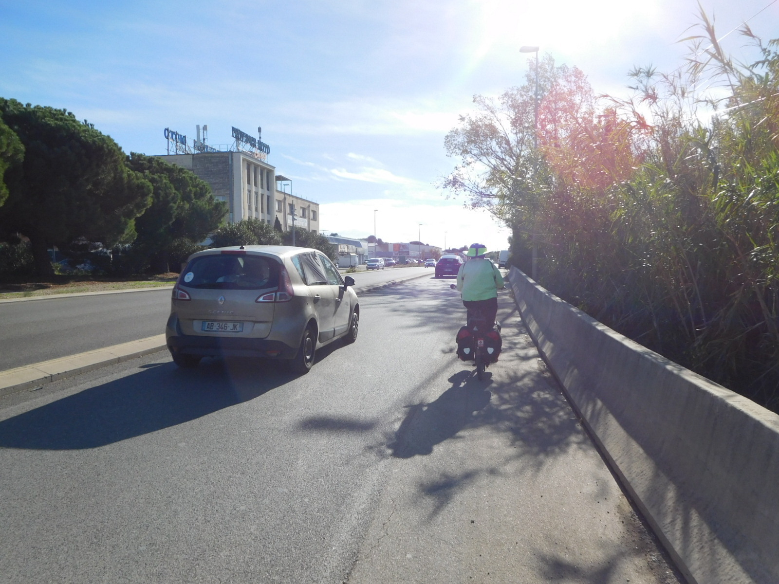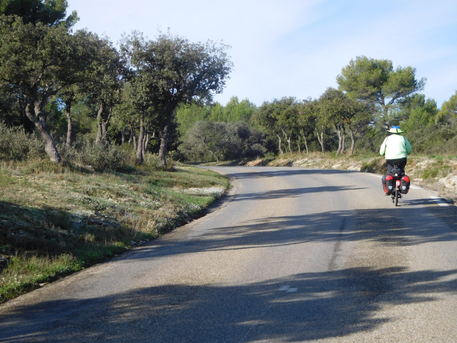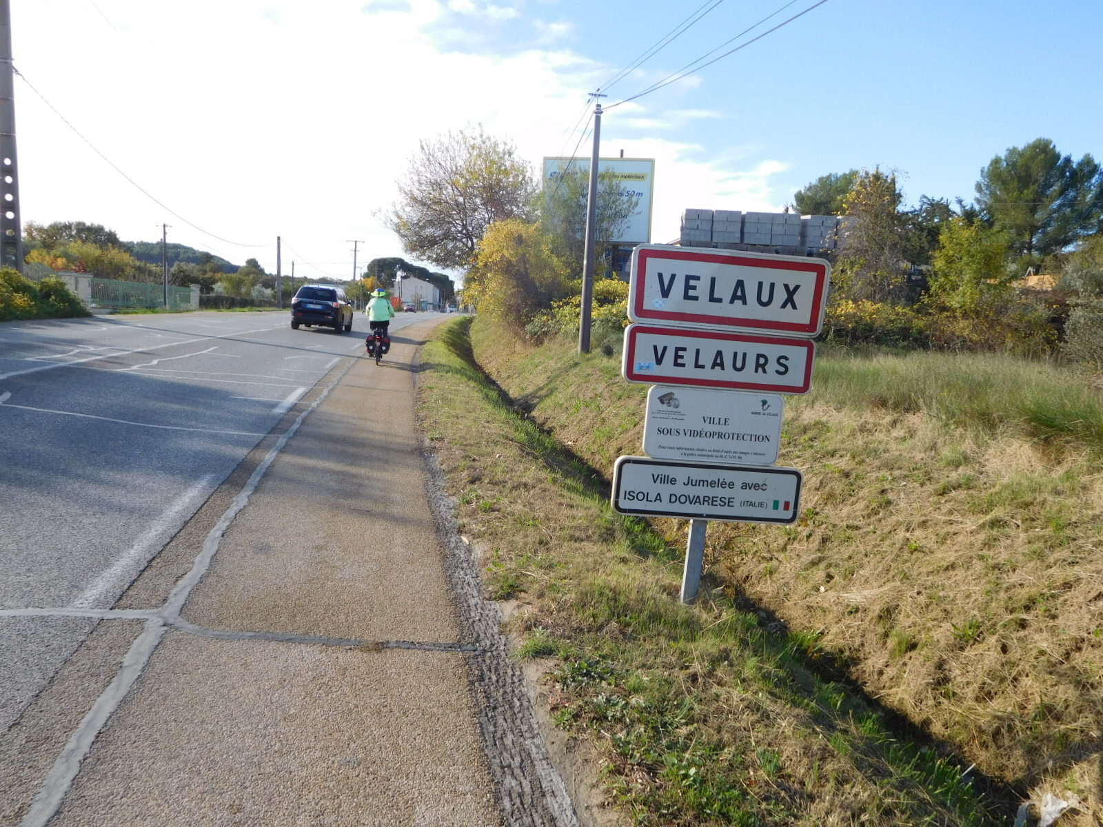 In Velaux we took a break, sending Dodie into an Aldi market while I as usual was left out with the bikes. Usually this becomes the occasion for a French lesson, as someone will approach me with the Usual Questions. This time someone did have questions, but they were addressed in very good English. They came from Vincent, who lives in Velaux, but who has a sister in San Diego. Vincent started out as a mountain biker but has now included road biking. The natural progression for him could be to cycle touring. That was the basis for many of his questions, and hopefully we are on the way to having another Cycleblazer.