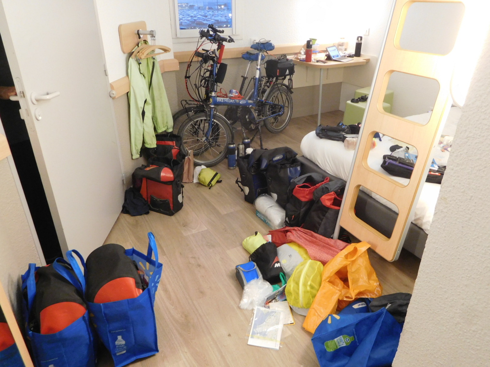 We have been in our upgraded room a few hours now. Dodie has been busy downgrading it. Or at least covering it with gear in the process of being reconfigured from riding to flying mode. We want to finish that tonight, so that tomorrow we can shuttle in to Marseille and check out - the museum - no, the cathedral - maybe - but mainly the market!