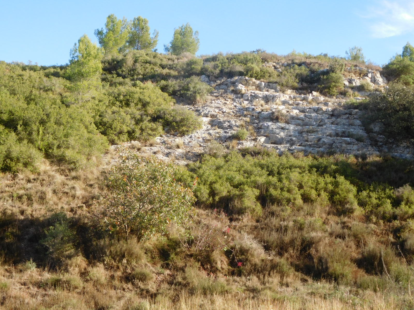 We had not been appreciating the Provence-ness of everything for long when we (Dodie!) realized that things had changed. Quite suddenly, really, we were surrounded by shrubby Mediterranean herbs like rosemary and thyme. Not only that, the vines were gone, the olives were gone, the Cypress was gone. We got off our bikes and walked into the scrub. Aromatic herbs were everywhere, and some plants were sporting thorns.