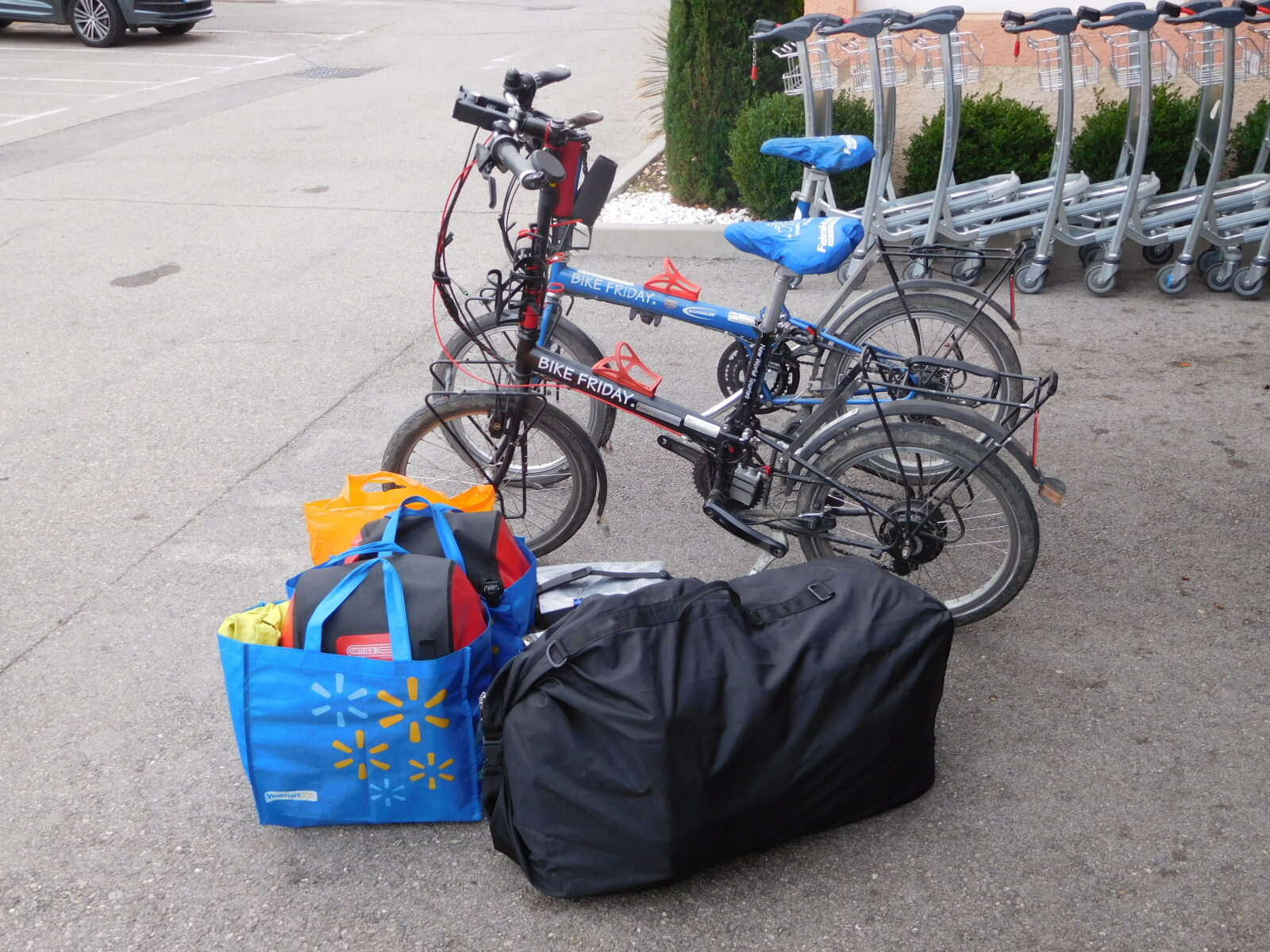 The Marseille airport Ibis hotel is no more than one km from the terminal, but one would not want to walk that with a pile of luggage. That's why we were careful to make sure they had a shuttle before booking. When we arrived, we were concerned to see that the shuttle was a seven passenger van, mostly filled with seats. So it seemed to us that loading in our stuff plus the bikes and any possible other passengers plus their stuff was not going to work. That set us to scheming, and our plan was to have me walk the bikes over while Dodie would go with the luggage in the shuttle.