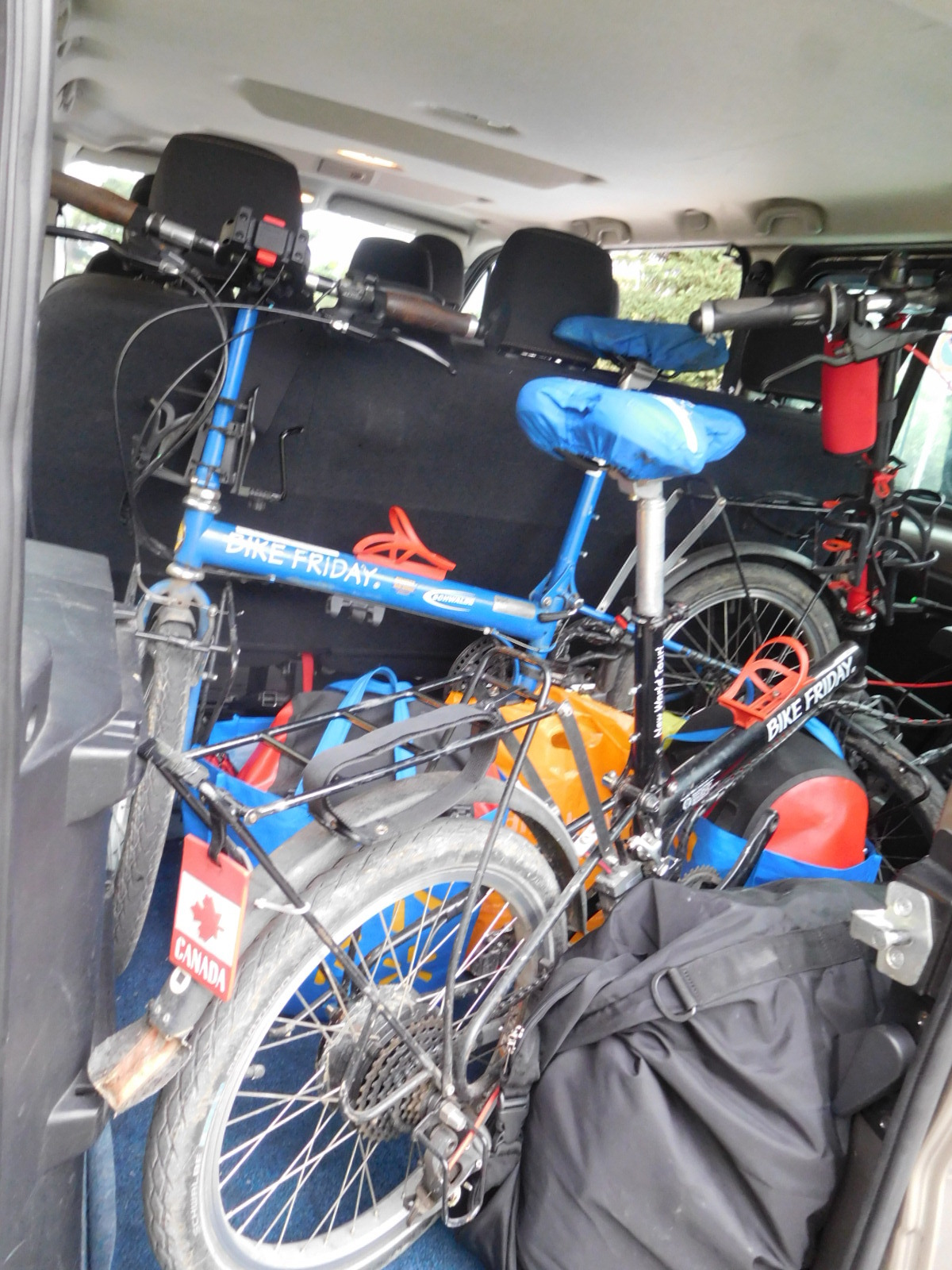 When the time came to reserve our shuttle time, I explained our scheme, and they responded by allocating the whole shuttle just for us. With that and some jockeying, all our stuff plus the bikes went in!
