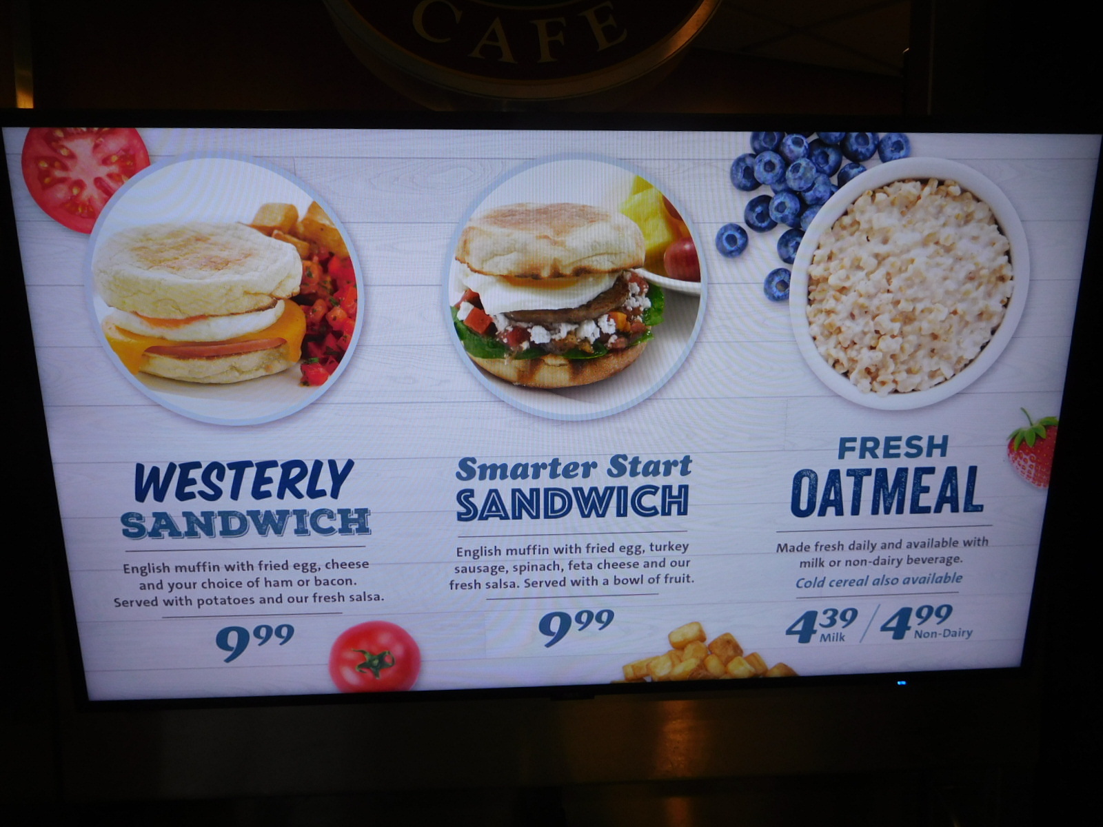Clearly, the "All Aboard" was the choice for me, though Dodie pointed out that this was almost identical to a "Full English". Dodie prefers oatmeal, which as you see, was available. The price was 10x our usual ploy of the packet of instant with some boiling water, but availability is worth a lot.