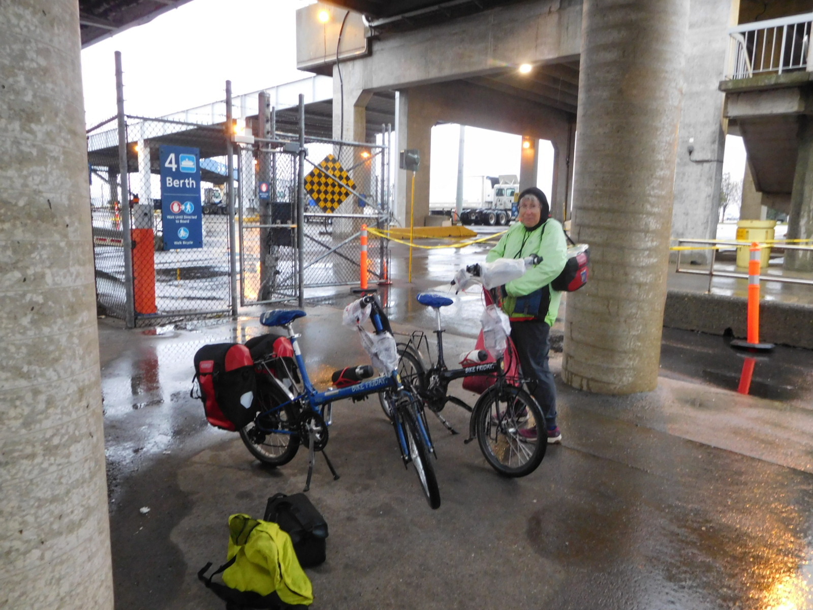 True to form, Patrick and us were ready to leave for the 9:00 a.m. ferry, at 7:30. Theoretically the ride is 20 minutes. Dodie had spent part of the night thinking about how to handle the bikes and our gear at the ferry terminal. I'll describe the issue here for a bit, since no doubt on a future trip we will be wondering how we did it!