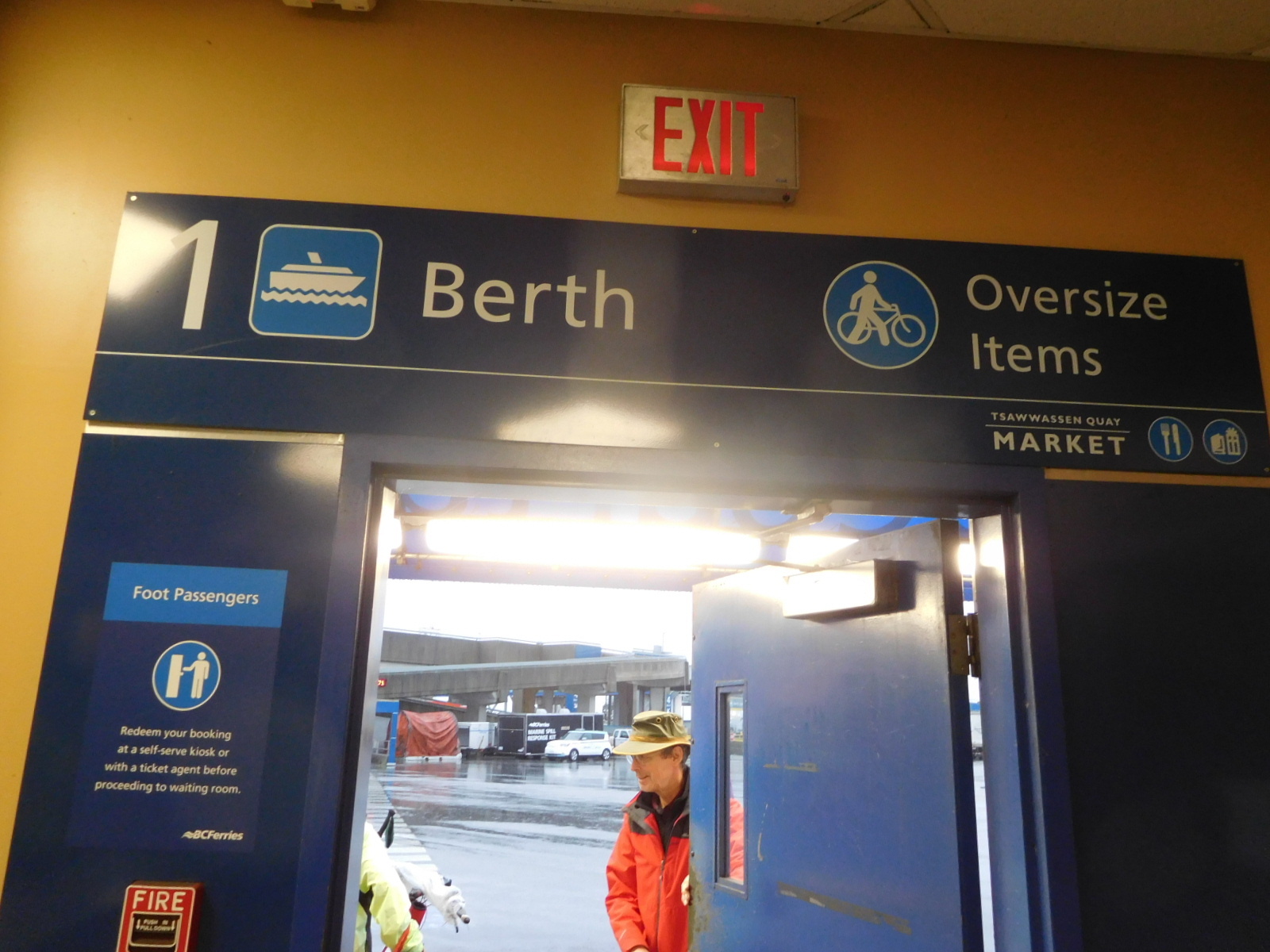 The ferry has no carts, but they do have a way for heavy bags to be deposited by walk ons, to be picked up at the other end. Walk ons follow a different path onto the boat from cars, and cyclists usually go with the cars (or actually, with the big trucks). We were a hybrid case - part cyclists, by virtue of having objects that somewhat resemble bicycles with us, and walk ons, by virtue of dragging a huge duffel bag in my arms.