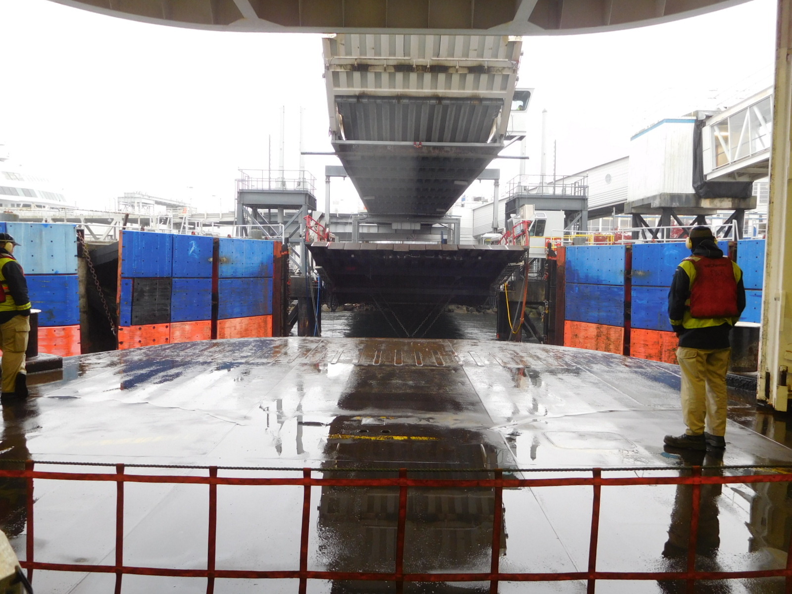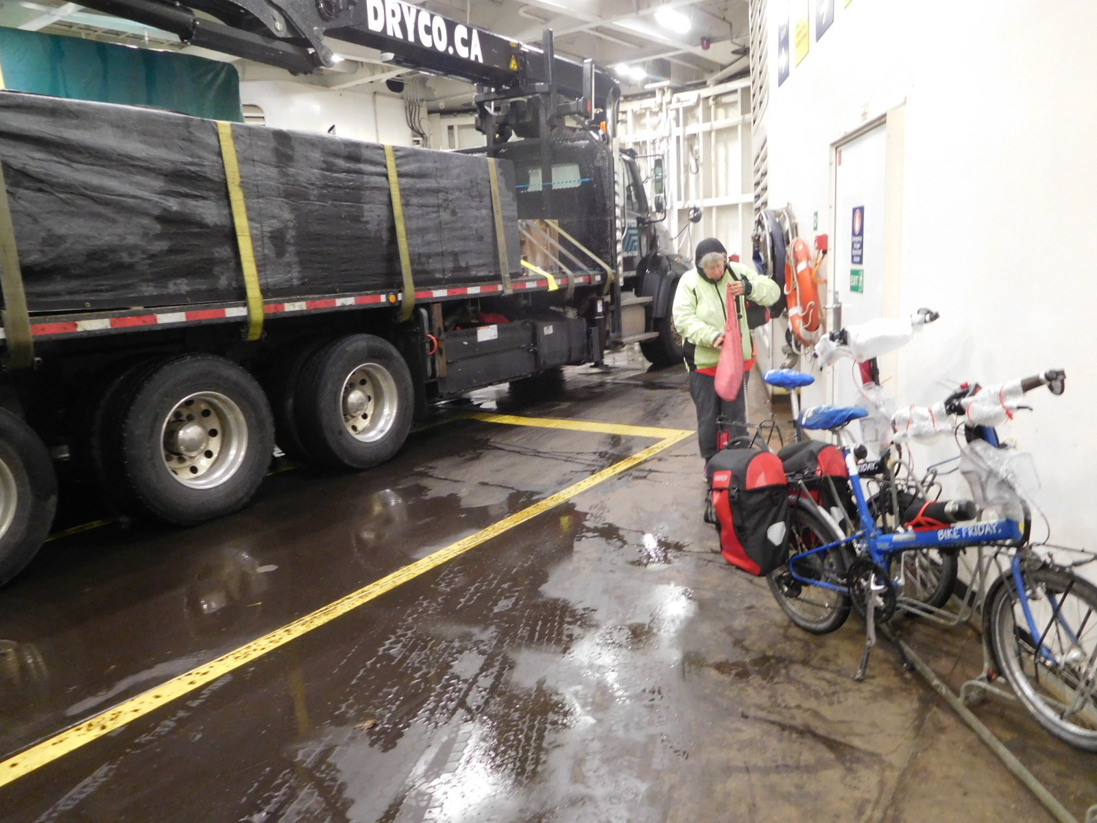 But in this case the bikes could still roll, so they got to go park with the trucks. The good part was that there was a quite direct pathway from the walk on area to the correct vehicle deck. That allowed us to drop the duffel bag as if we were walk ons and then proceed to the vehicle deck, like vehicles.