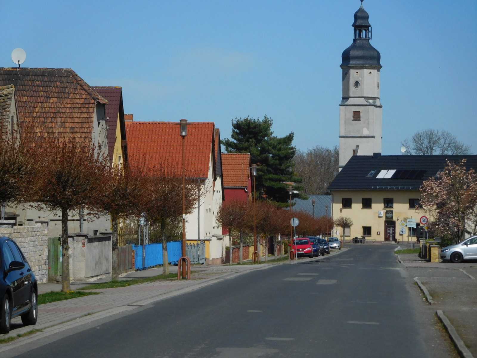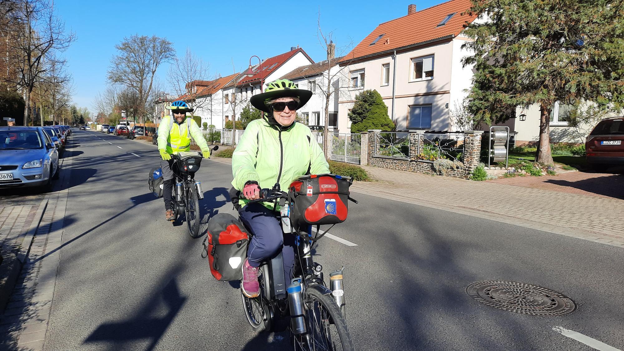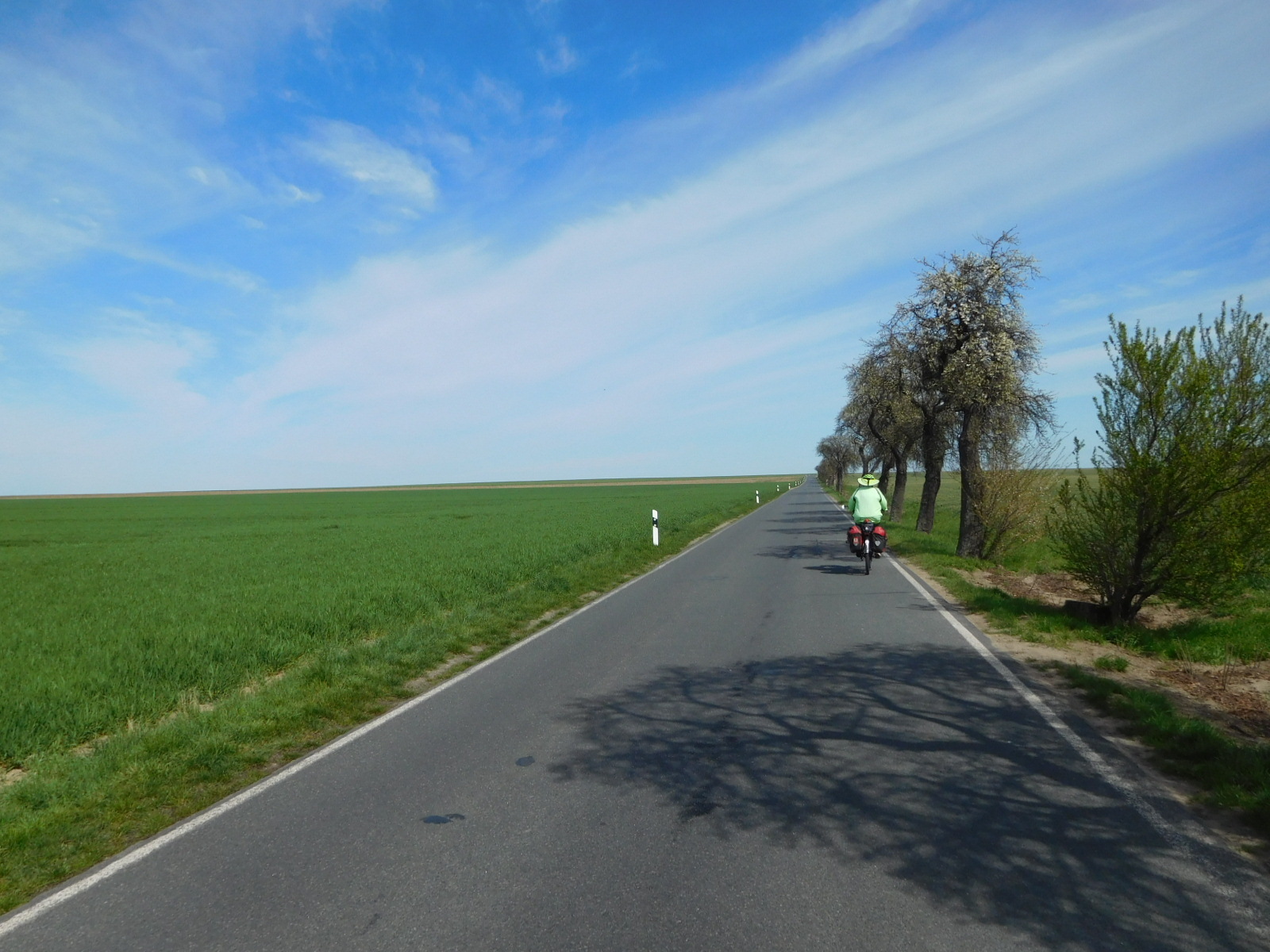 It didn't really take long to pass through Leipzig. What followed was reslly a pleasant surprise. We found ourselves passing through farm fields, with tiny towns spaced 2 km apart. The roads from town to town were that type where you might believe you were on a fairly wide bike path, but the passage of an occasional car verifies that it's actually a road. All around were the signs of Spring, with Easter flowers in the towns, it was really pleasant.