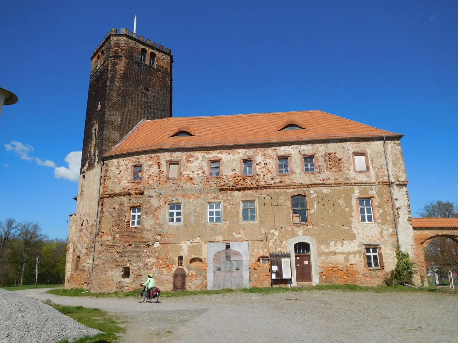 The Pension am Steinberg was the first place we found on route after Bad Duben, where there were apparently no vacancies this Easter Sunday. This stretched our day to 73 km, which was more than I would have liked for a first time out. Dodie just kept on truckin', but by 60 km every patch of grass began to look like a great place for a nap to me! Some might scoff at this pitiful display, particularly since we are riding e-bikes. But you know, the bikes are darn heavy, and with the minimal assist that we use on them, the e-bike effect is really very limited. Right now I feel like I have pedaled a fairly heavy bike a fairly long distance.