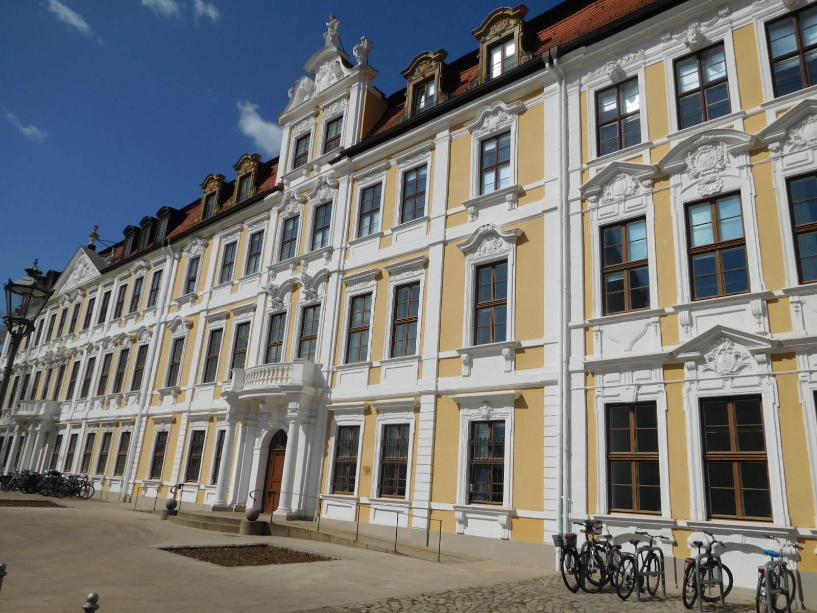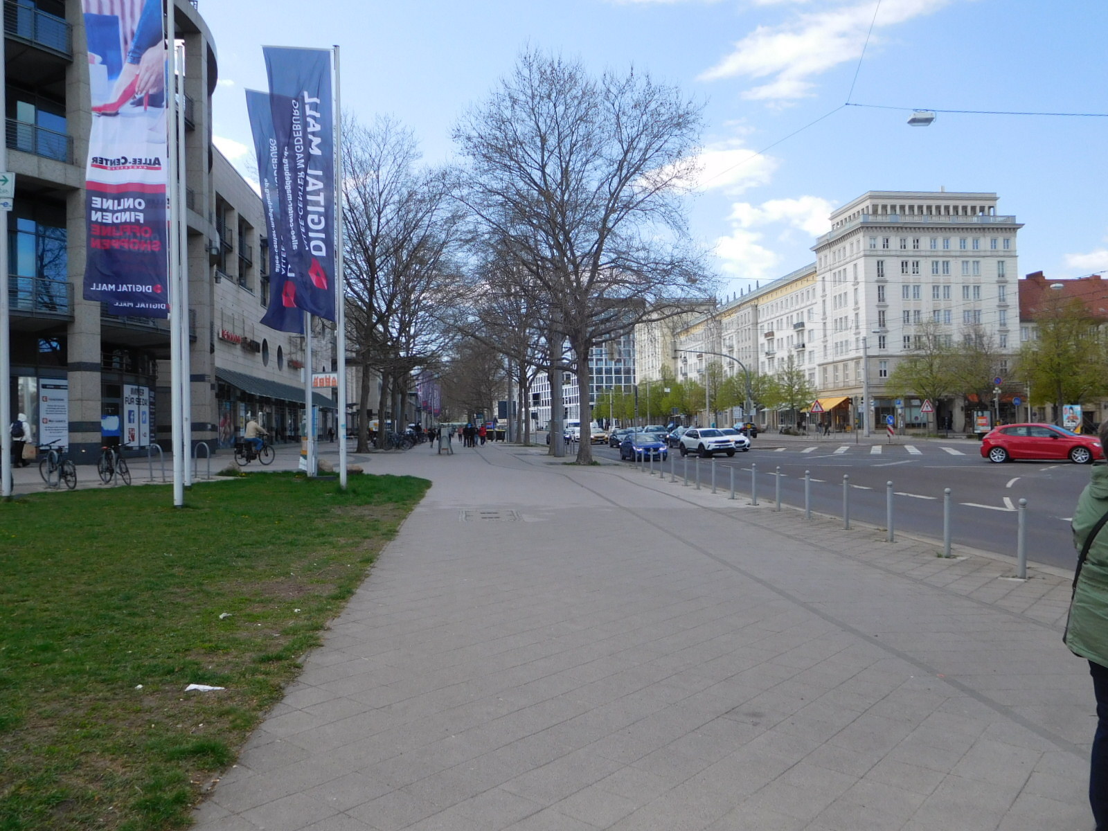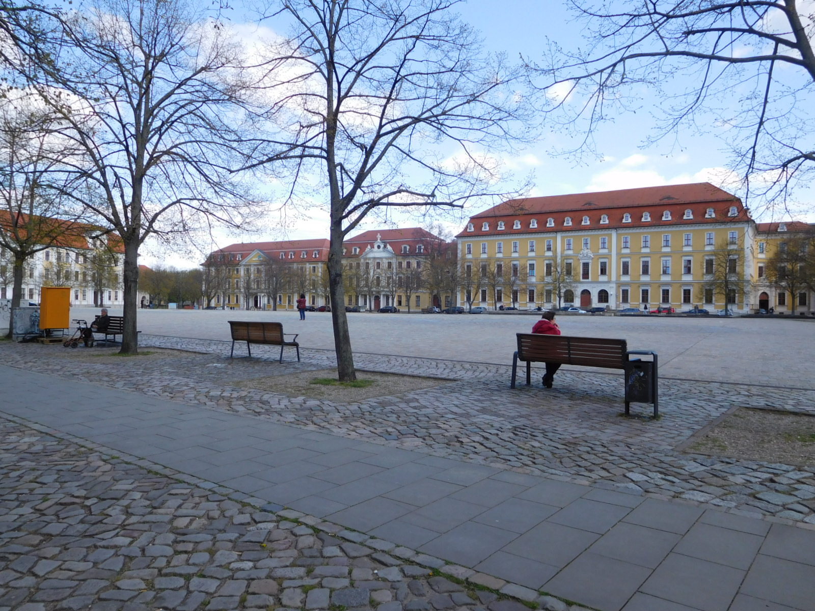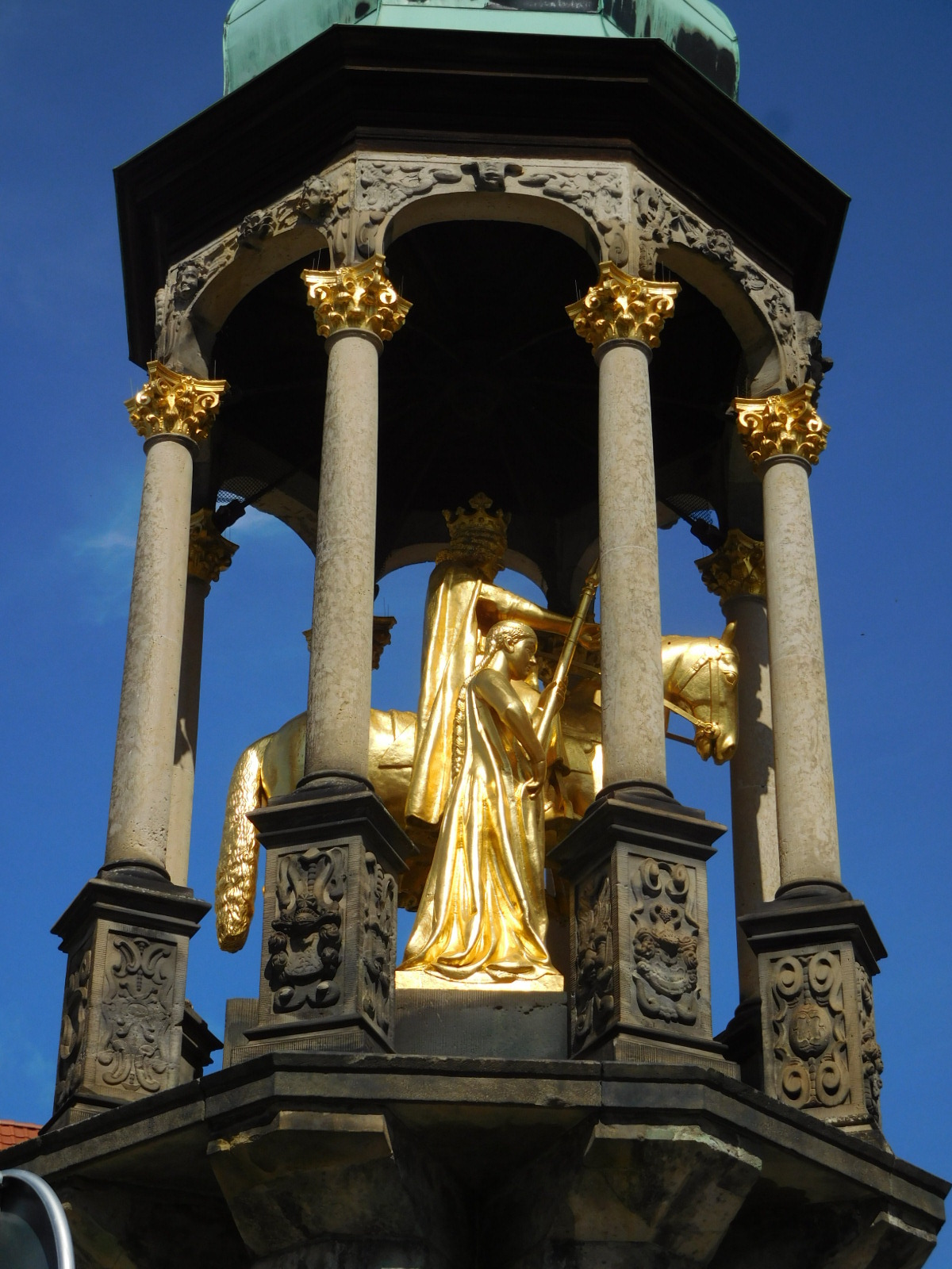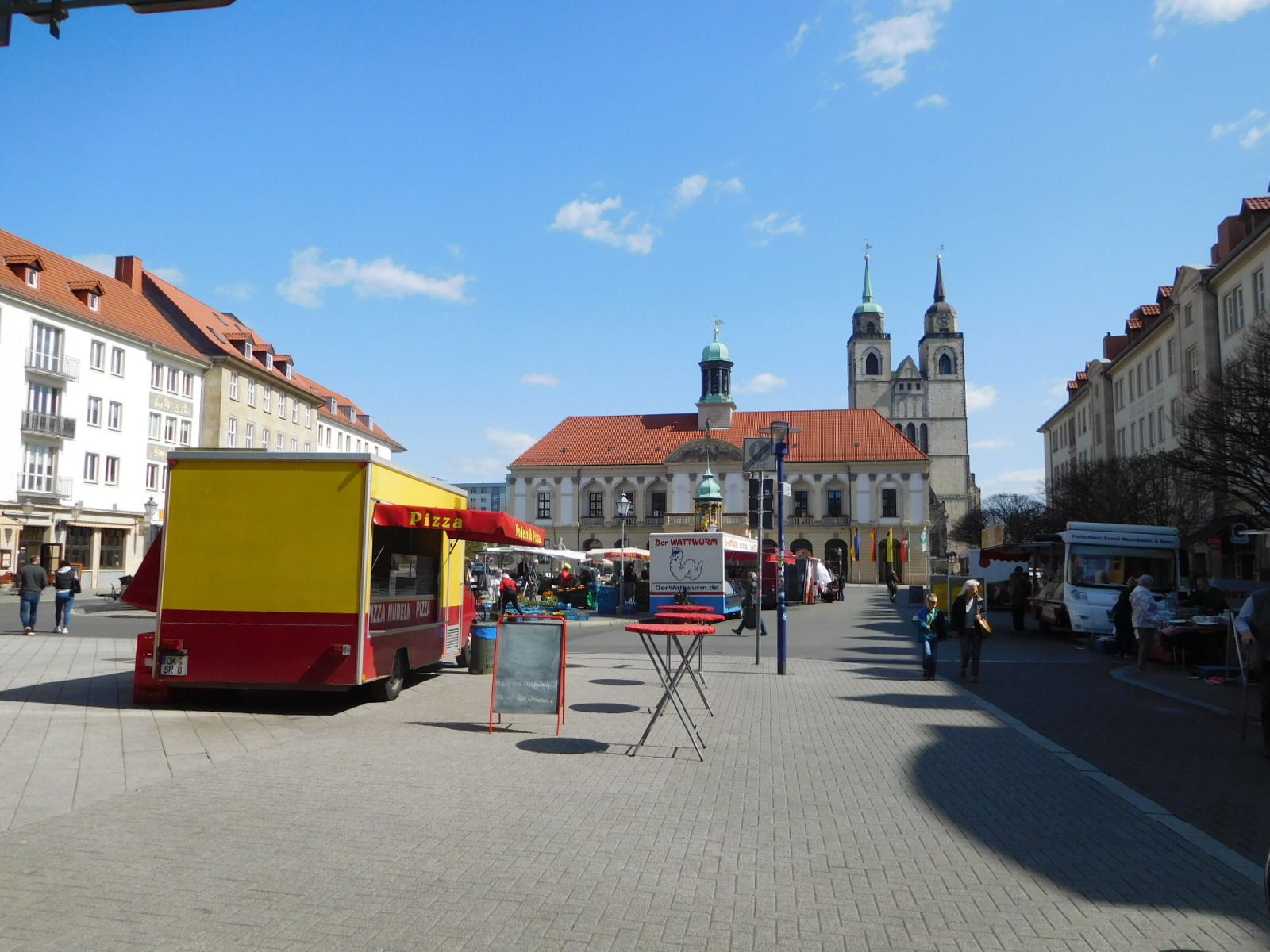 It seems to us that the main axis of Magdeburg was the Dom square to the Markt Platz. The Markt Platz turned out to be another fairly large and open space, on this day partly filled with vendors. At one end is a golden statue, the Magdeburg Ritter, and there is a two tower church overseeing the scene.
