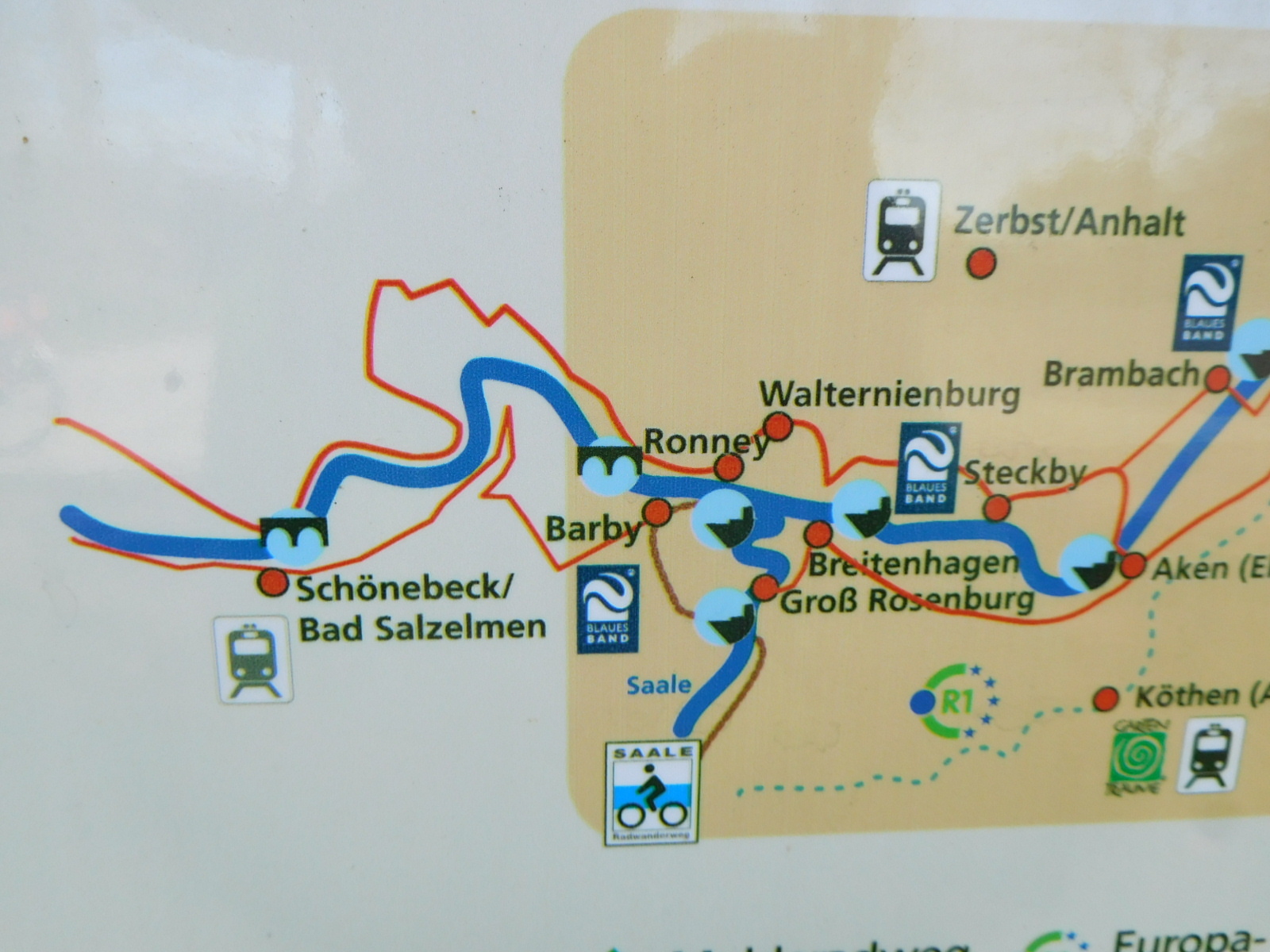 The landscape through which are travelling is just about as green and pleasant (and flat) as you could imagine, with the Elbe River and various small lakes often in sight. Just beyond where we spent the night, the Saale River joins the Elbe. The Saale is a sort of familiar name, and no doubt it has a radweg, but we know nothing about it. It's intriguing to think that one day we will find out.