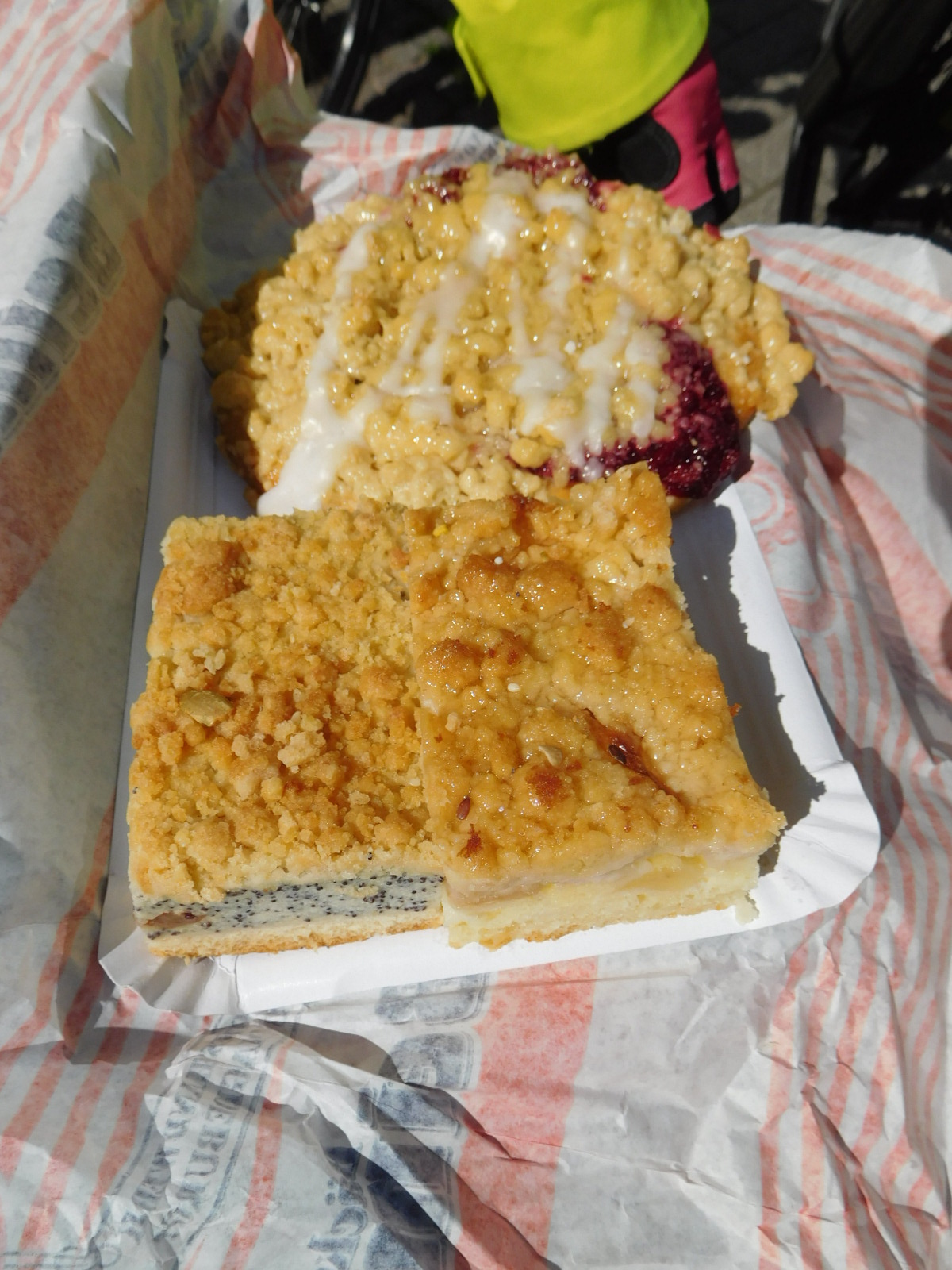 We were able to get some nice kuchen from the one bakery truck that was among the vendors. These included one with poppy seeds in a cheese like filling, and there was a fruit plunder, and an apple square. These were all very good.
