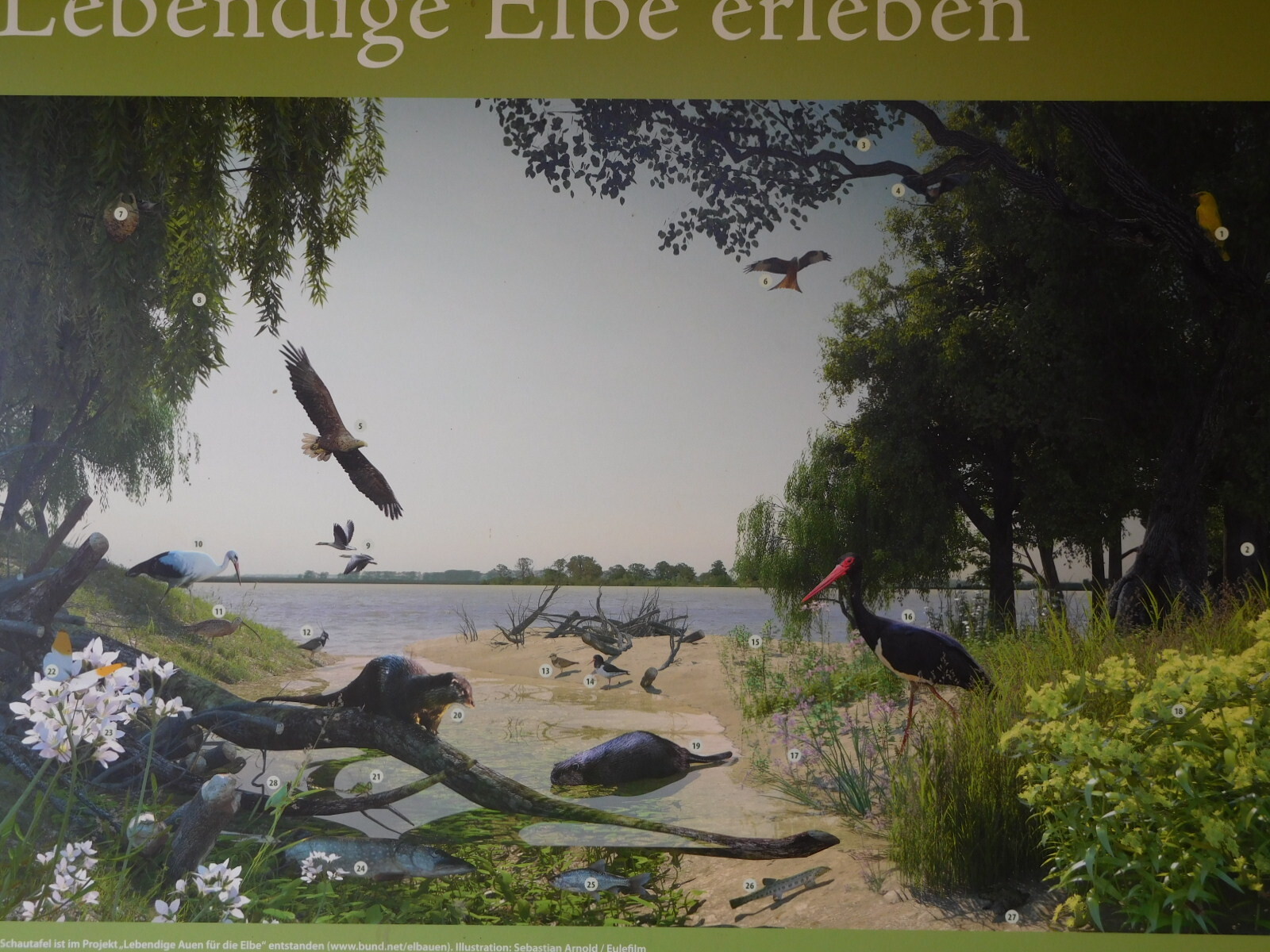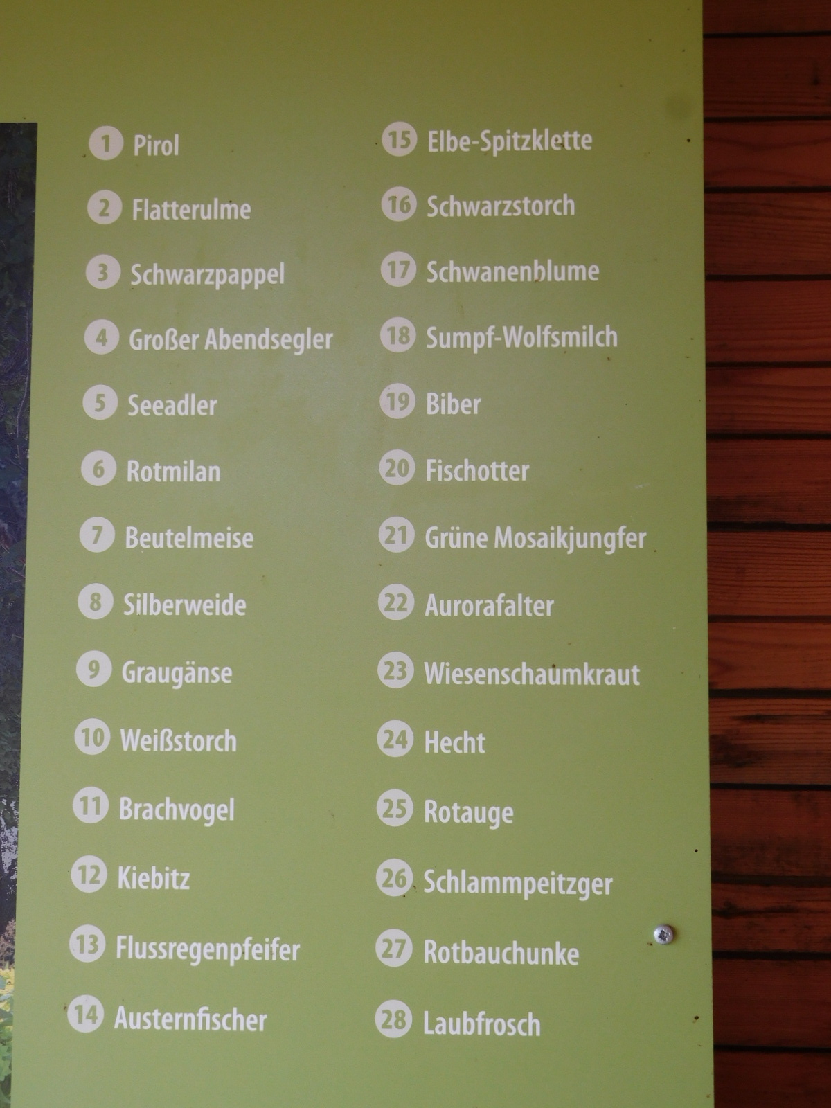 Out of Havelburg we basically rode the dike for the rest of the day. Along the way there were a few rest stops, usually featuring informative signage. I liked one that pictured some of the region's prominent wildlife, giving the names in German. We especially like the Biber (#19) because as Canadians we have a special affinity for beavers.
